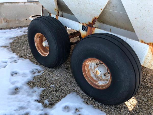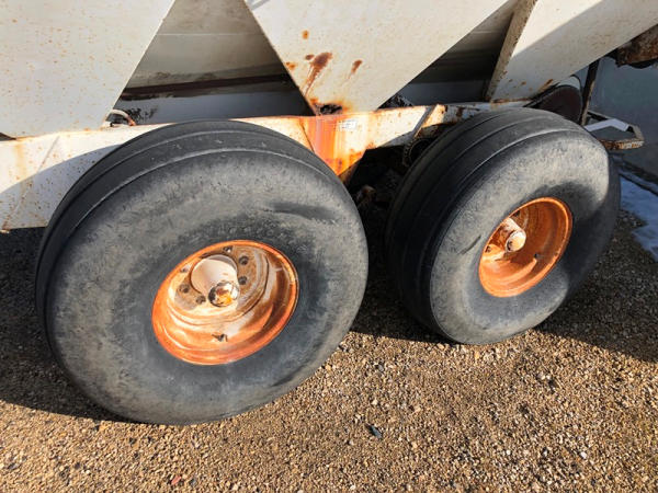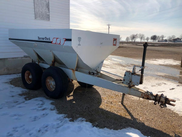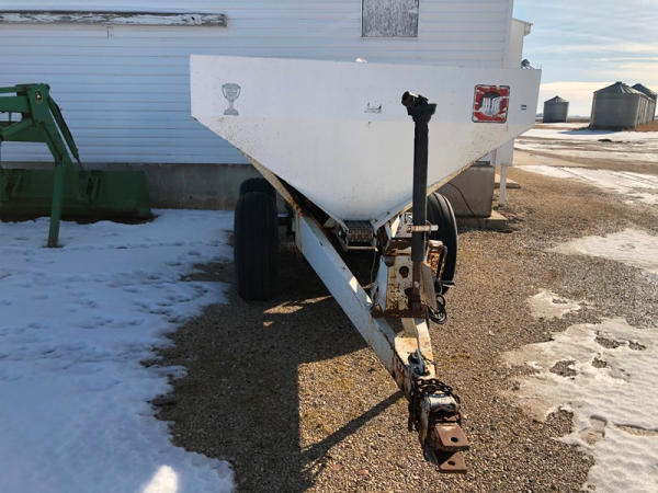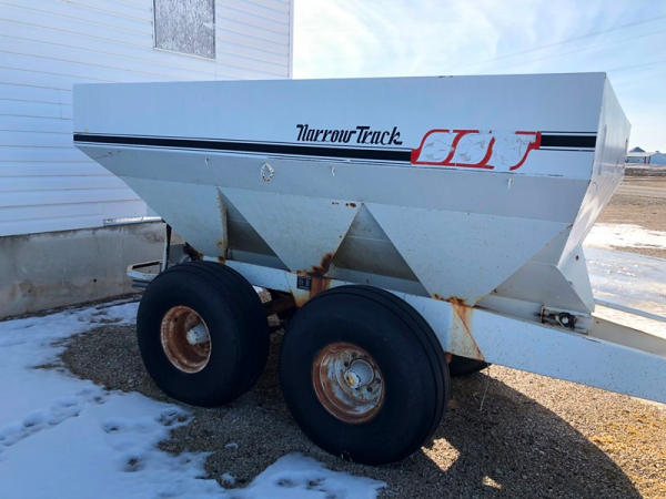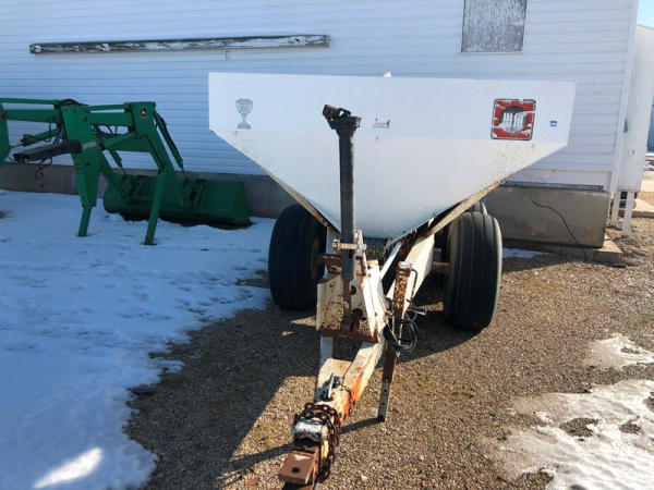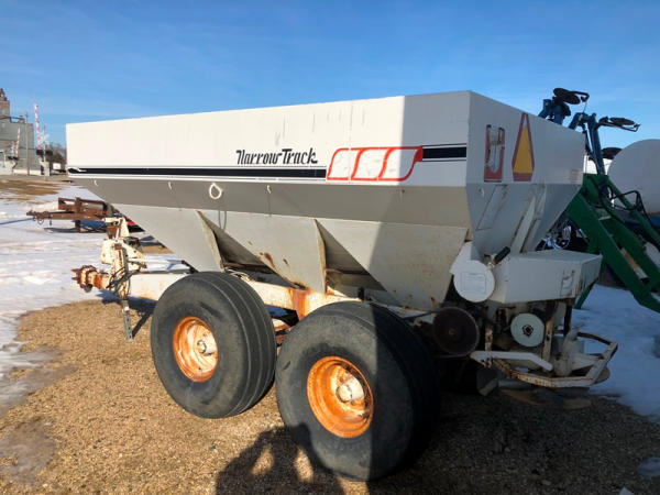 Willmar Narrow Track Dry Spreader (NP1412), dual spinners, 540 PTO, hydraulic, tandem axle, 16.5L-16.1 flotation tires.