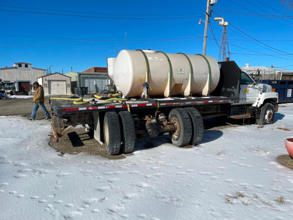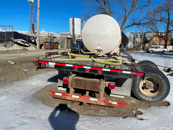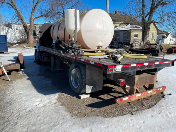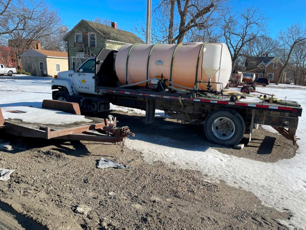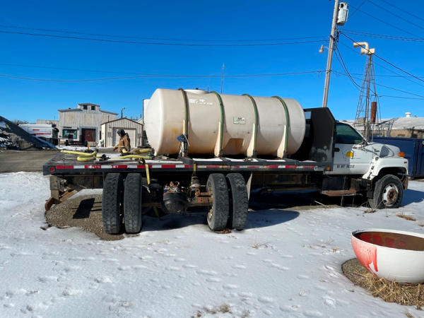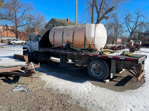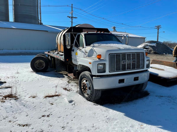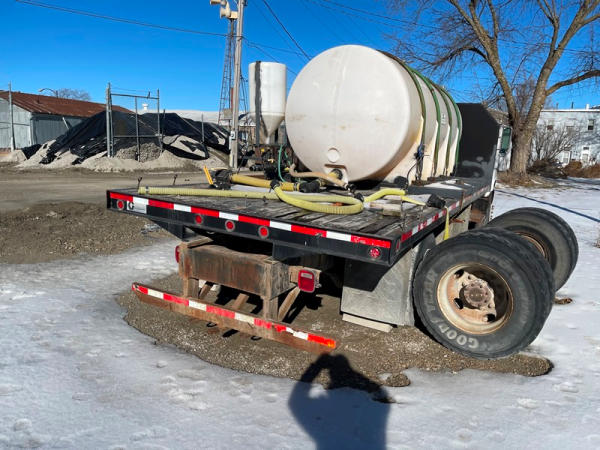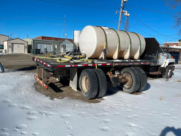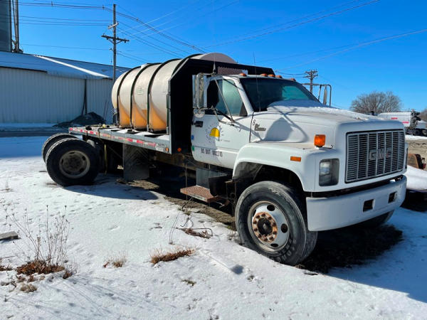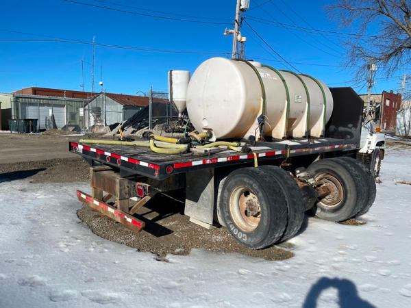 1997 GMC C7500 Liquid Tender Truck (DPA0512, Unit TT57), Cat diesel engine, 6 speed transmission, air conditioning, heat, Am/Fm radio, single axle, flatbed, 1700 gallon poly liquid nurse tank, poly chemical inductor, Honda gas engine, pump, 11R22.5 tires, shows 233,377 miles.