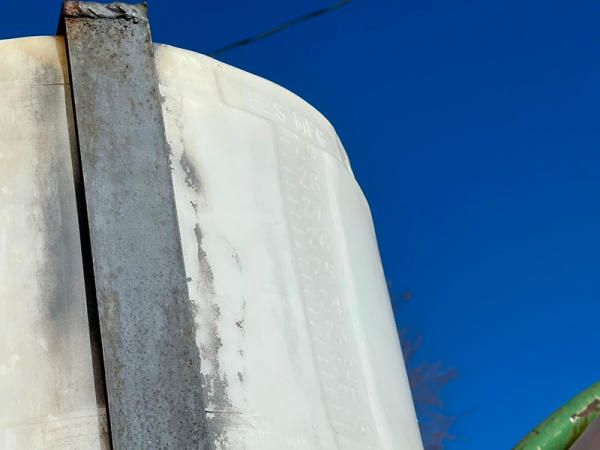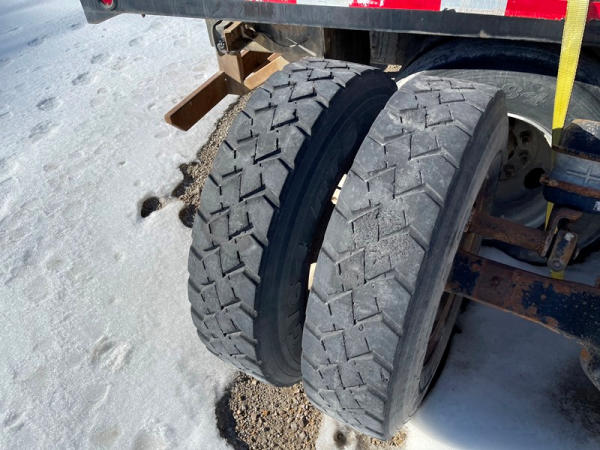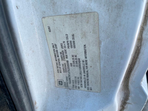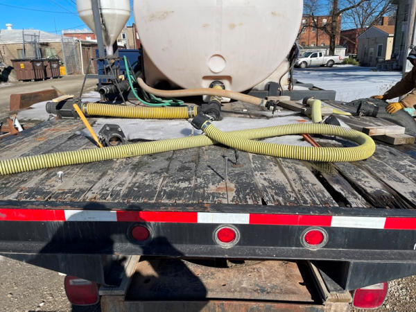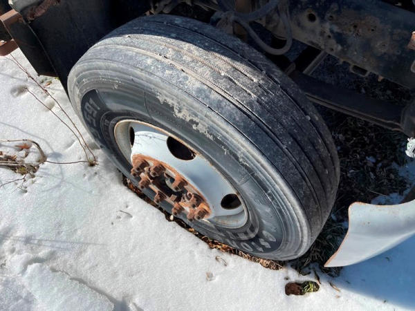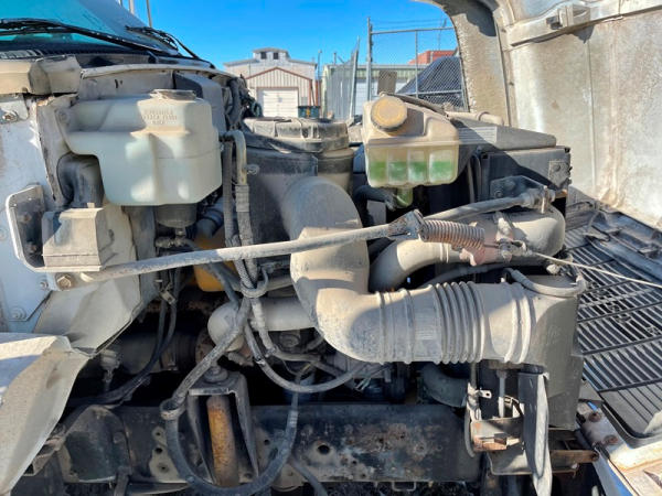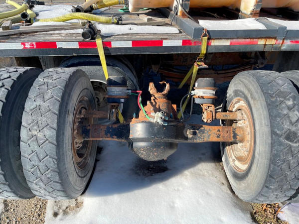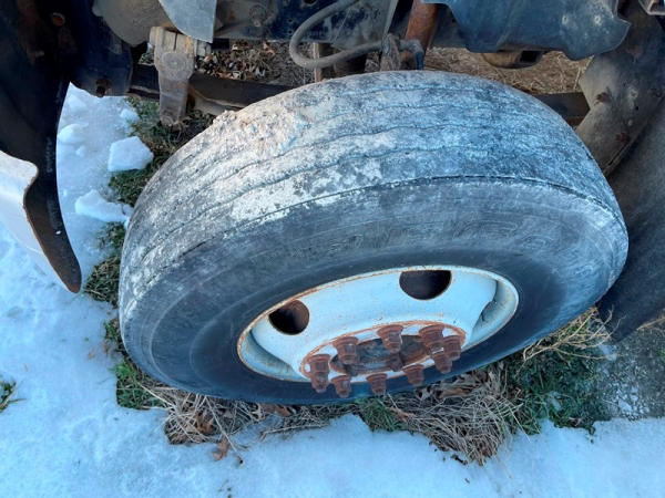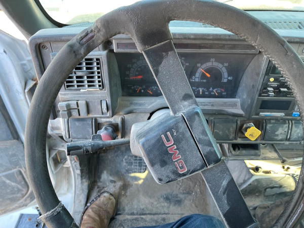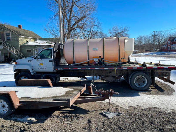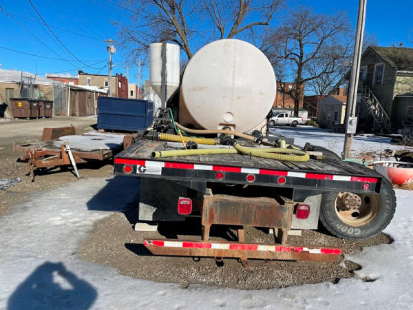 1997 GMC C7500 Liquid Tender Truck (DPA0512, Unit TT57), Cat diesel engine, 6 speed transmission, air conditioning, heat, Am/Fm radio, single axle, flatbed, 1700 gallon poly liquid nurse tank, poly chemical inductor, Honda gas engine, pump, 11R22.5 tires, shows 233,377 miles.
