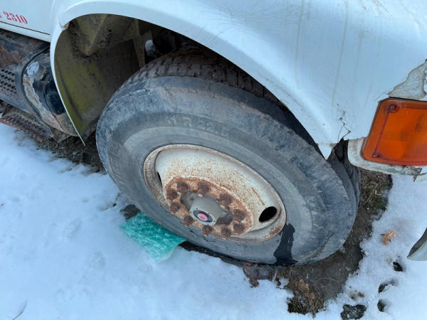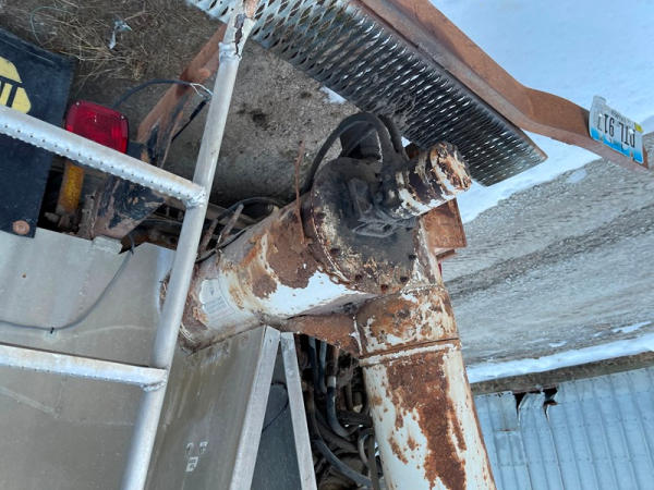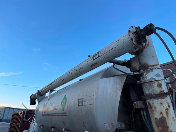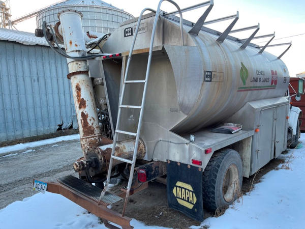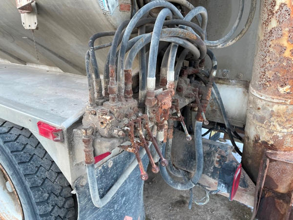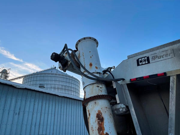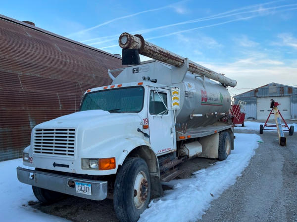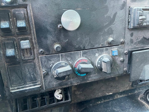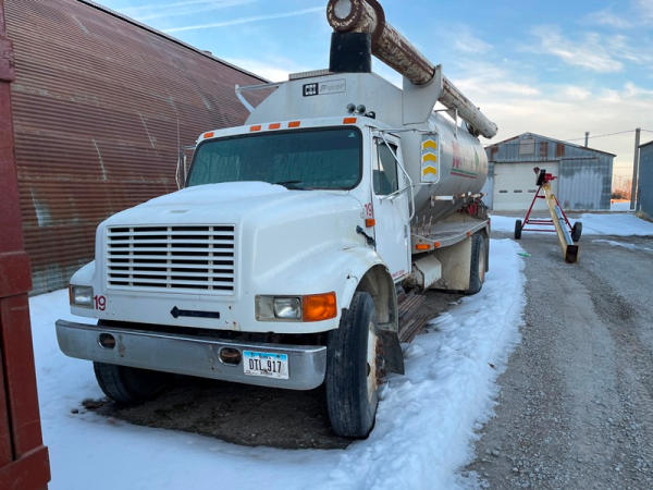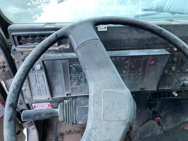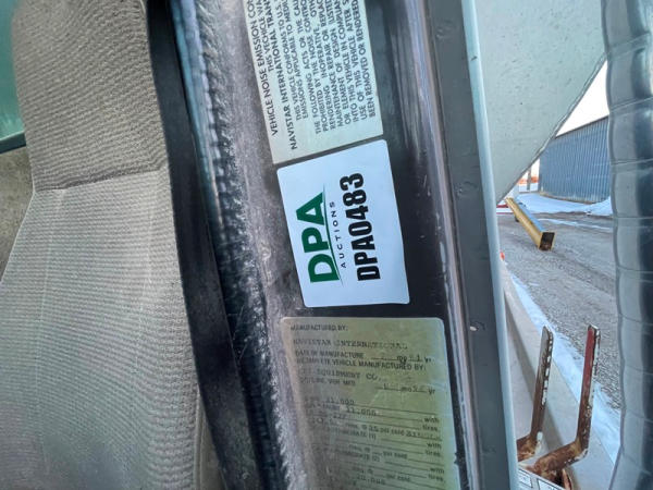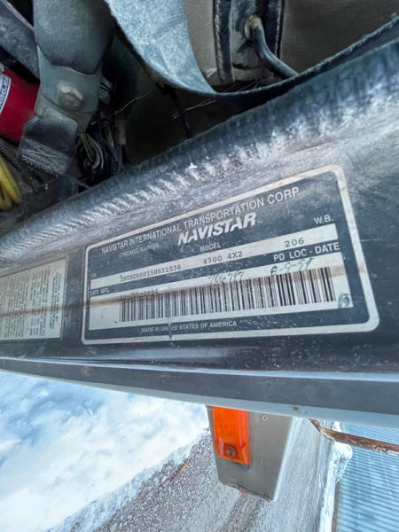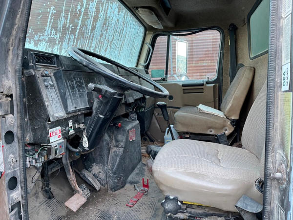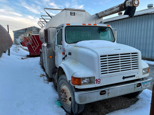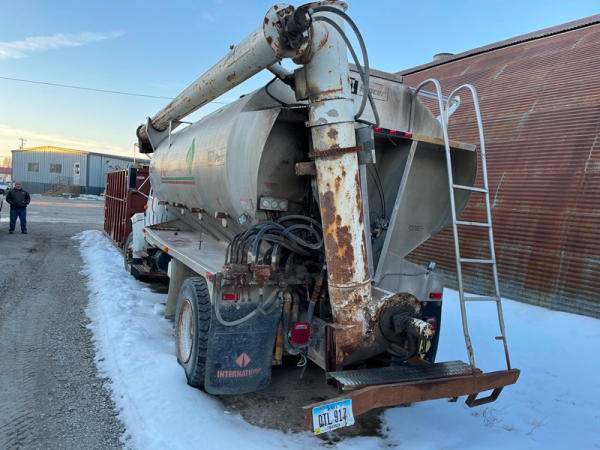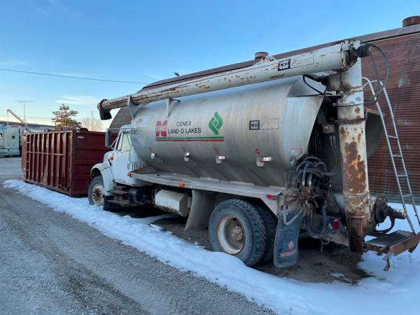 1995 IHC 4700 Feed Truck (DPA0483, Unit FT150), diesel engine, 6 Plus speed transmission, air conditioning, heat, Am/Fm CD radio, single axle, CEI Pacer 9 ton 4 compartment aluminum feed body, overhead auger system, 11R22.5 tires, shows 362,804 miles.