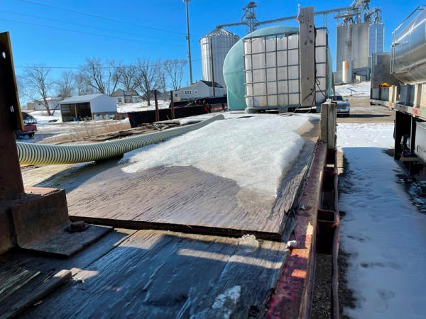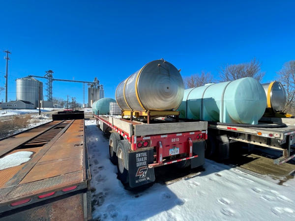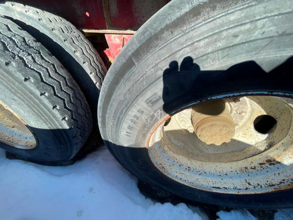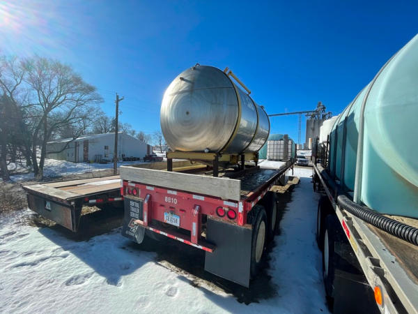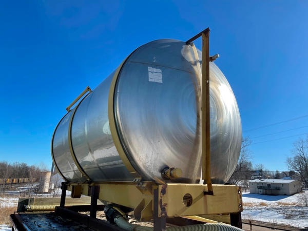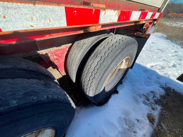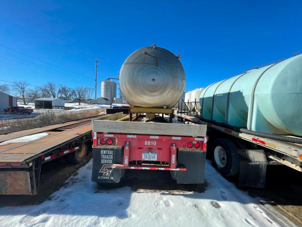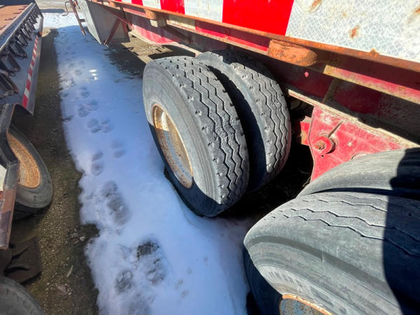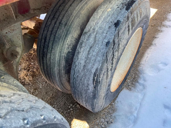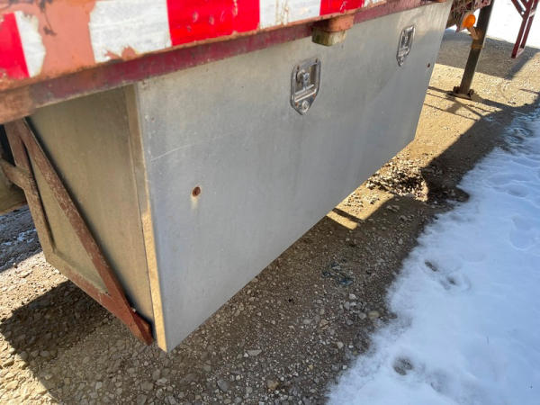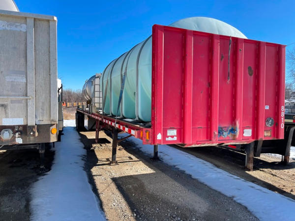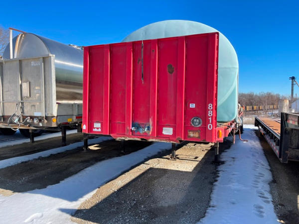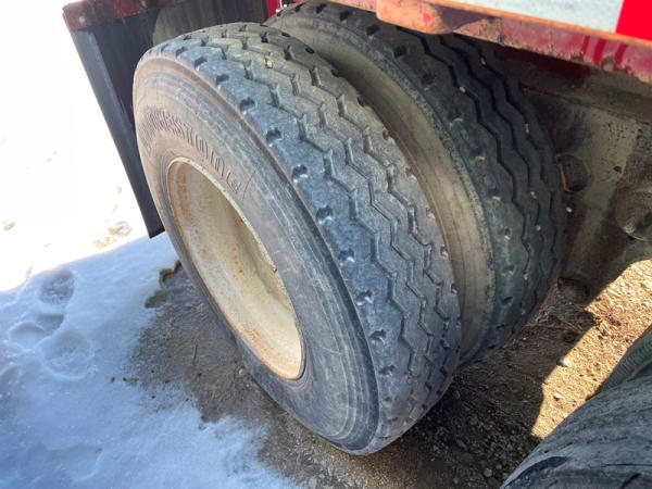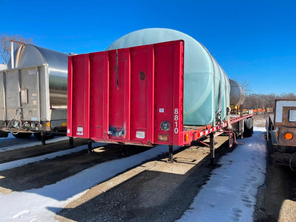 1988 Freuhauf Flatbed Liquid Trailer (DPA0515, Unit AT08), 1988 Freuhauf flatbed trailer, wood deck, headache rack, 2550 gallon poly liquid nurse tank, 1,600 gallon stainless steel liquid nurse tank, aluminum storage box, tandem axle, 11R22.5 tires.