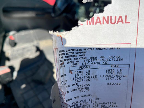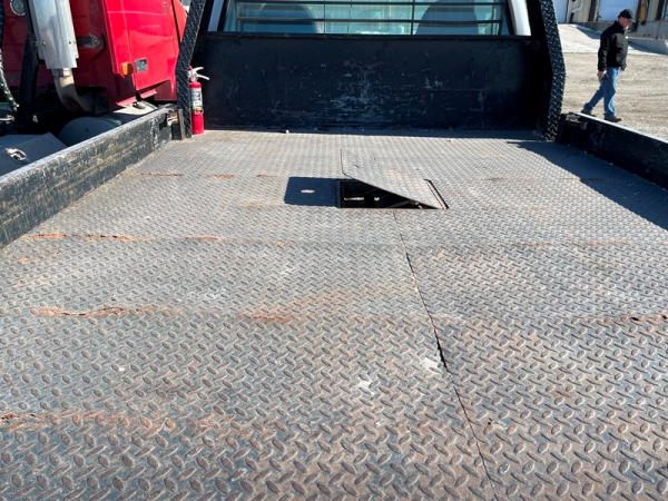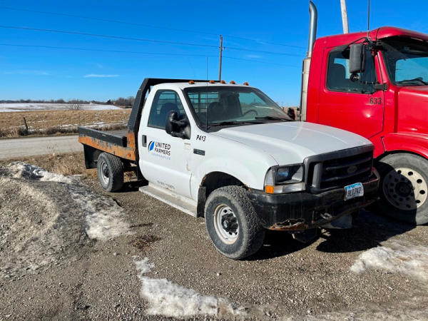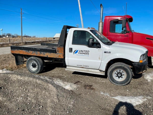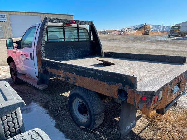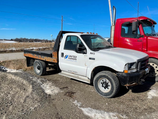 2002 Ford F-350 Flatbed Truck (DPA0519, Unit P413), 4x4, Triton 5.4L gas engine, automatic transmission, air conditioning, heat, Am/Fm radio, steel flatbed, headache rack, running boards, 5th wheel hitch, LT265/75R16 tires.