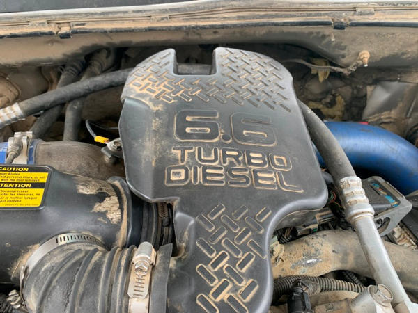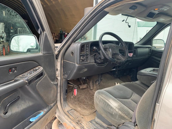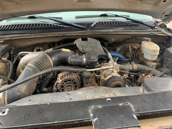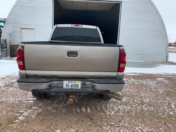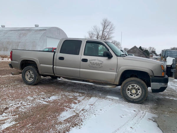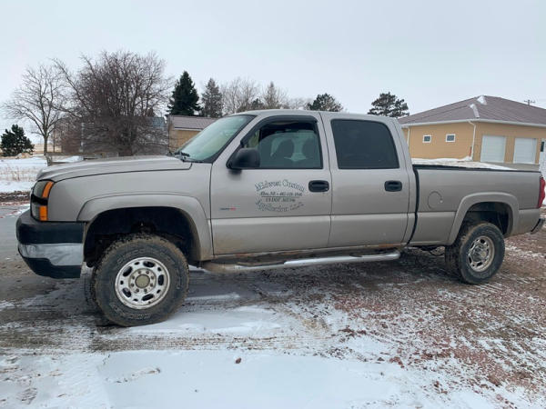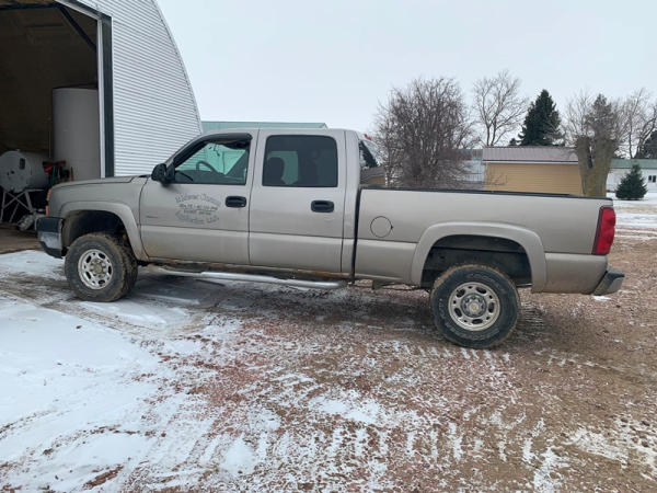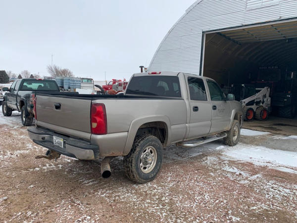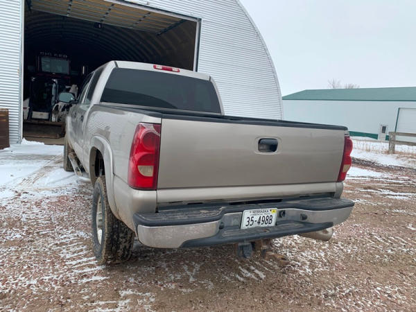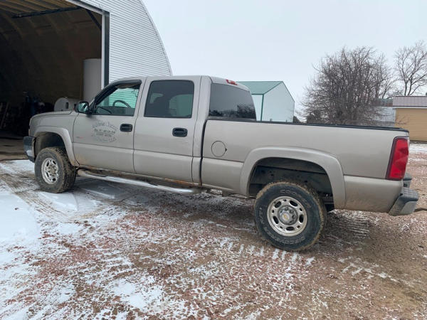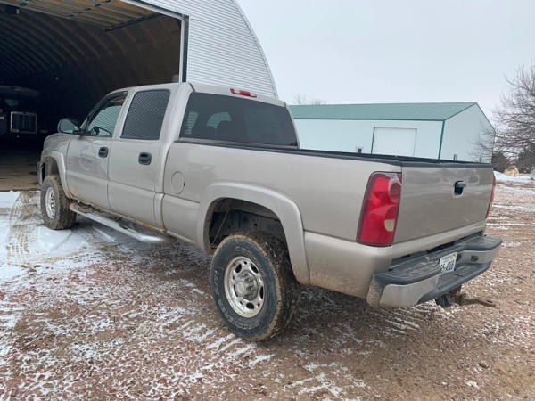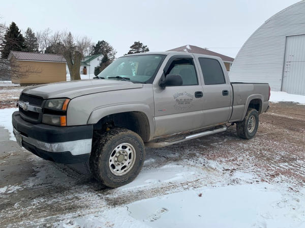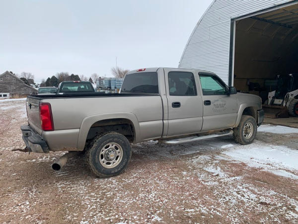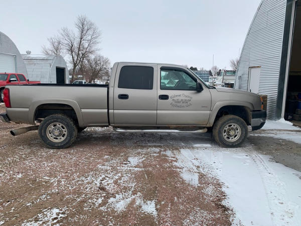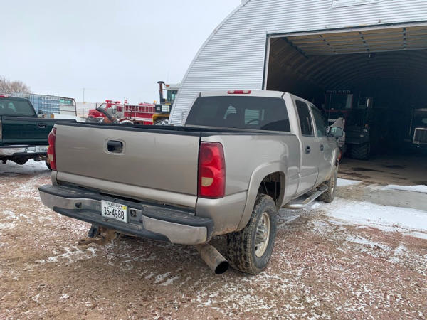 2004 Chevy 2500 Pickup (DR7625), Dura Max diesel engine, automatic transmission, crew cab, 4X4, rear receiver hitch, chrome nerf bars, spray bed liner, AM/FM CD radio, power windows & locks, heat/air conditioning, 265/75R16 tires, shows 203,221 miles.