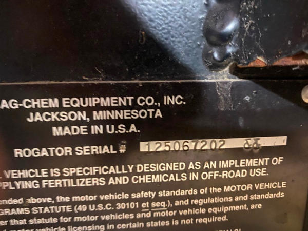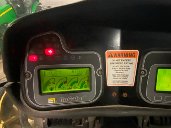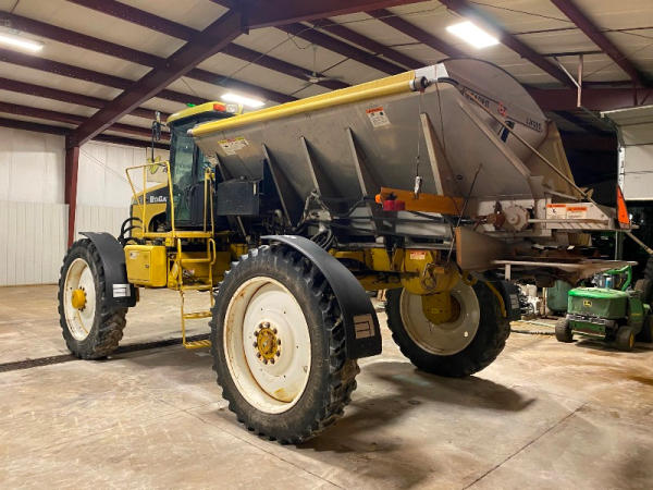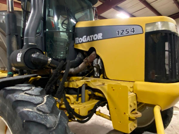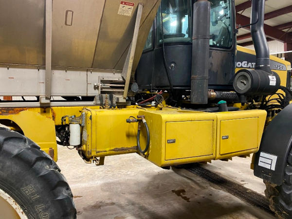 2002 RoGator 1254 Dry Machine (DR7652), diesel engine, hydrostatic transmission, heat, air conditioning, Am/Fm radio, New Leader L3020G4 stainless steel dry spreader box, dual spinners, hydraulic, roll tarp, row crop tires, fenders, Raven GPS, Raven Envizio Pro, shows 55,107 miles, shows 5,455 miles.