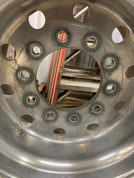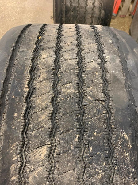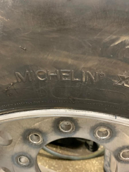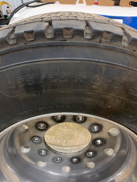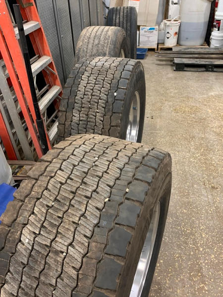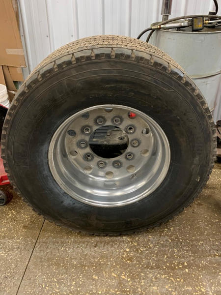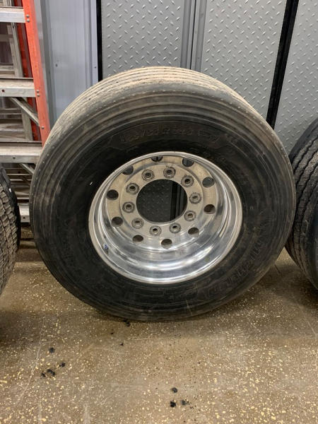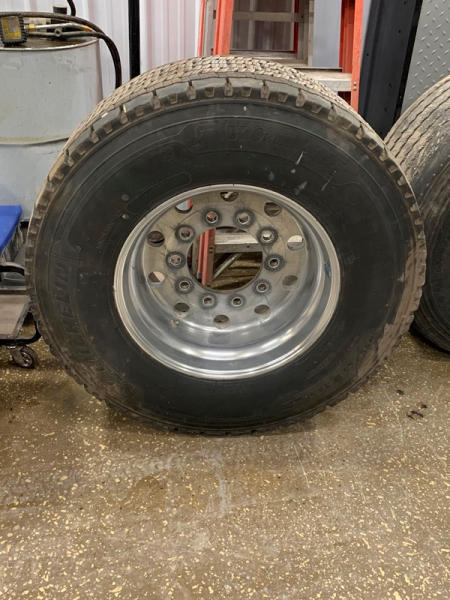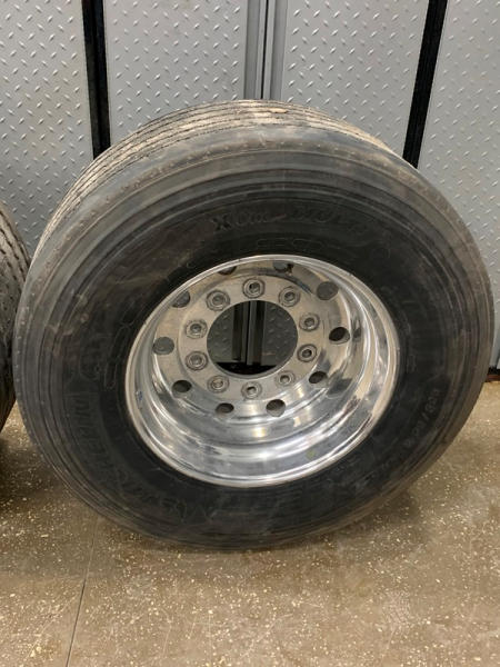 (4) Super Single Tires (LD721), 2 pairs of super single tires and aluminum rims, 455/55R22.5 tires virgin rubber, 10 bolt hub pattern.