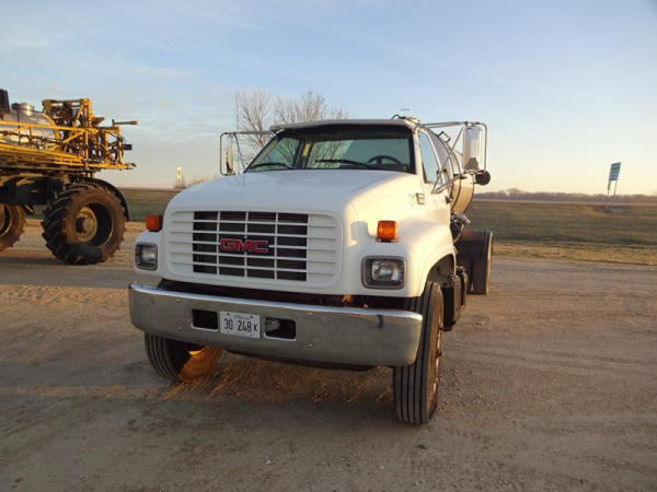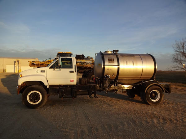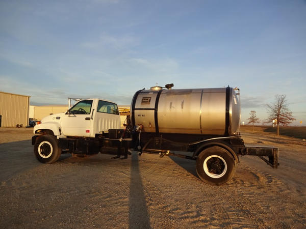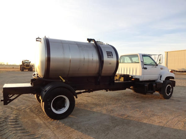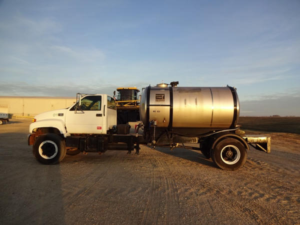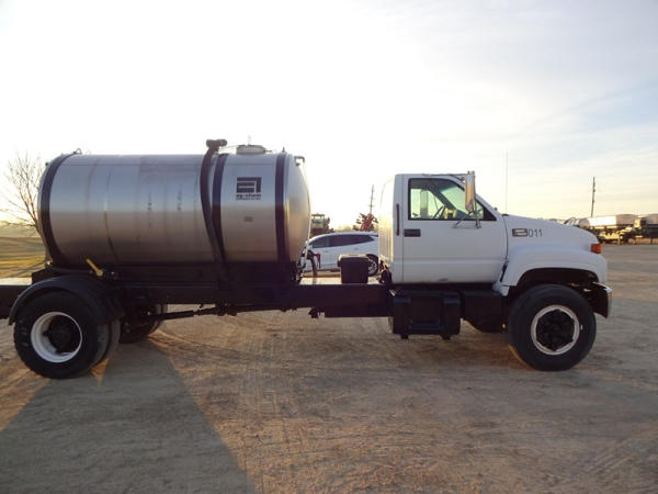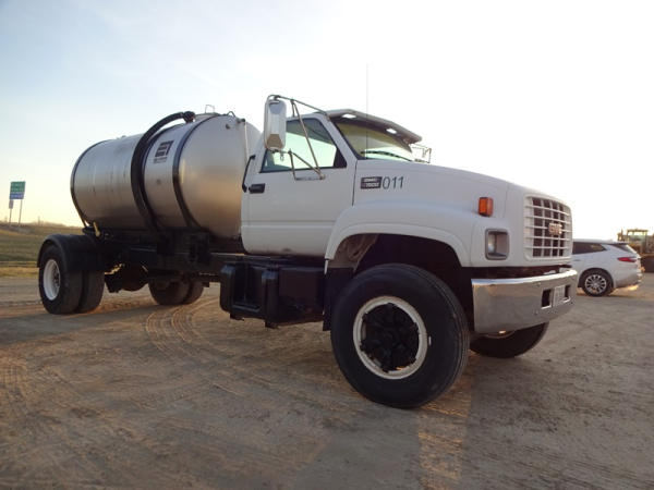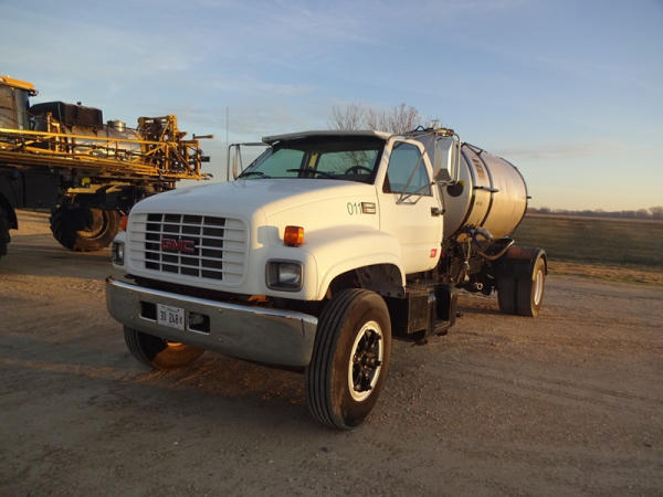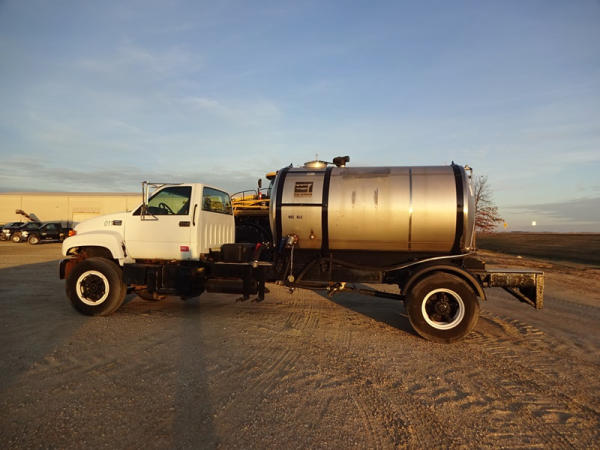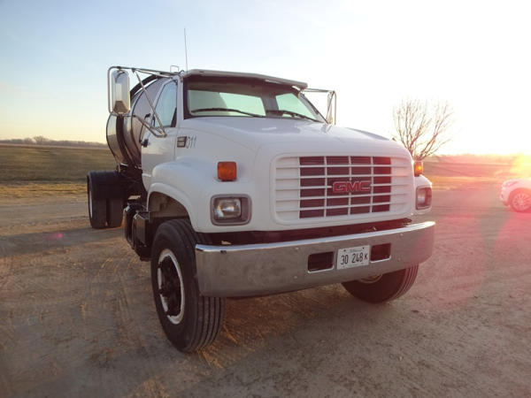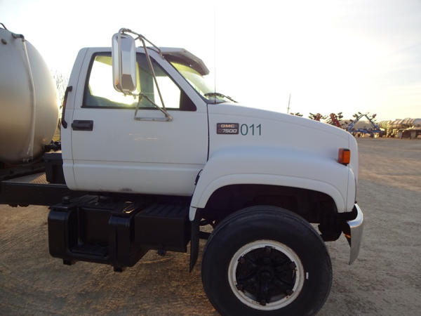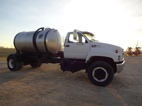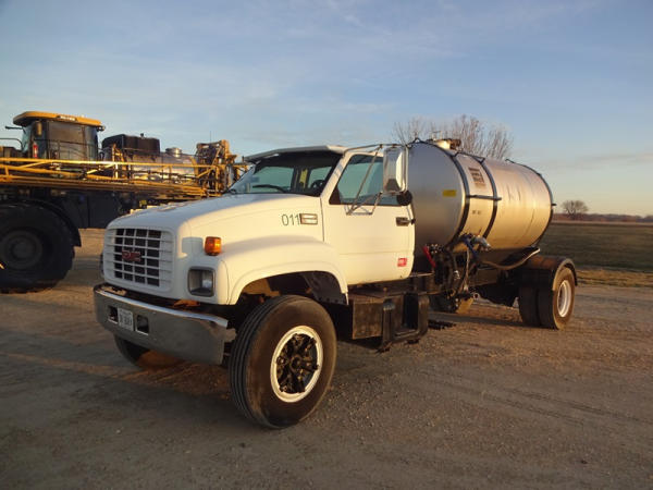 1997 GMC C7500 Liquid Nurse Truck (PZ6069, Unit 37011), Cat 3116 diesel engine, 6 speed transmission, air conditioning, heat, Am/Fm radio, single axle, 2003 Mid State Tank 1800 gallon stainless steel liquid nurse tank, Honda gas engine, Flomax pump, 11R22.5 tires, shows 71,399 miles.