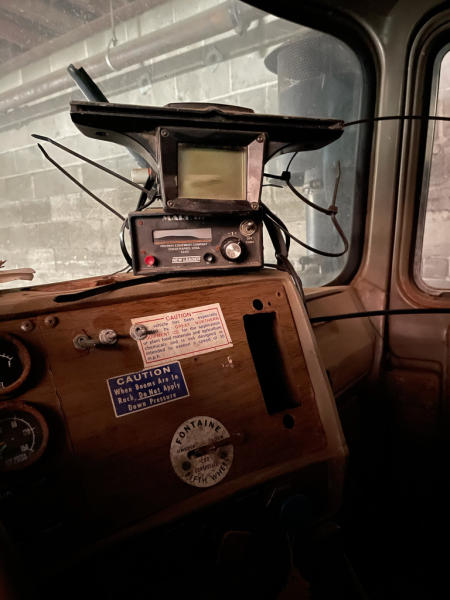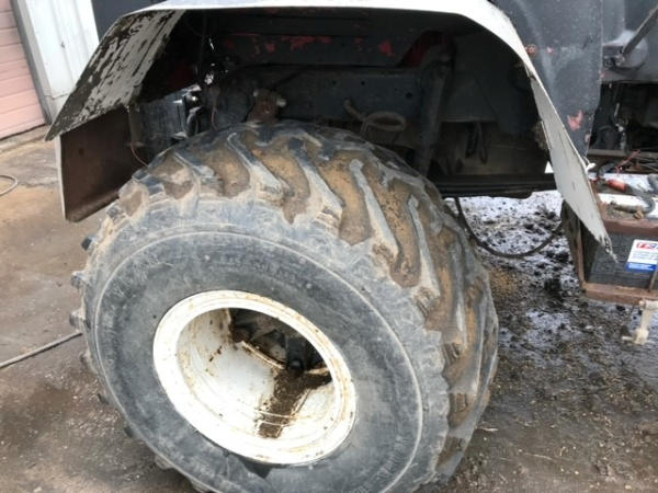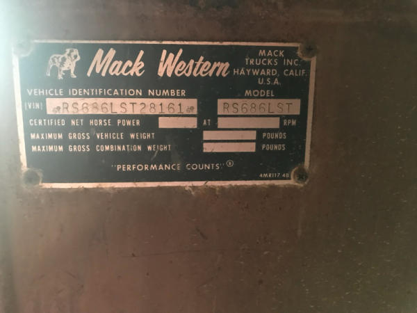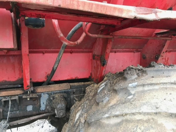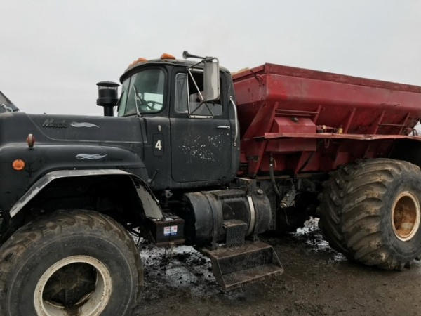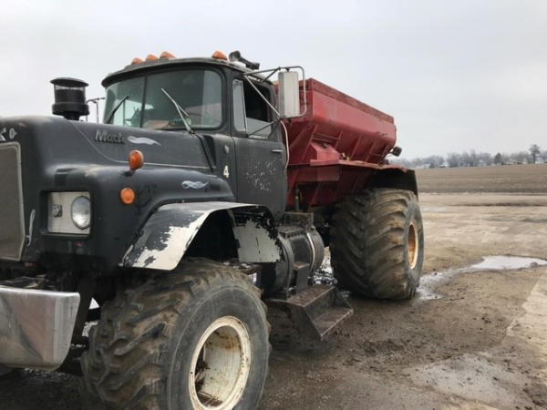 1977 Mack Spreader Truck (LT203), 6 cylinder Mack engine, manual transmission, air brakes, Mach III controller, light bar guidance, Hiway mild steel box, chain conveyor, front tires are 48x25.00x20, rear tires are 66x43.00x25.