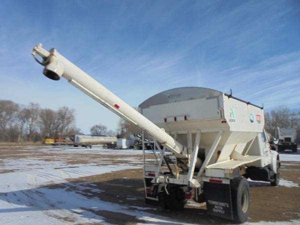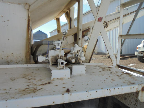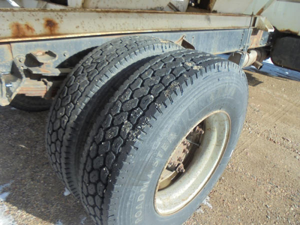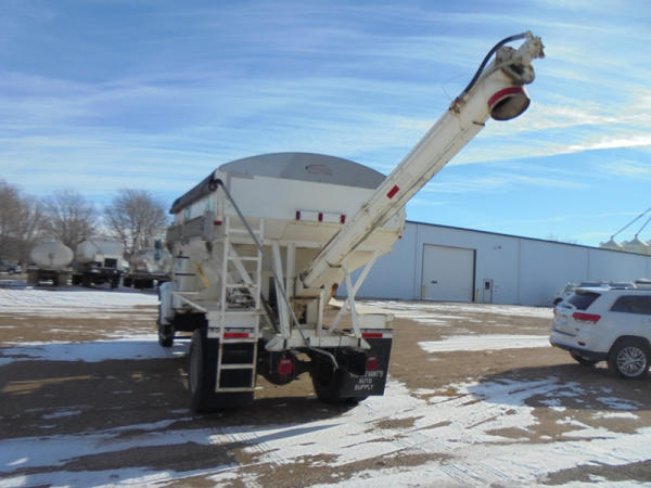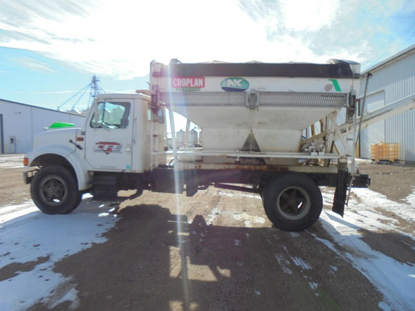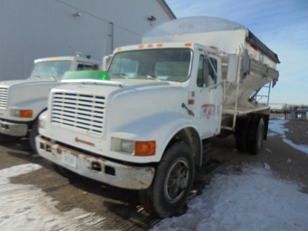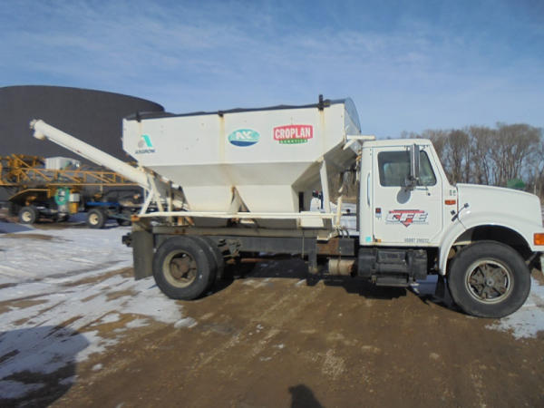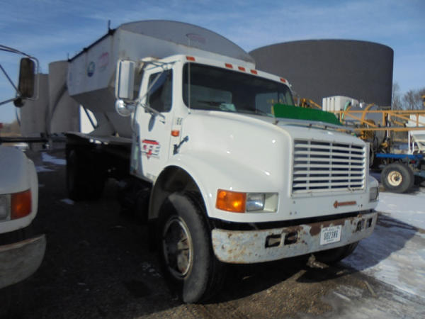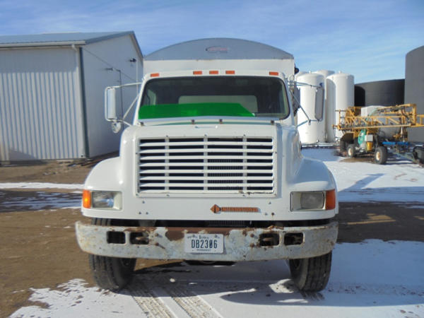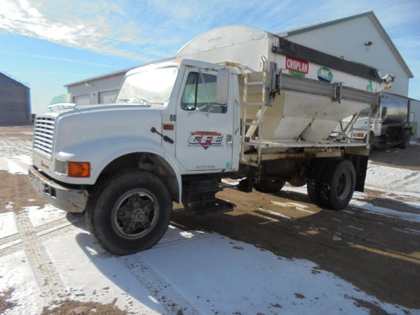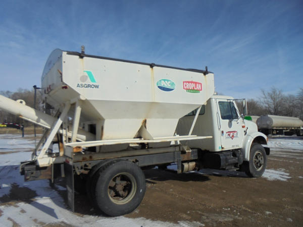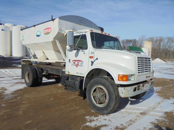 1991 IHC 4700 Tender Truck Unit #9166 (CP1778), International diesel engine, 6 speed transmission, single axle, spring suspension, 10 ton stainless steel box, 2 compartment, rear discharge, roll tarp, shows 82,046 miles.