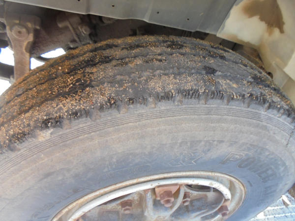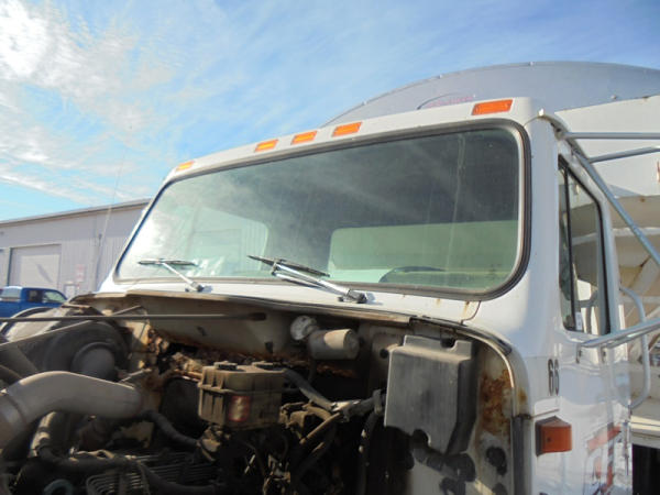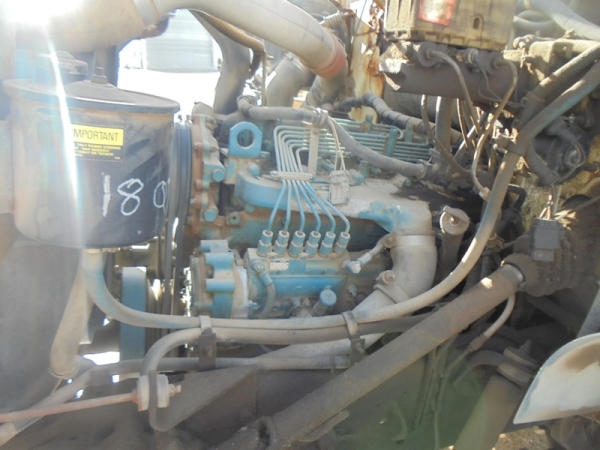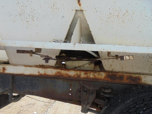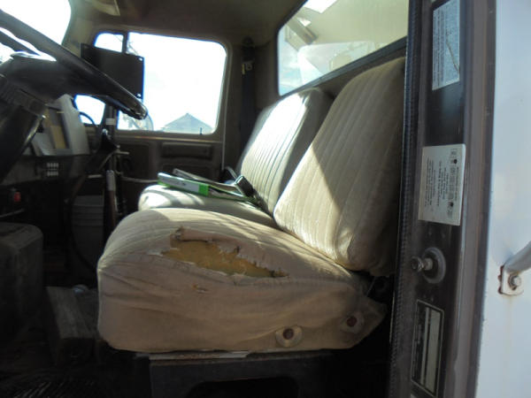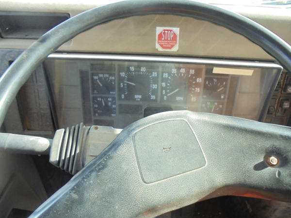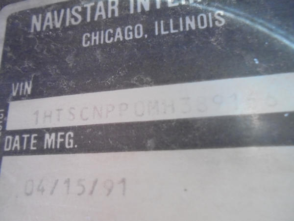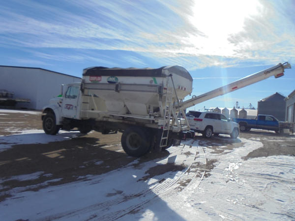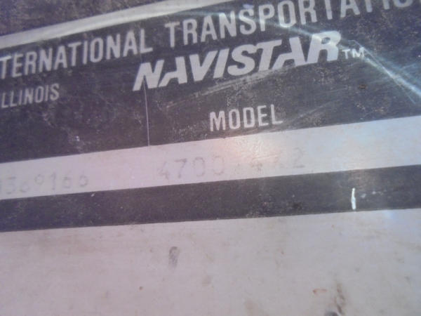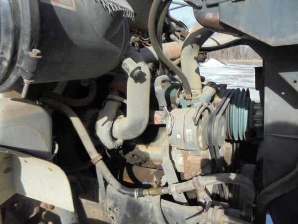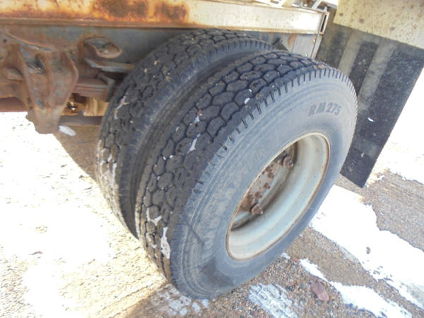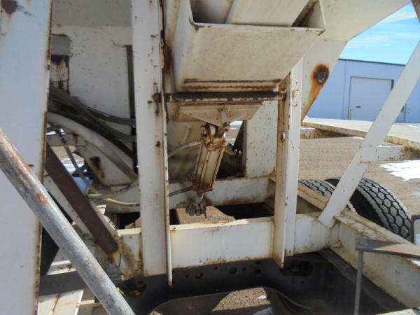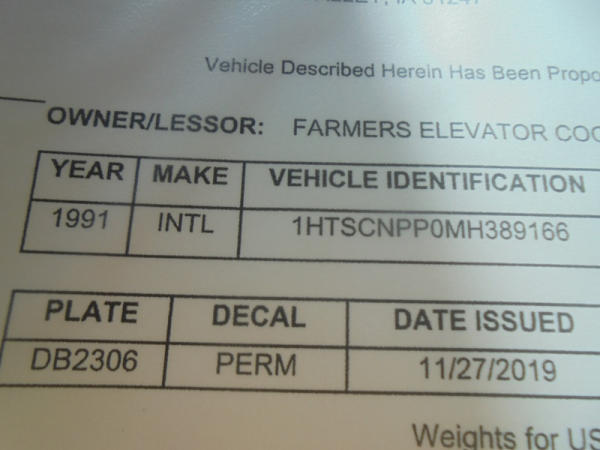 1991 IHC 4700 Tender Truck Unit #9166 (CP1778), International diesel engine, 6 speed transmission, single axle, spring suspension, 10 ton stainless steel box, 2 compartment, rear discharge, roll tarp, shows 82,046 miles.