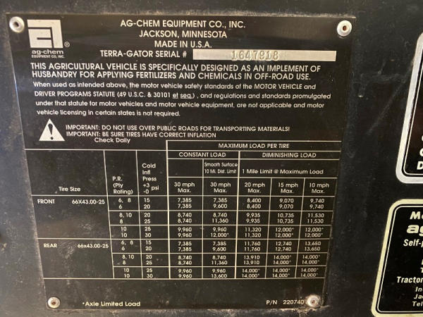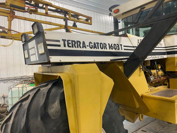 1998 Terra Gator 1603T Liquid Floater (DL1392), 3208 Caterpillar engine, 10 speed manual transmission, heat and A/C, radio, 1,500 gallon stainless steel tank, 60/80ft boom with 60 inch nozzle spacing, 4 section shut offs, Raven 660 controller with Envisio mapping, foam marker with stainless steel tank, front tires about 80% tread, rear tires 20% tread, very nice one owner machine, runs excellent, well maintained with no leaks, original paint, shows 3,192 hours and 29,888 miles.