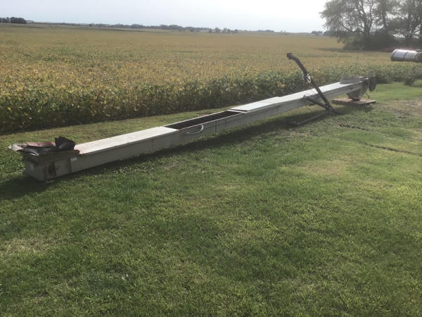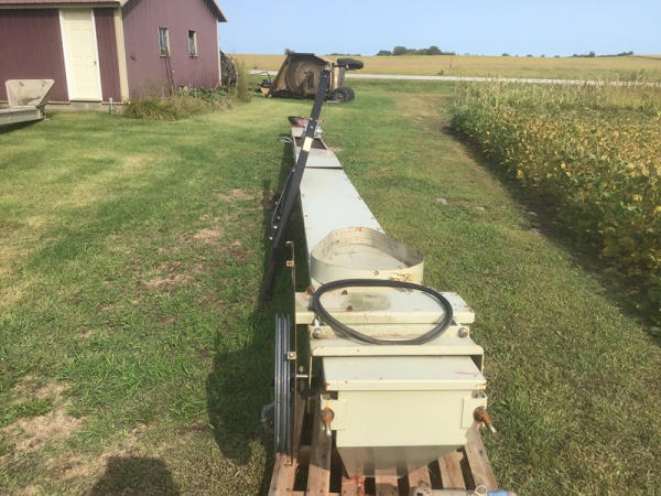 Quality Plus 1636E Seed Conveyor (NP1341), conveyor is 36' x 16", pulley speed reduction, cleated rubber belt, 24" intake hopper with telescoping frame work.