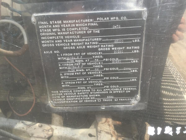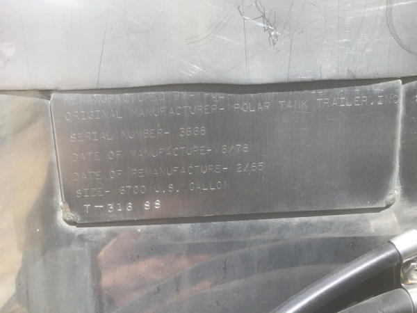1978 Polar Liquid Transport Trailer (NP1506), 6,700 gallon capacity, double conical trailer, 316 stainless steel, tandem axle, 24.5 tires, 8 aluminum wheels, GVWR 65,000 pounds.