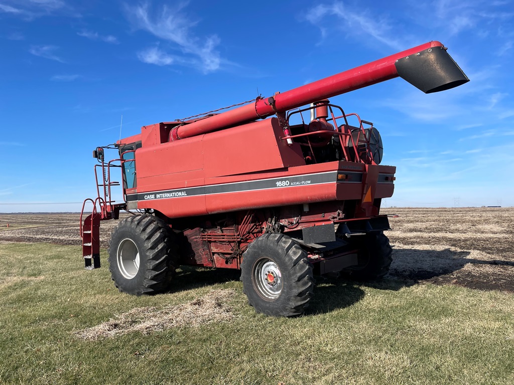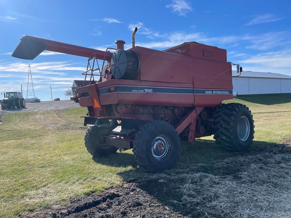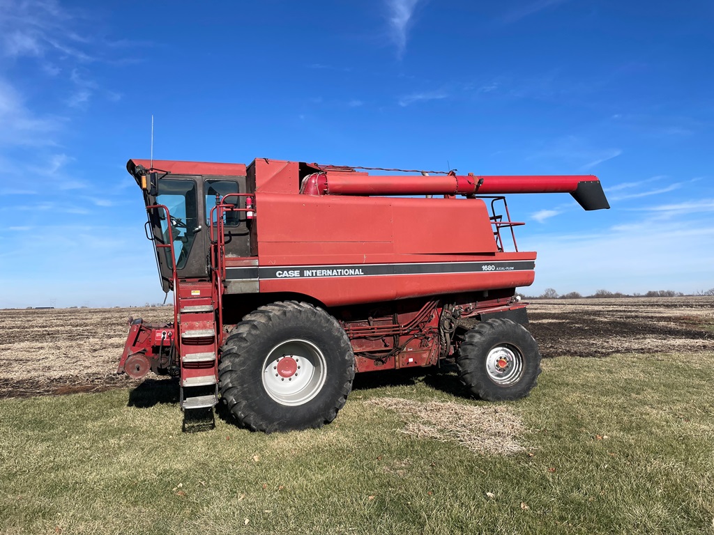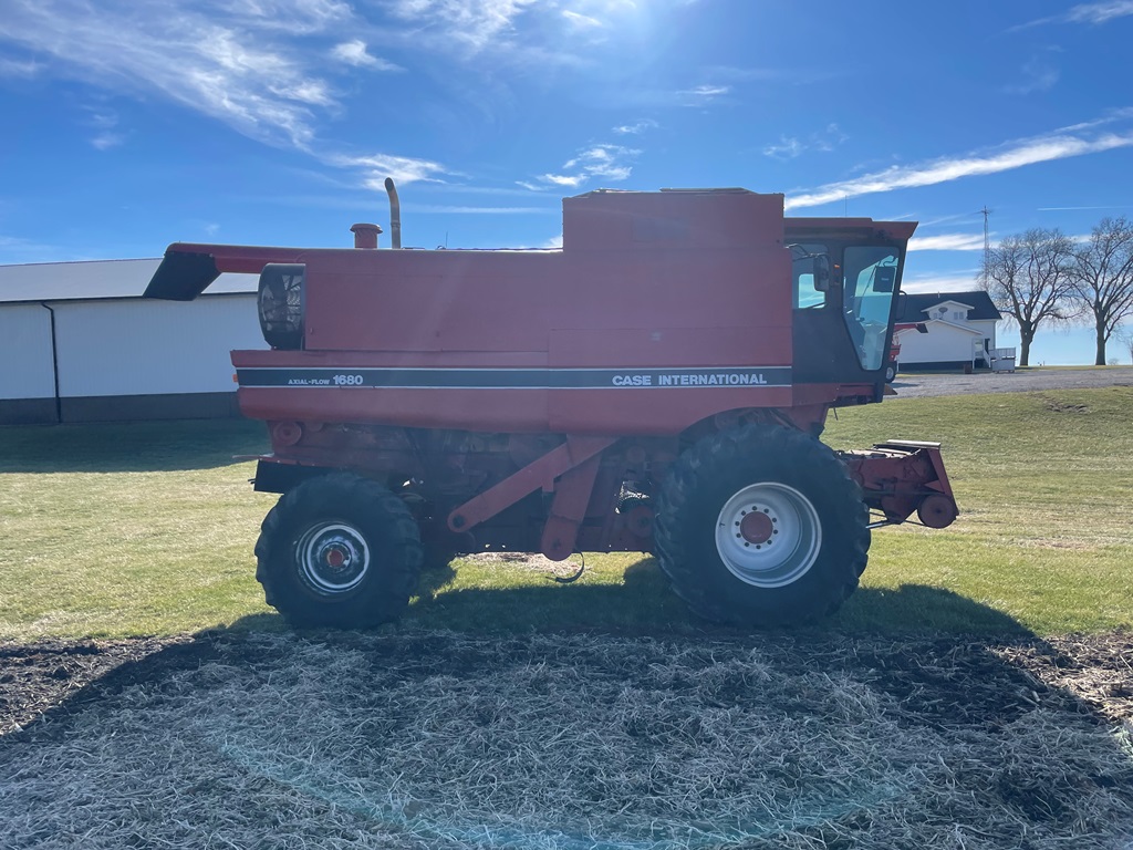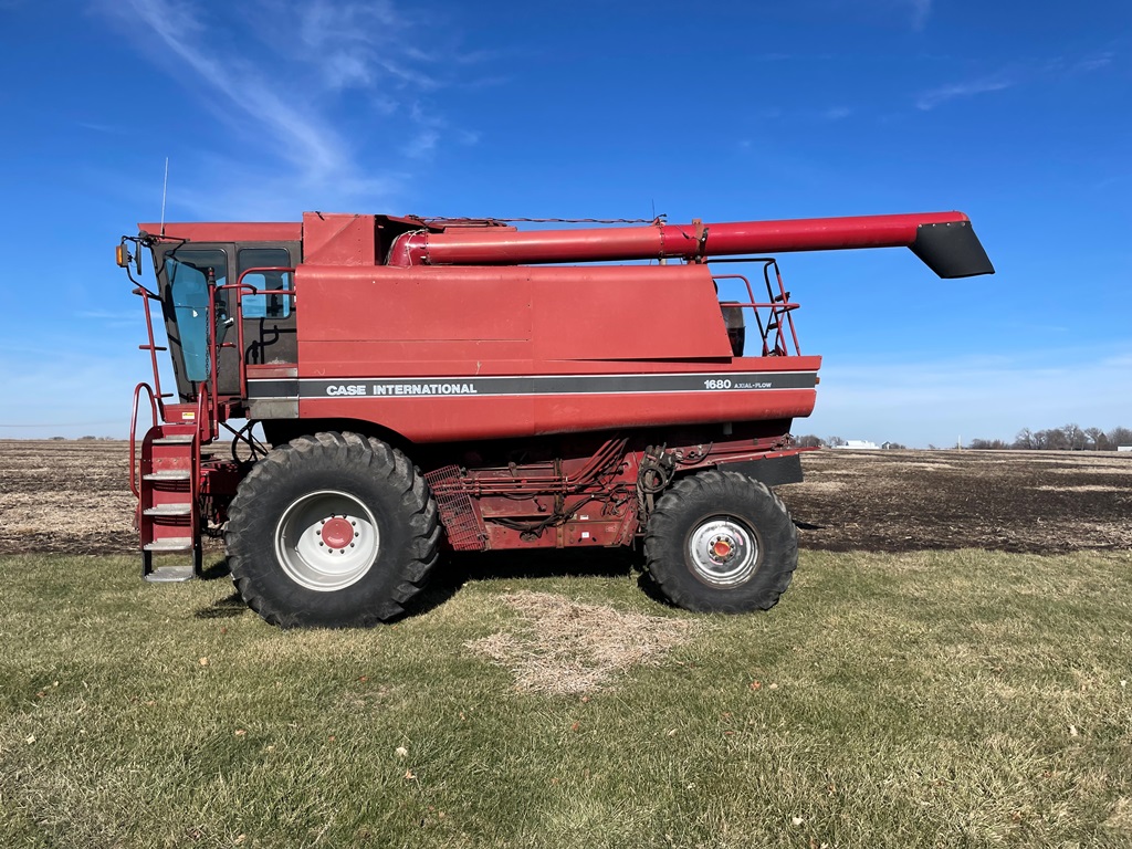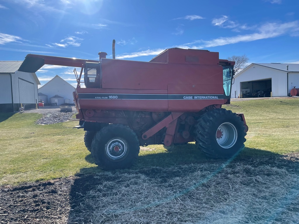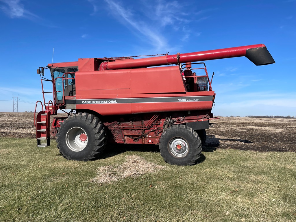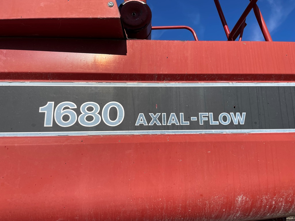 1990 CaseIH 1680 Axial-Flow 4WD Combine (GP2322), Cummins 6TA-830 - 6 cylinder diesel engine, hydrostatic transmission, 3 forward speeds, 3 reverse speeds, heat, ICE COLD air conditioning, Am/Fm radio, chopper, auto/manual reel speed, auto/manual header height, power guide wheel, Firestone 30.5L-32 front tires, Firestone 18.4-26 rear tires, 2388 ladder, approx. 5,700 engine hours.