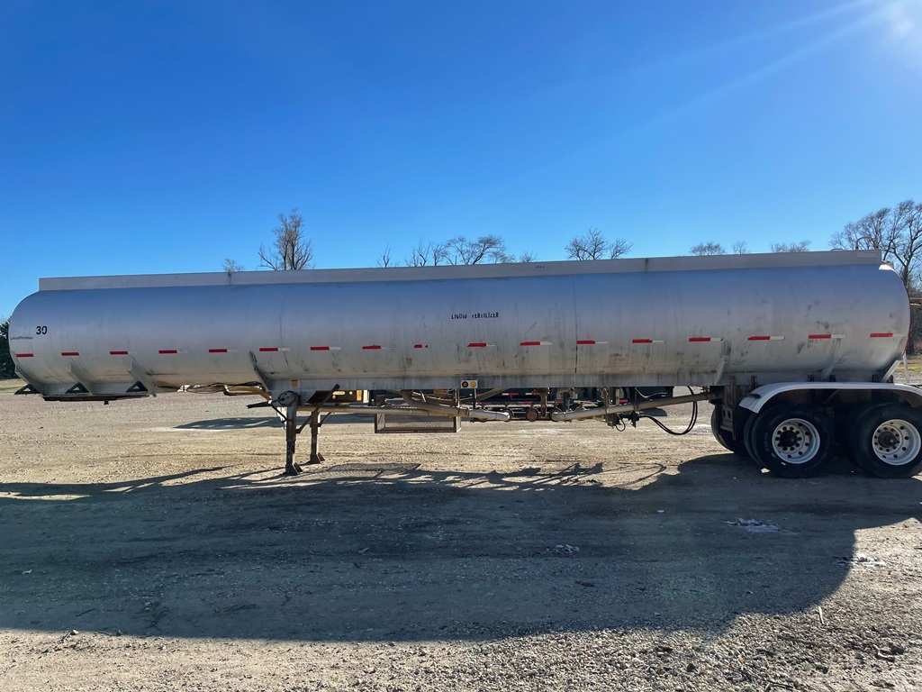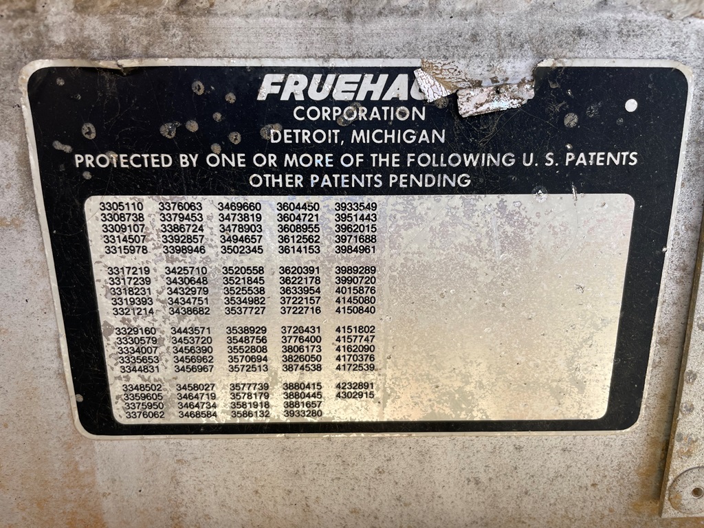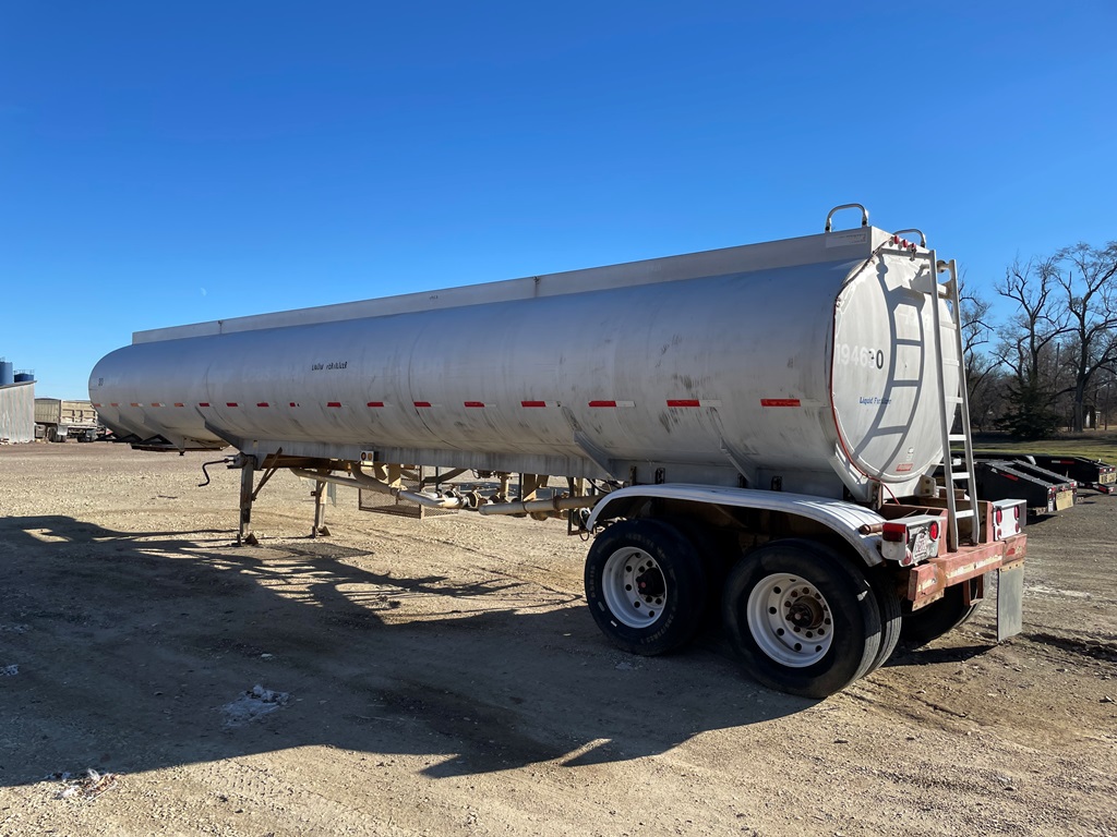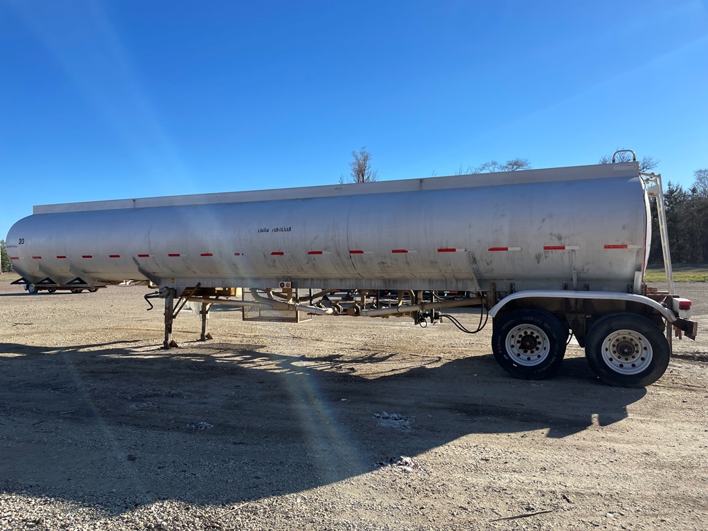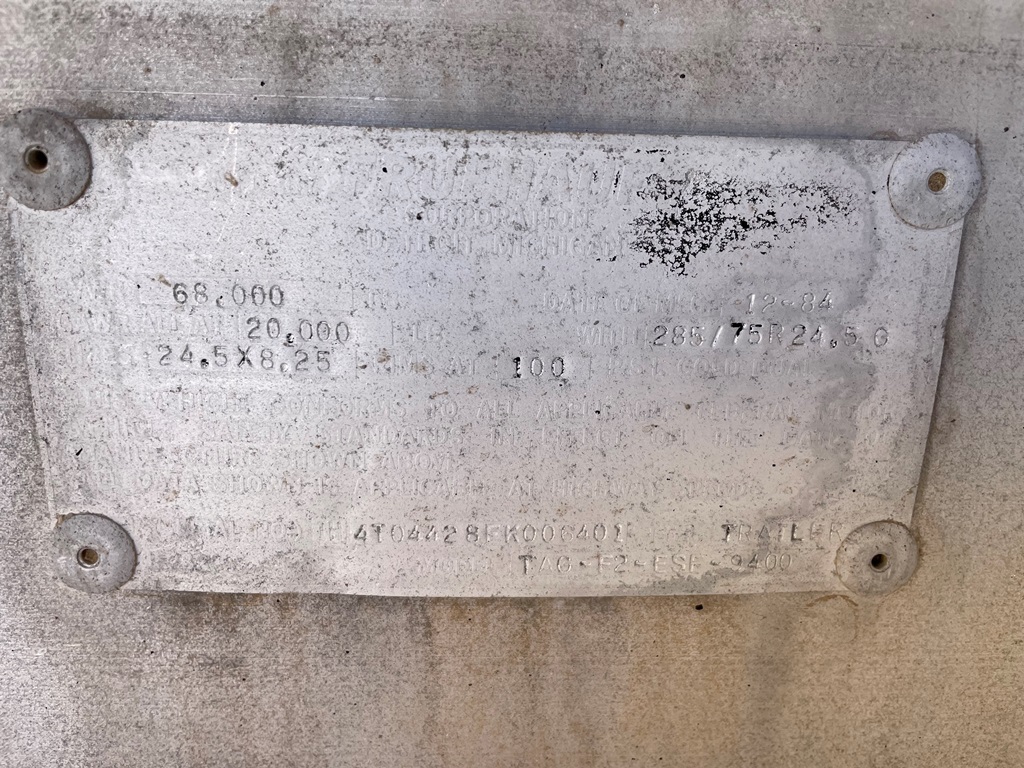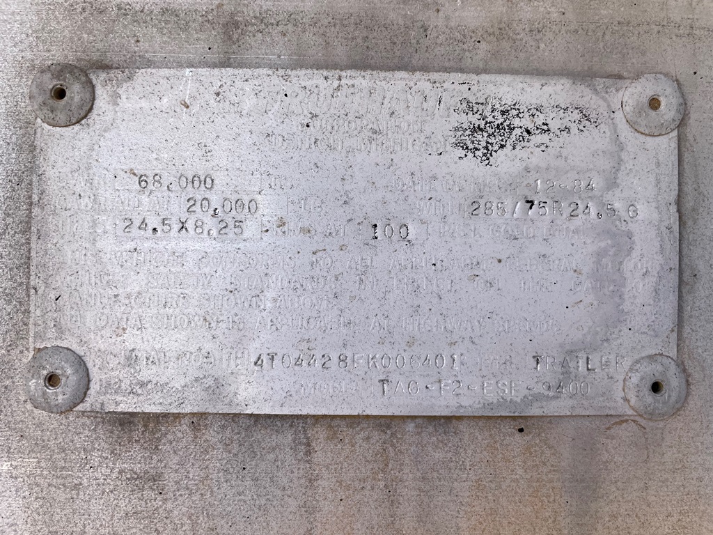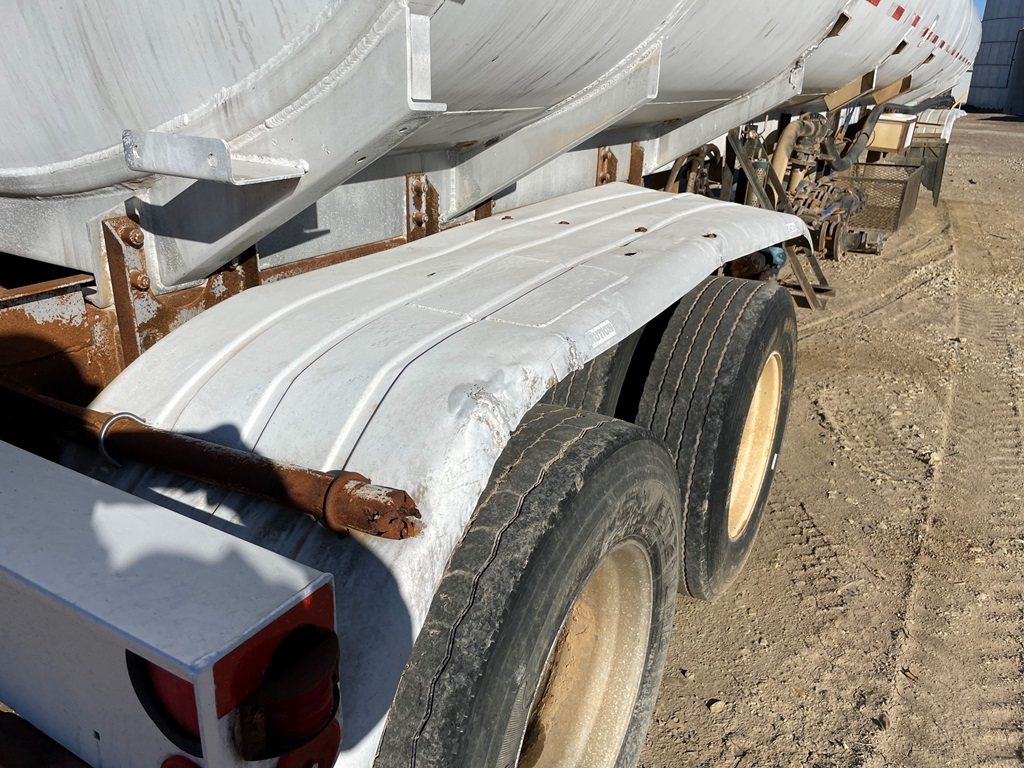 1985 Fruehauf Aluminum Liquid Transport Trailer (GP2344), Model TAG-F2-ESF-9400, 4 compartment - 9,400 gallon capacity (3075 - 1625 - 1625 - 3075), tandem axle, SHELL MATL 306-AL, Scot hydraulic pump, 295/75R22.5 tires, GVWR 68,000 pounds.