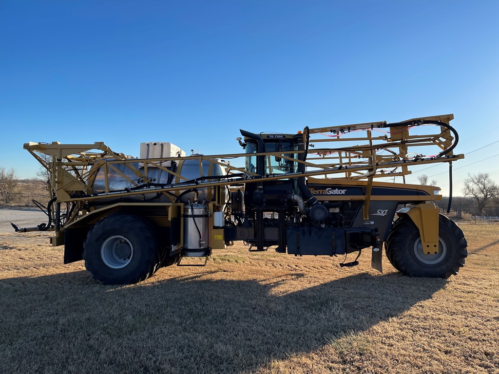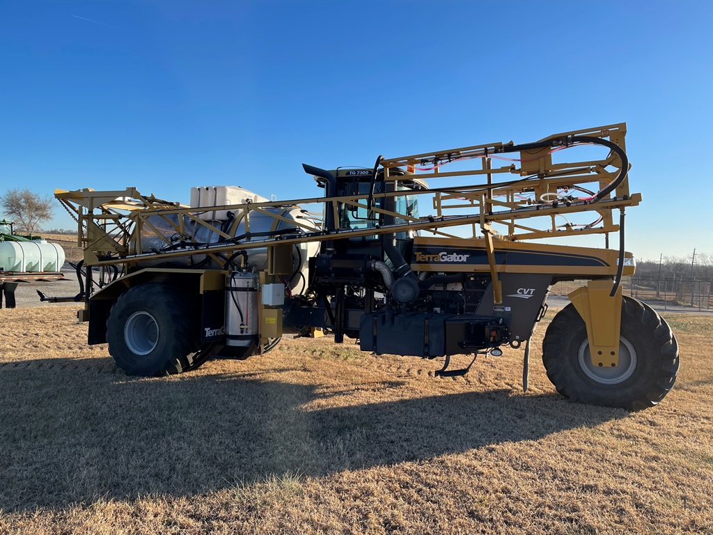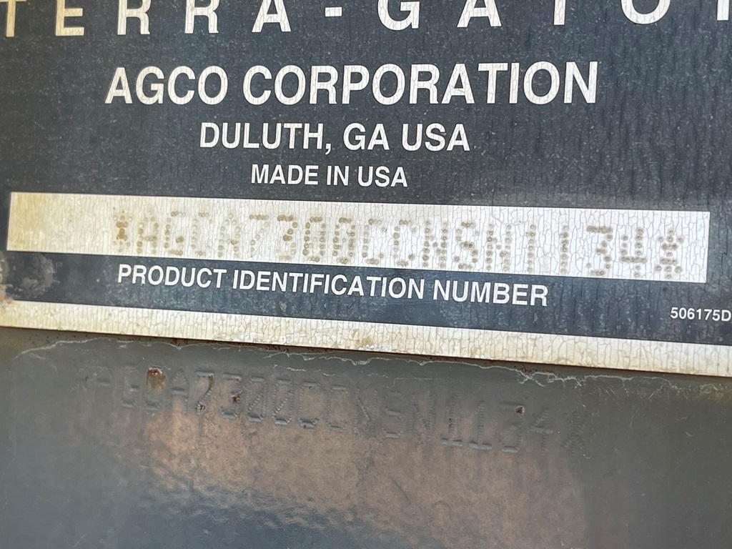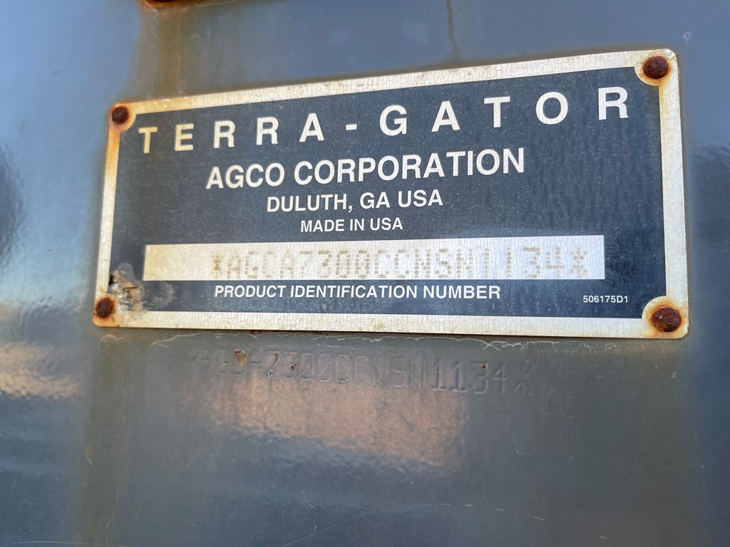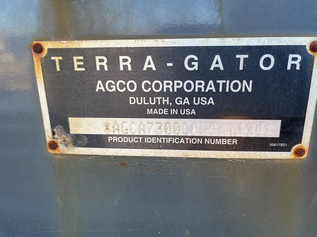 2012 Terra Gator TG7300 Liquid Floater (NP3352, Unit 115136), AGCO SisuTronic diesel engine (268KW max power), CVT transmission, heat, air conditioning, Am/Fm CD radio, air ride cab, 1,800 gallon stainless steel liquid system (S/N AGCALQ18EGNC31048), 60/80' boom, top mount poly rinse tank, 55 gallon stainless steel foam marker tank, stianless steel chemical inductor, SCOT pump, 1000/50R25 tires, Voyager backup camera, Raven GPS, Raven Viper Pro monitor, shows 1,859 hours.