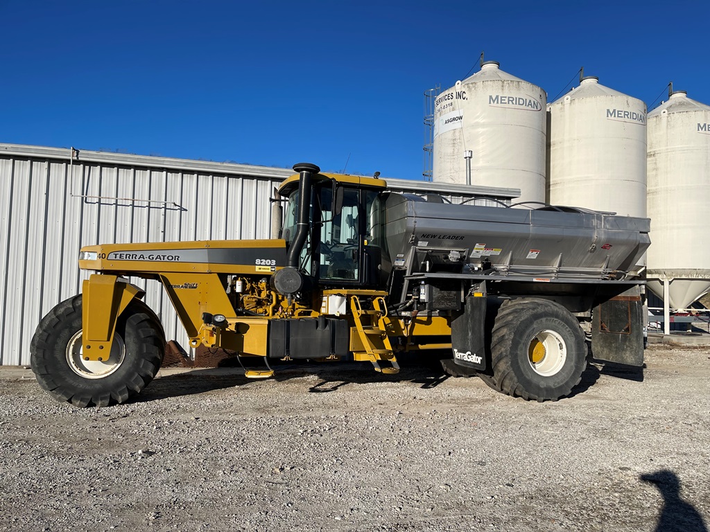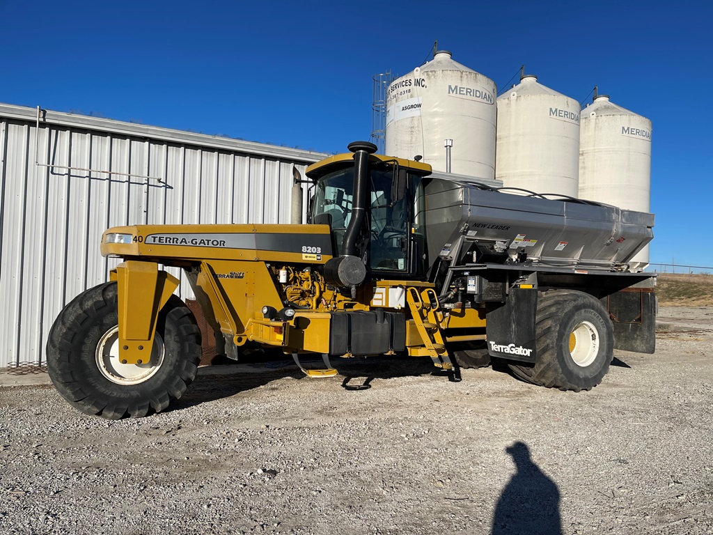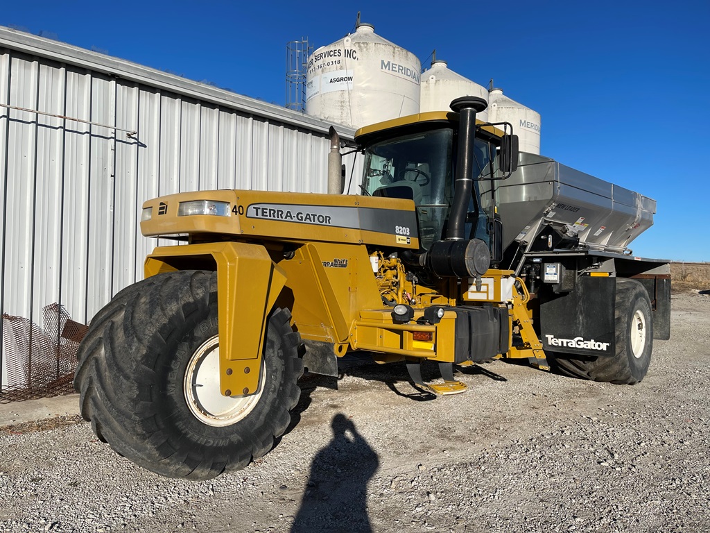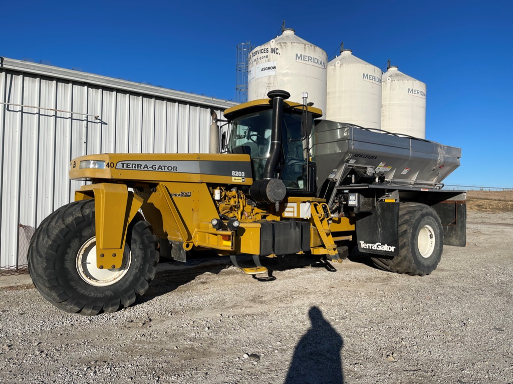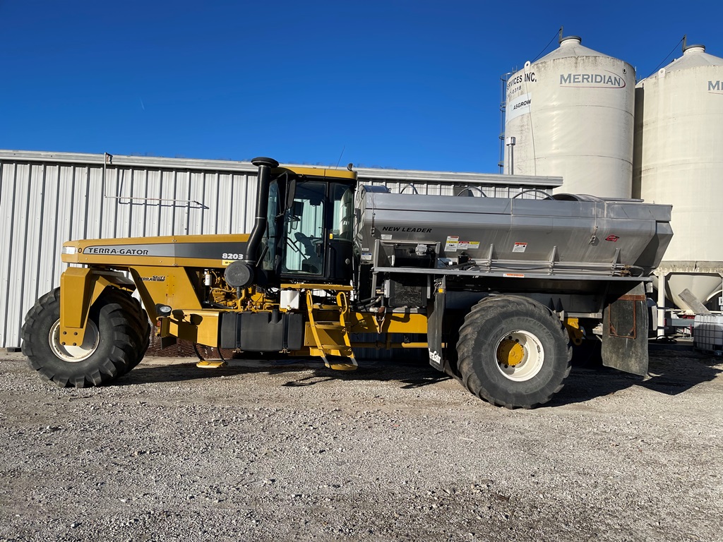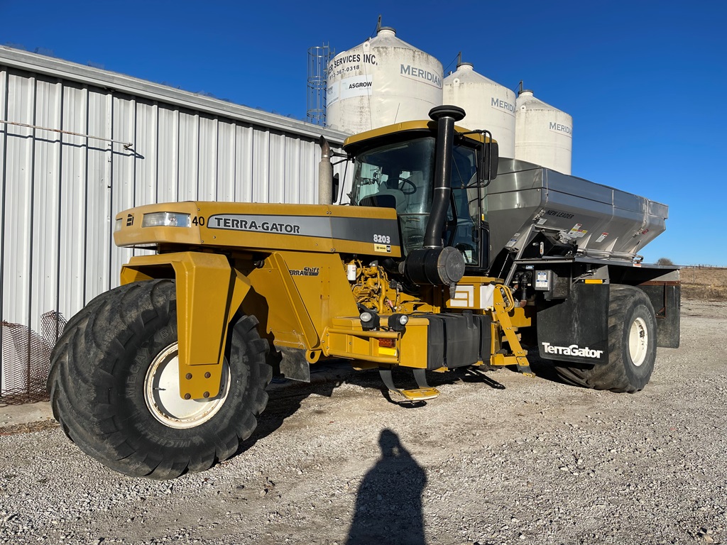 2009 Terra Gator 8203 Dry Floater (NP3354, Unit 115131), Cat C9 Acert diesel engine, Terra Shift transmission, heat, air conditioning, Am/Fm radio, air ride cab, New Leader Model 147630 - 14' stainless steel dry spreader box (S/N 411120), New Leader stainless steel MultApplier insert, New Leader L4000 G4 MultiBin - 8' (S/N 411122), dual spinners, hydraulic, Agri-Cover electric roll tarp, 1000/50R25 tires, OverView backup camera, Raven GPS, Raven Viper 4 monitor, shows 2,813 hours.