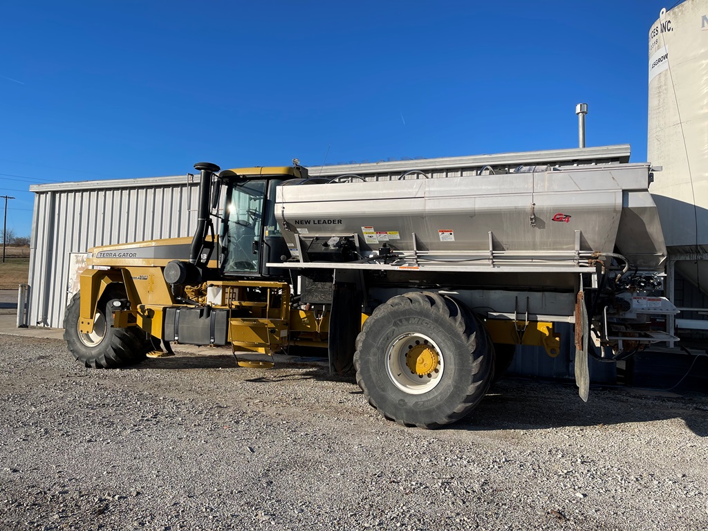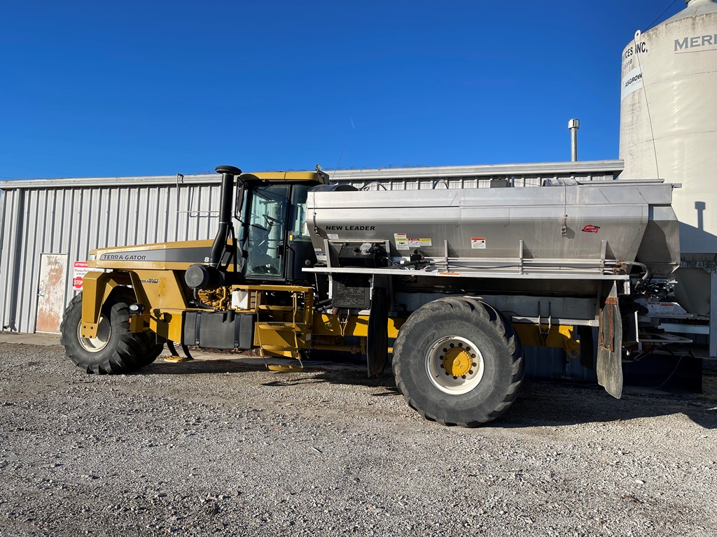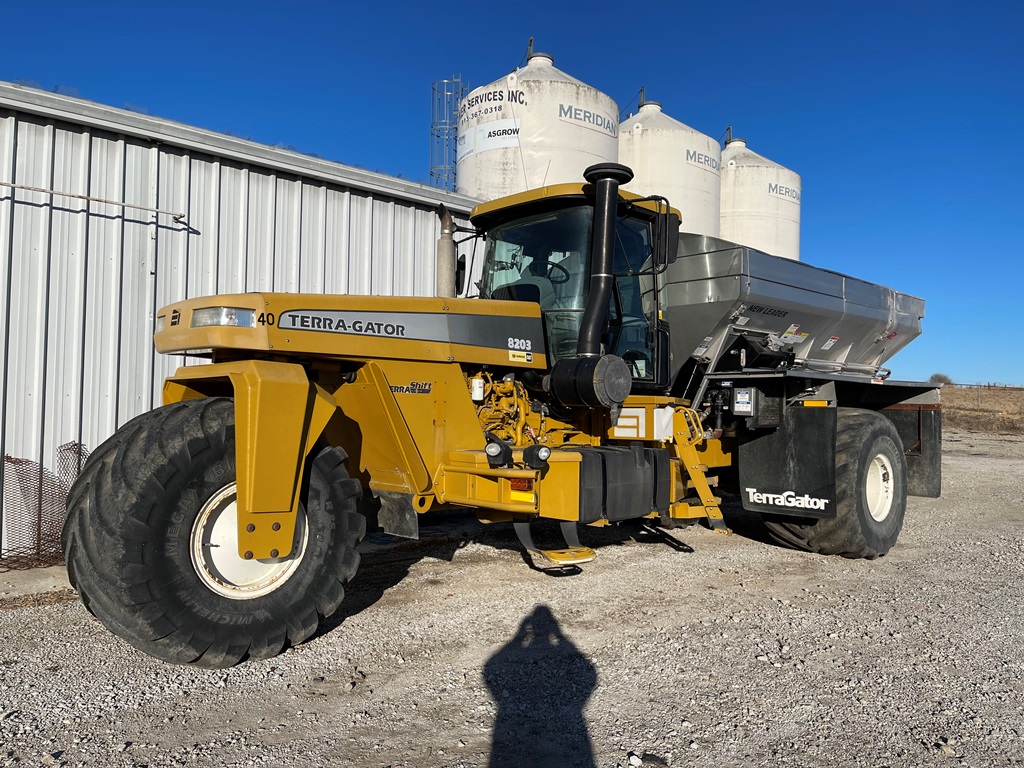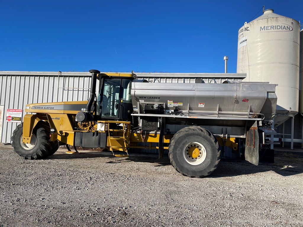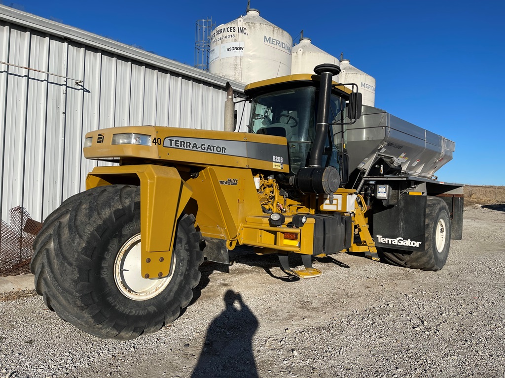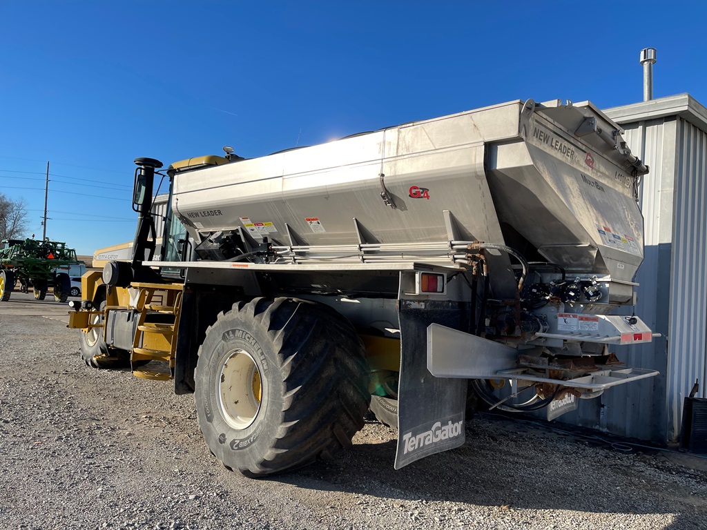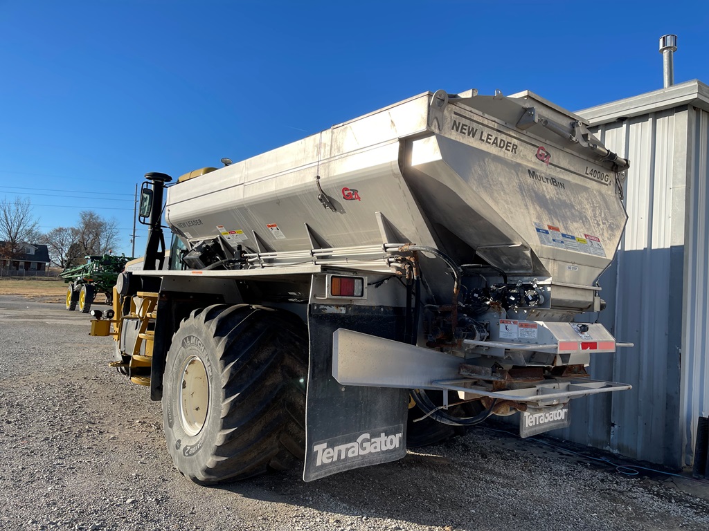 2009 Terra Gator 8203 Dry Floater (NP3354, Unit 115131), Cat C9 Acert diesel engine, Terra Shift transmission, heat, air conditioning, Am/Fm radio, air ride cab, New Leader Model 147630 - 14' stainless steel dry spreader box (S/N 411120), New Leader stainless steel MultApplier insert, New Leader L4000 G4 MultiBin - 8' (S/N 411122), dual spinners, hydraulic, Agri-Cover electric roll tarp, 1000/50R25 tires, OverView backup camera, Raven GPS, Raven Viper 4 monitor, shows 2,813 hours.