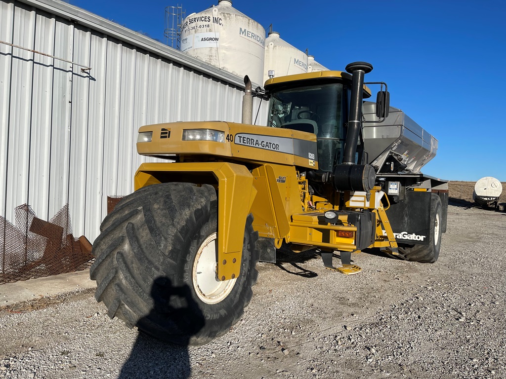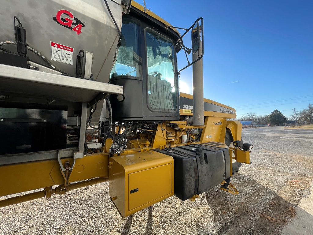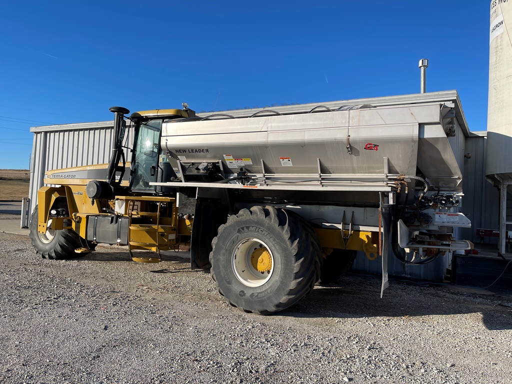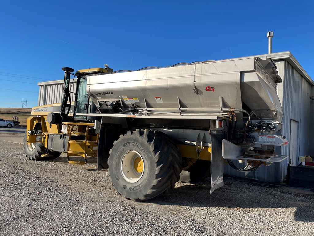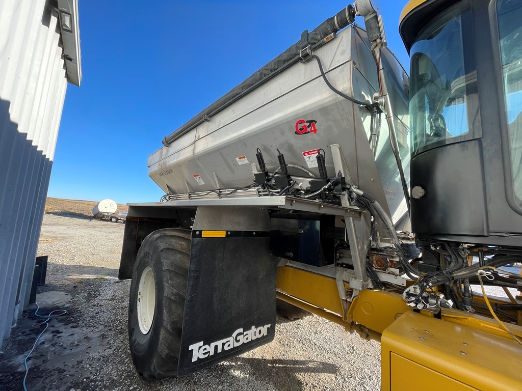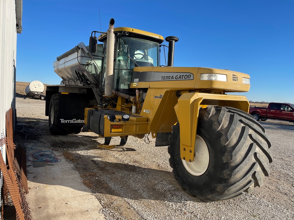 2009 Terra Gator 8203 Dry Floater (NP3354, Unit 115131), Cat C9 Acert diesel engine, Terra Shift transmission, heat, air conditioning, Am/Fm radio, air ride cab, New Leader Model 147630 - 14' stainless steel dry spreader box (S/N 411120), New Leader stainless steel MultApplier insert, New Leader L4000 G4 MultiBin - 8' (S/N 411122), dual spinners, hydraulic, Agri-Cover electric roll tarp, 1000/50R25 tires, OverView backup camera, Raven GPS, Raven Viper 4 monitor, shows 2,813 hours.
