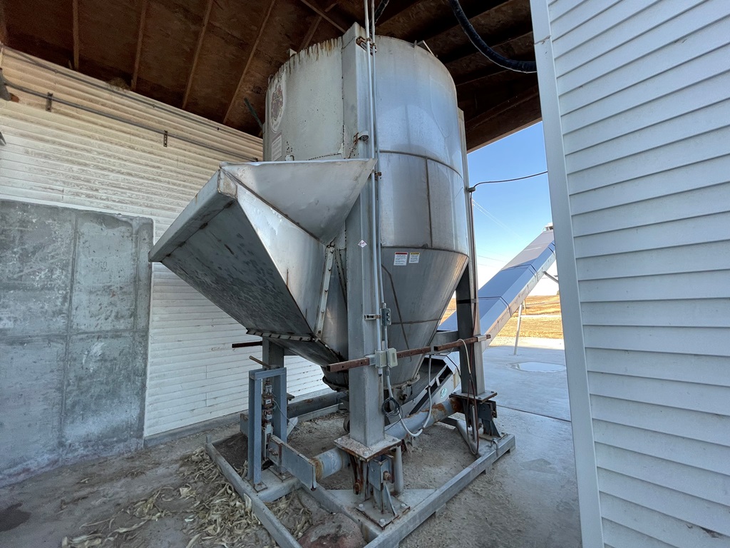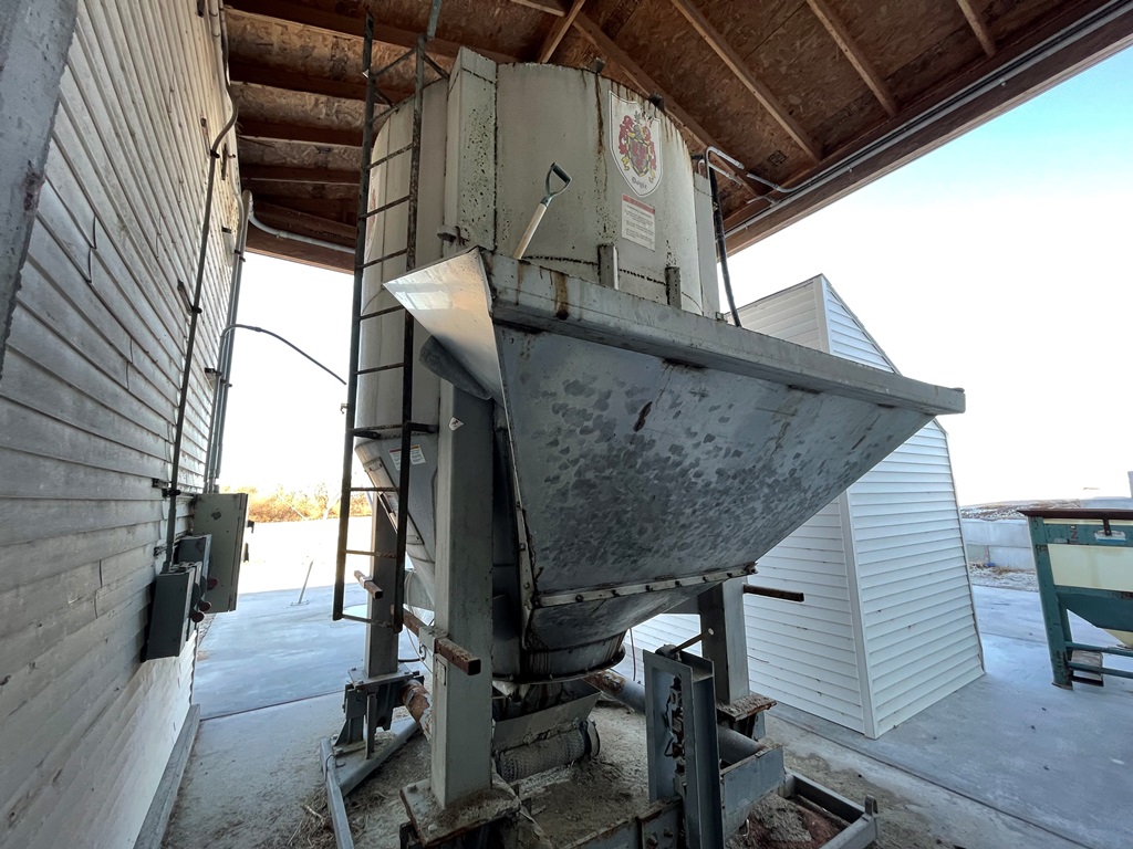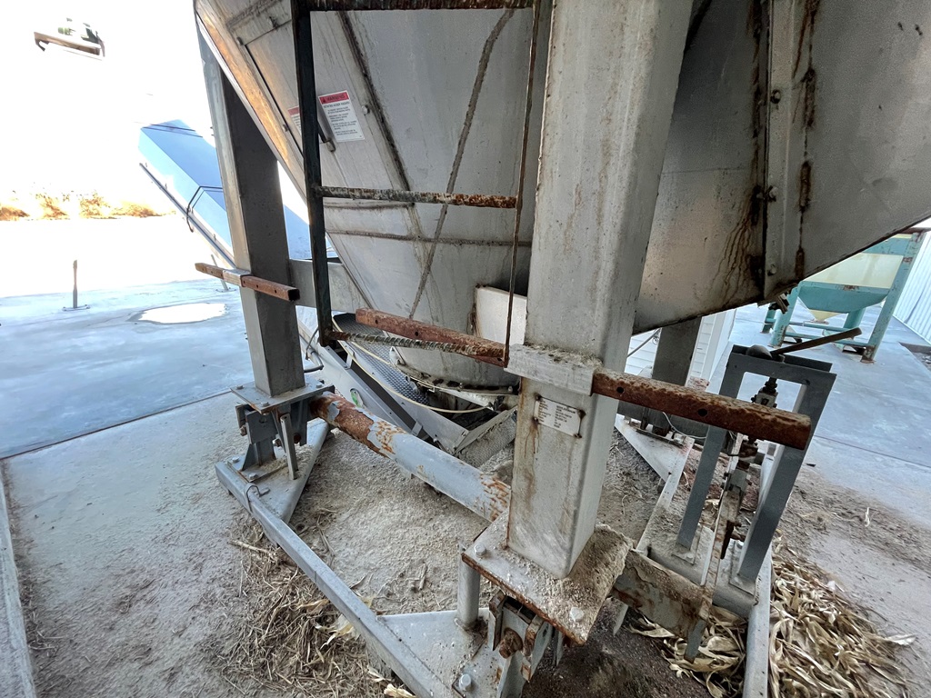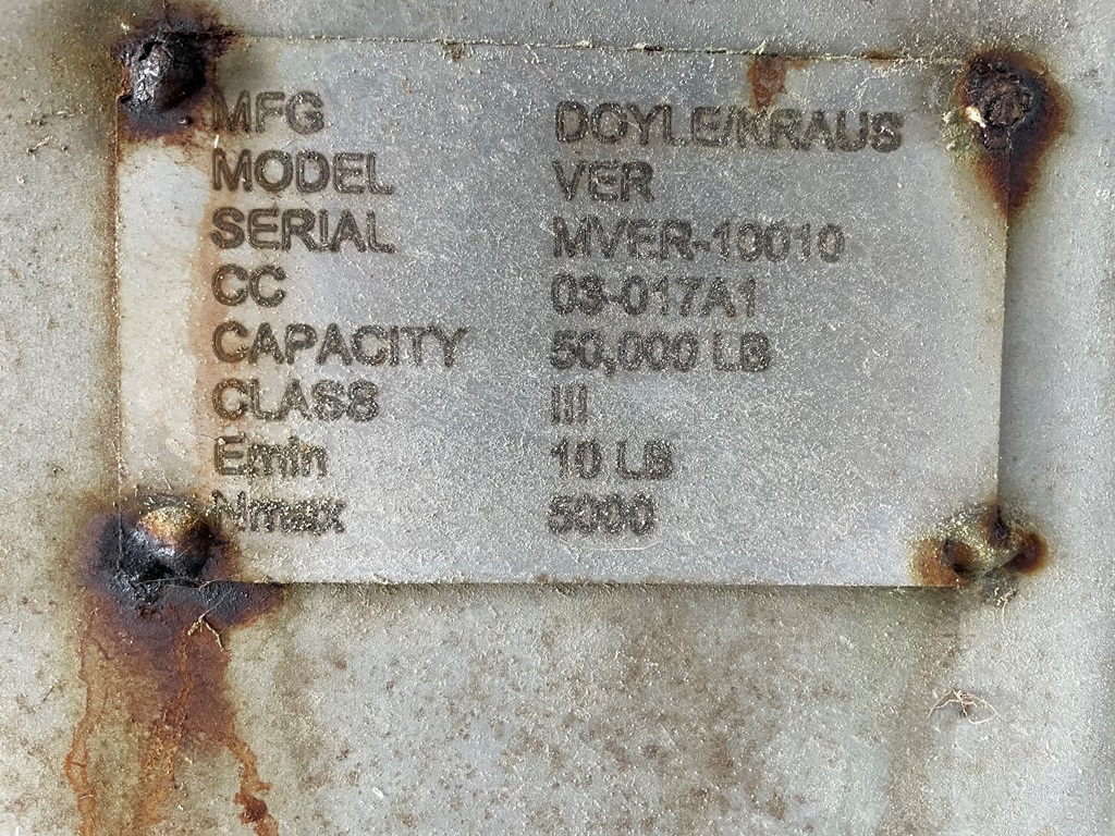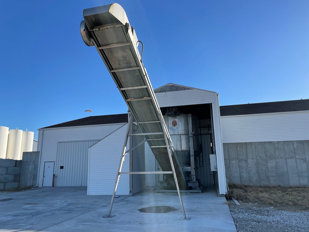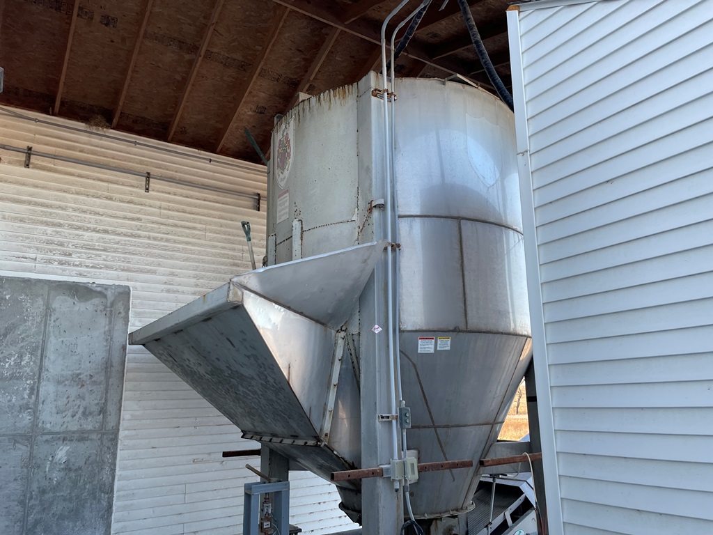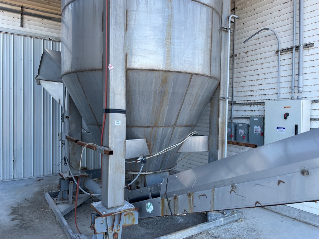 Doyle Stainless Steel Vertical Blender (GP2353), Doyle stainless steel vertical blender (S/N MVER-10010), 10 ton capacity, side mount hopper, ladder, electric motor, Rice Lake Model RL200001 weighing system, Doyle 36' x 30" stationary stainless steel discharge belt conveyor (S/N 170619A36X30), electric motor.