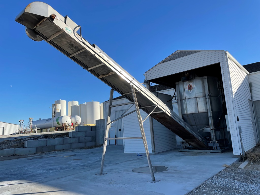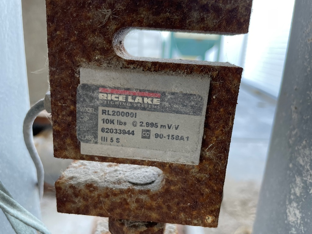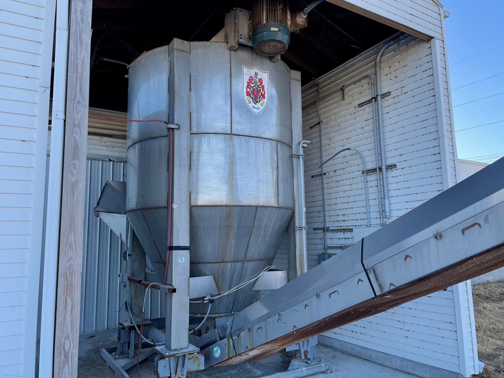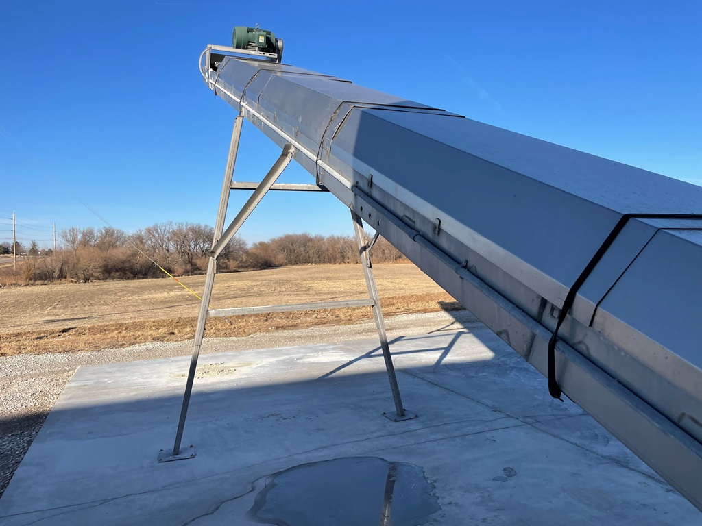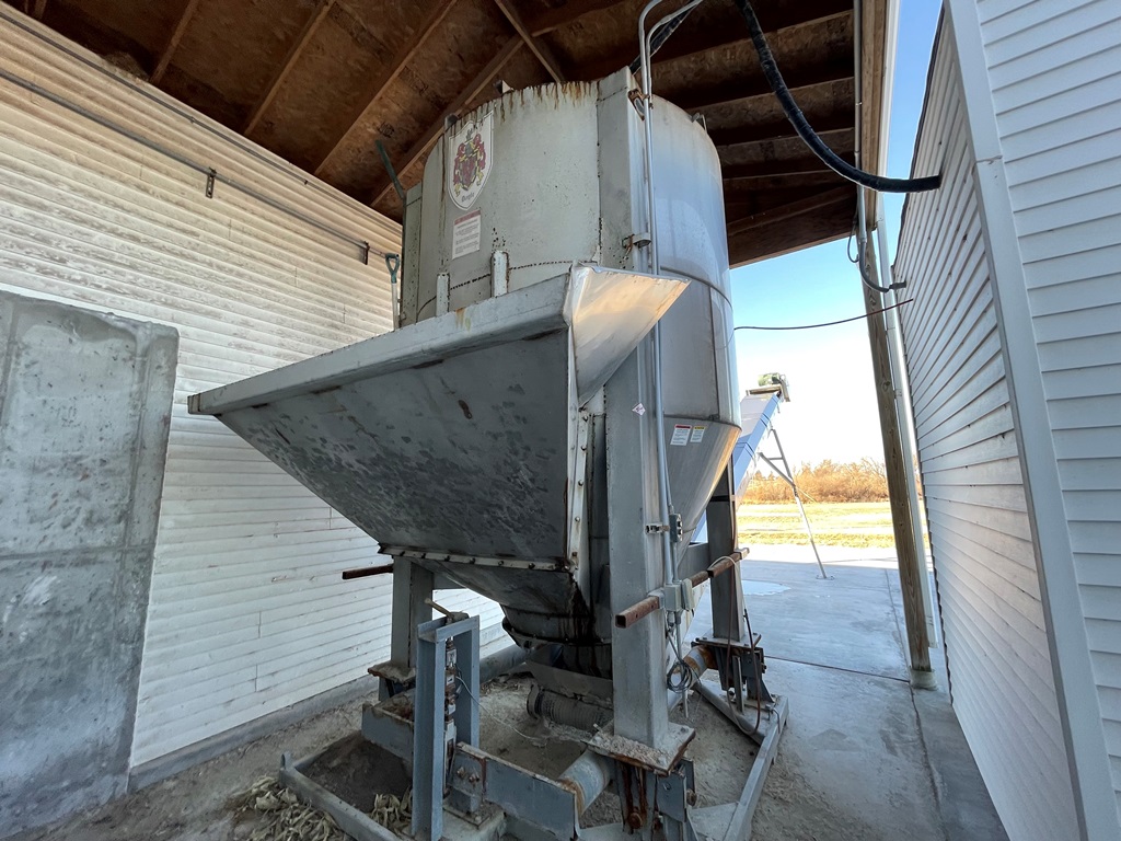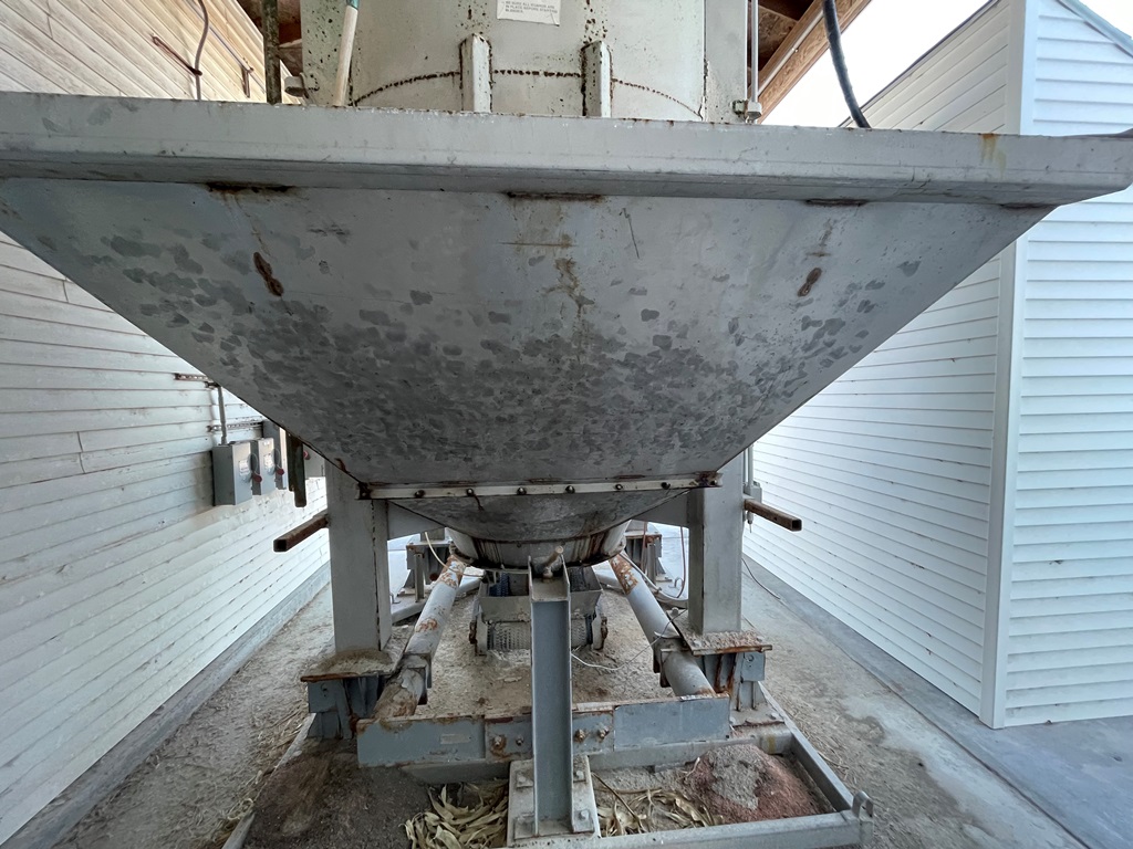 Doyle Stainless Steel Vertical Blender (GP2353), Doyle stainless steel vertical blender (S/N MVER-10010), 10 ton capacity, side mount hopper, ladder, electric motor, Rice Lake Model RL200001 weighing system, Doyle 36' x 30" stationary stainless steel discharge belt conveyor (S/N 170619A36X30), electric motor.