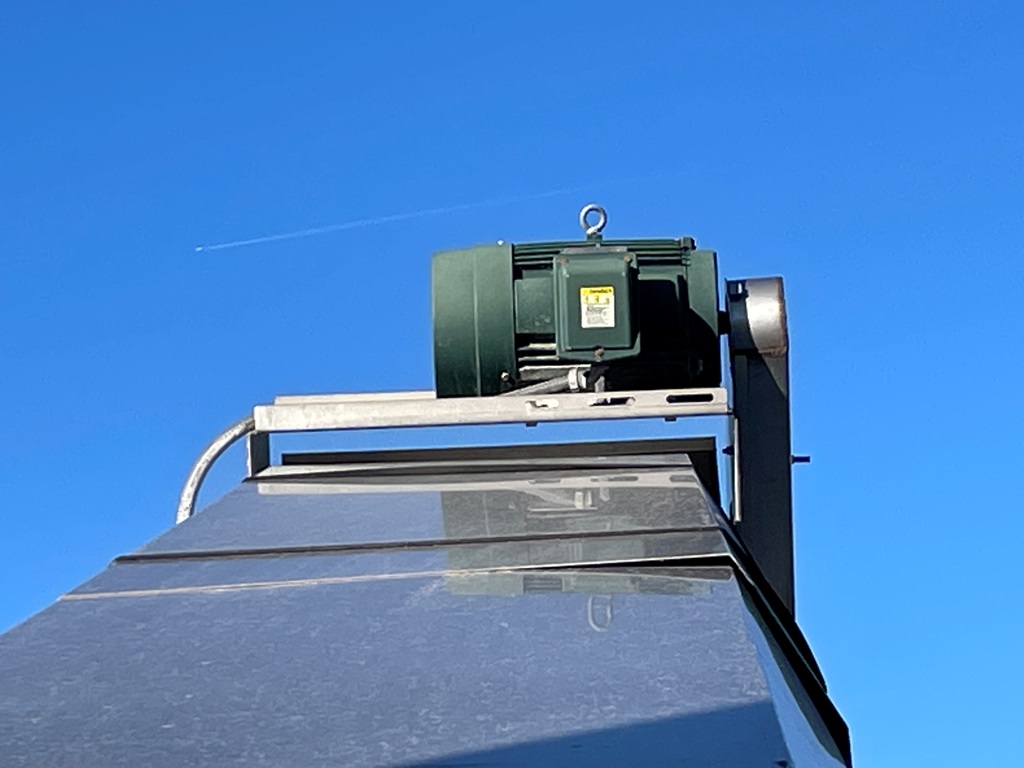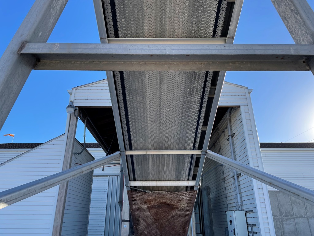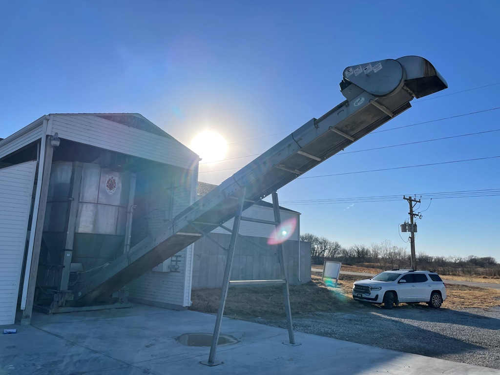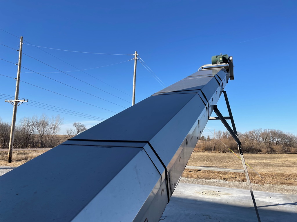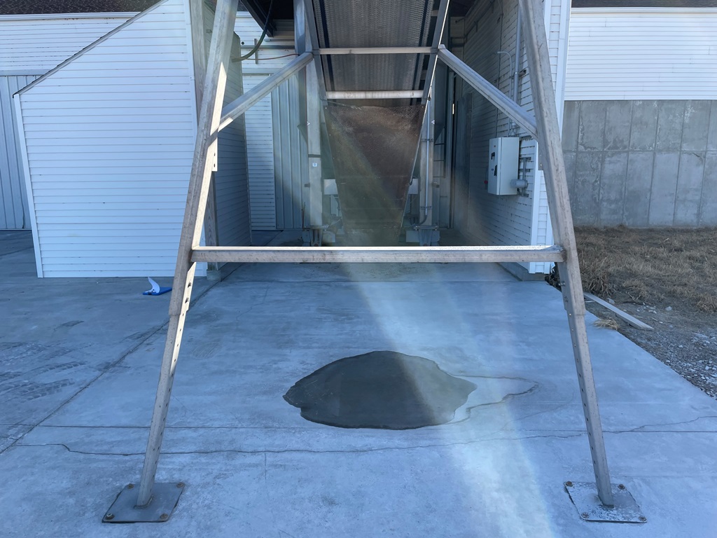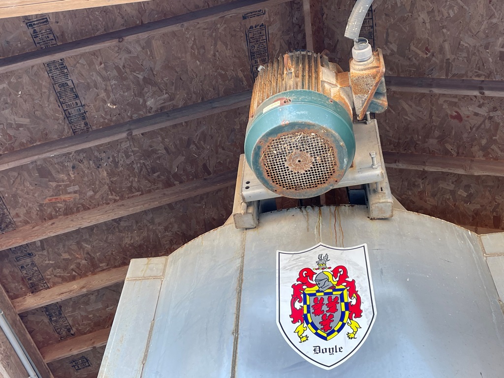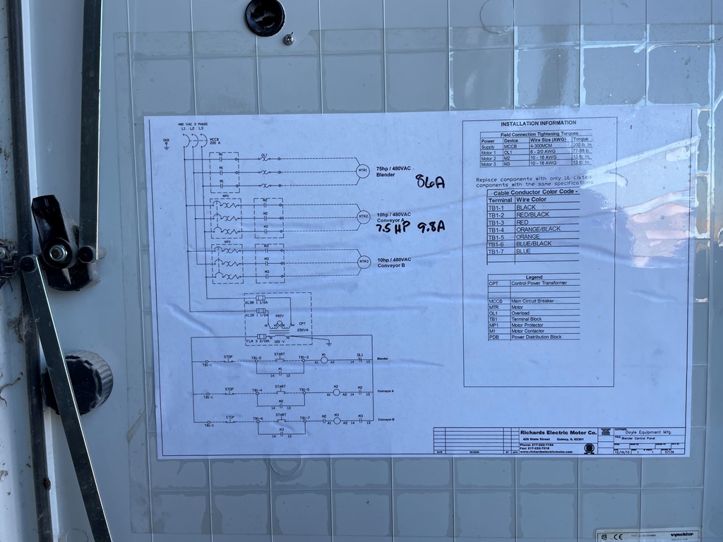 Doyle Stainless Steel Vertical Blender (GP2353), Doyle stainless steel vertical blender (S/N MVER-10010), 10 ton capacity, side mount hopper, ladder, electric motor, Rice Lake Model RL200001 weighing system, Doyle 36' x 30" stationary stainless steel discharge belt conveyor (S/N 170619A36X30), electric motor.