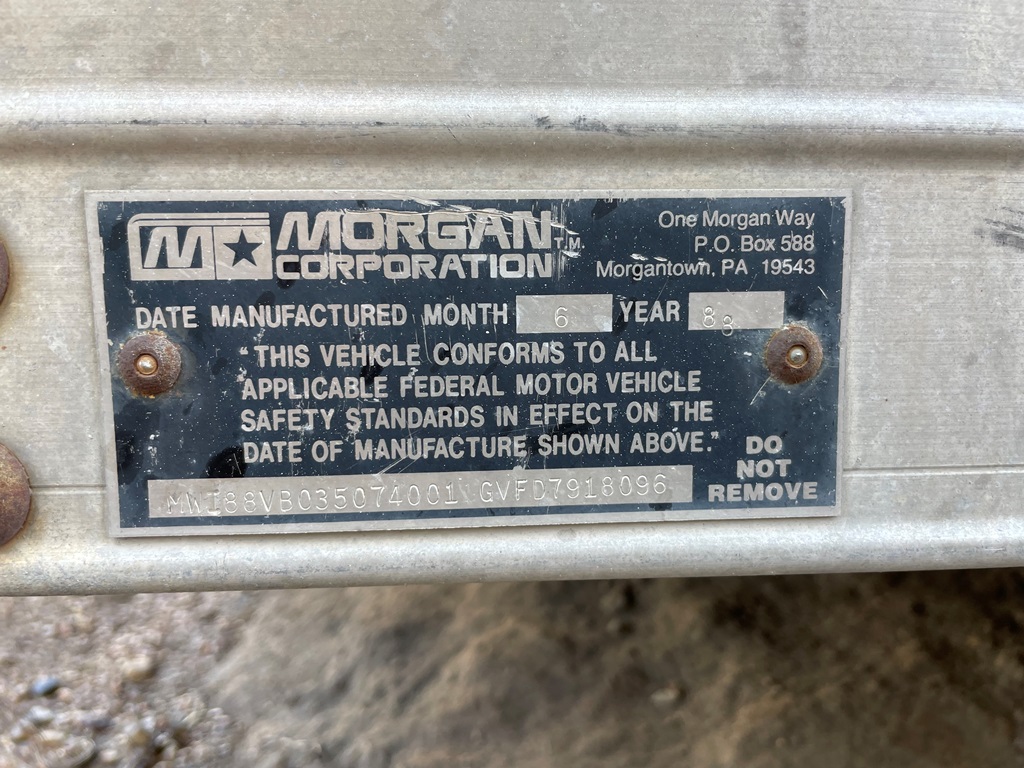 1988 Morgan Van Storage Body (GP2359), approx. approx. 18' long x 96" wide x 84" high, wood floor, rear rollup door.