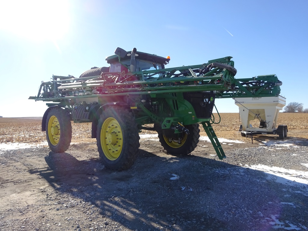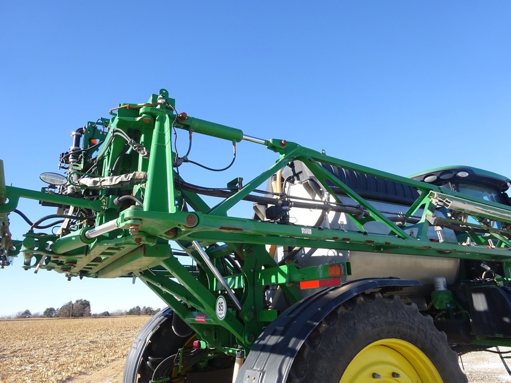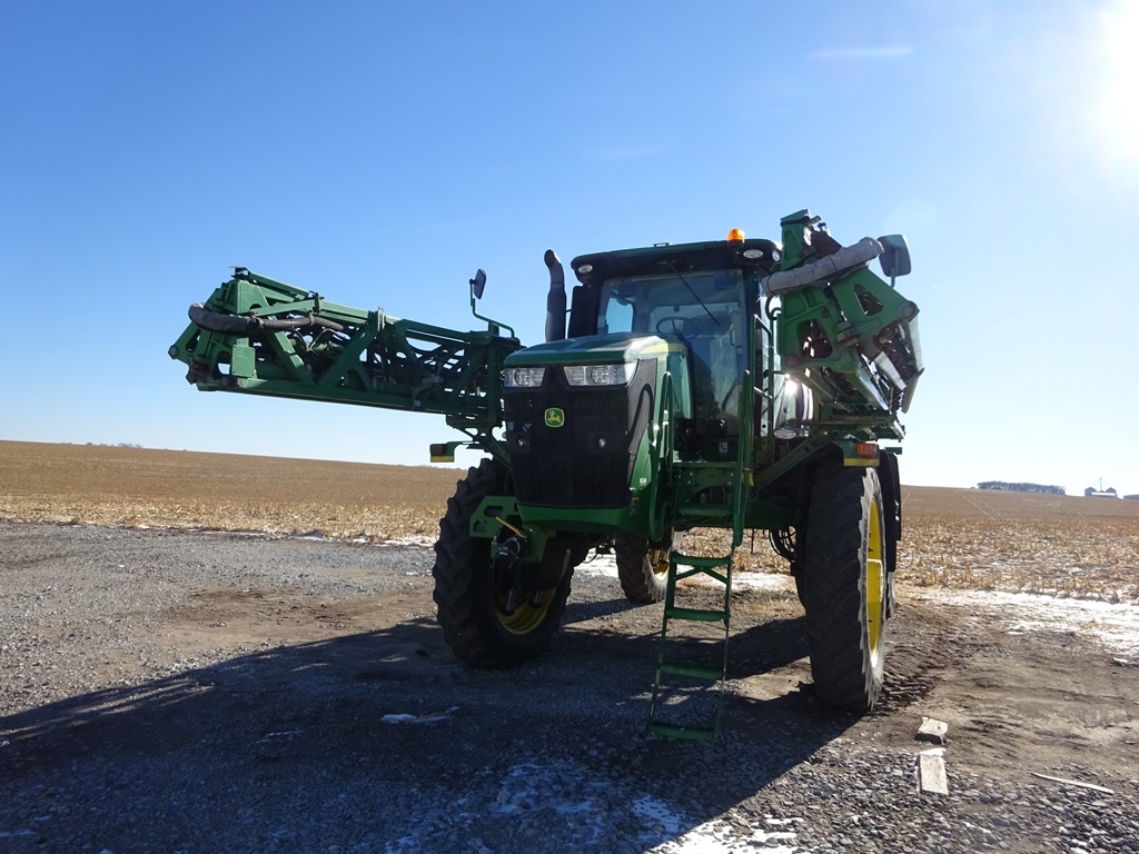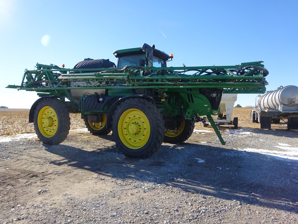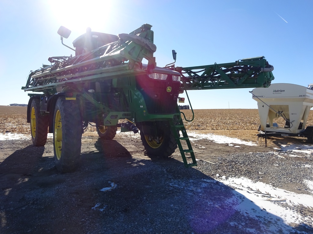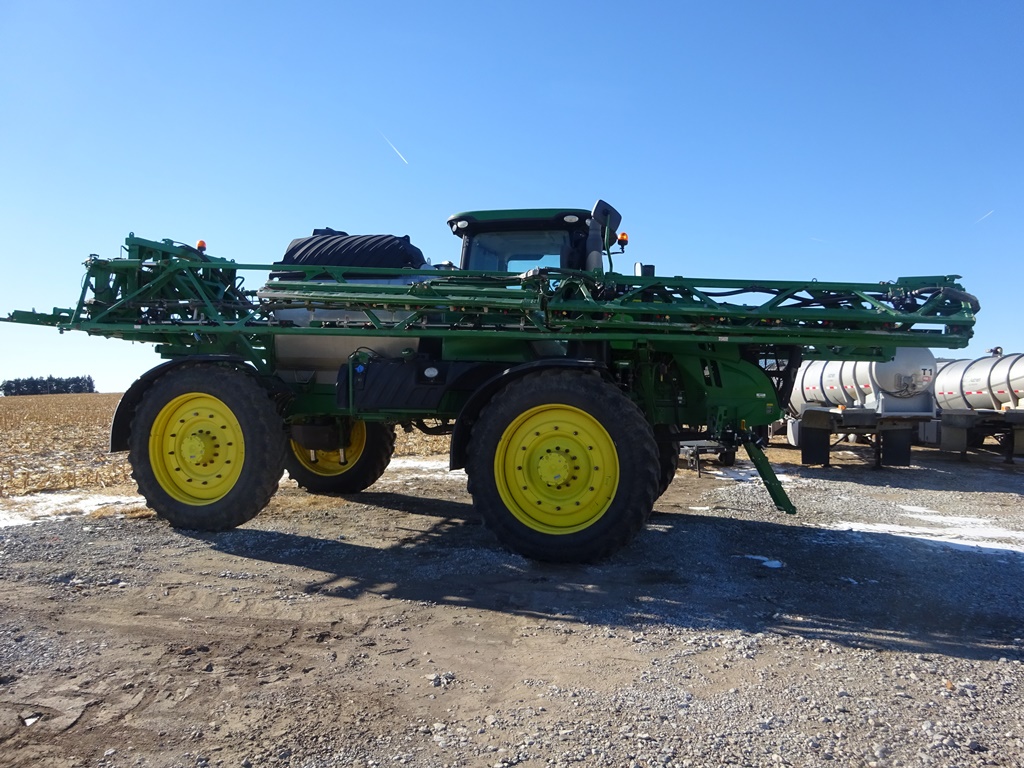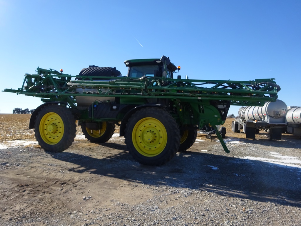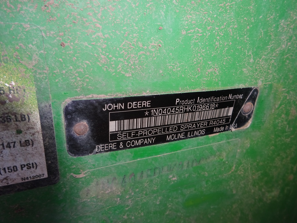 2019 John Deere R4045 Sprayer (PZ10073, Unit 112198), John Deere diesel engine (S/N RG6090U069340), hydrostatic transmission, air conditioning, heat, Am/Fm radio, leather seat, beacon lights, 1200 gallon stainless steel liquid system, 120' boom, automatic solution control, stainless steel chemical inductor, top poly rinse tank, front fill, Firestone Radial All Traction RC IF380/105R50 tires, fenders, shows 2,018 hours.