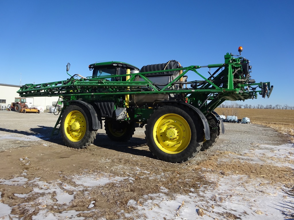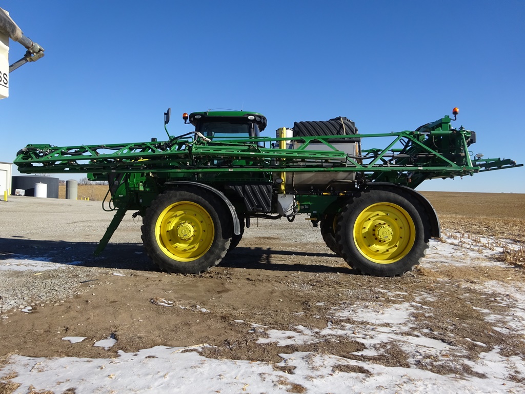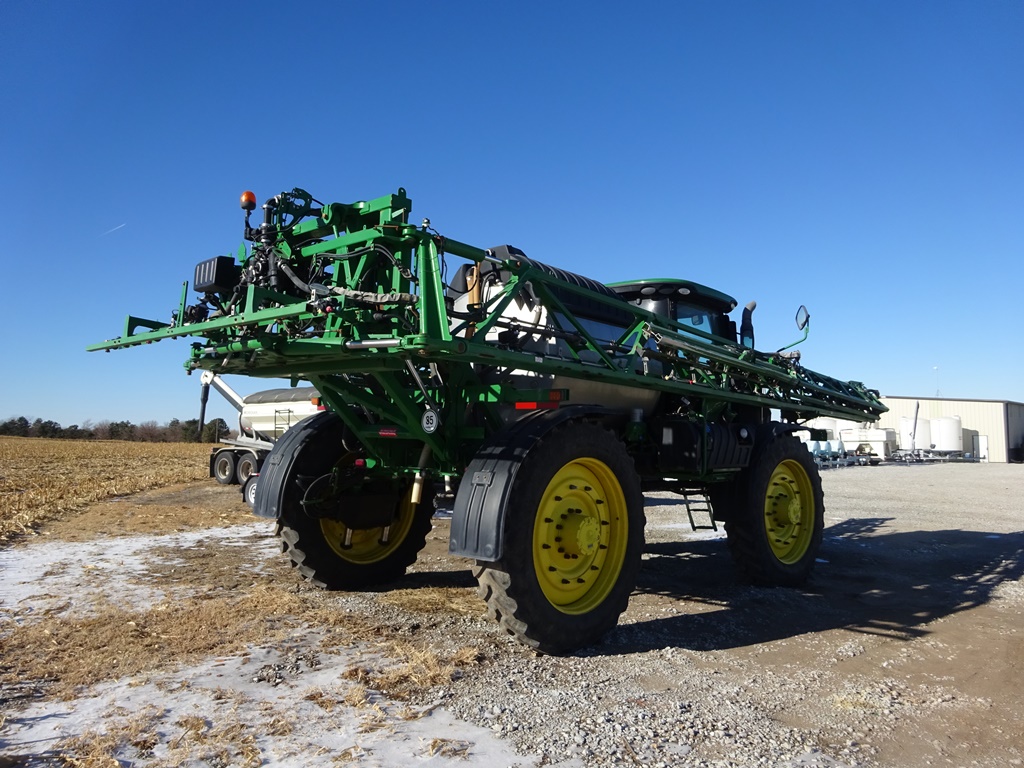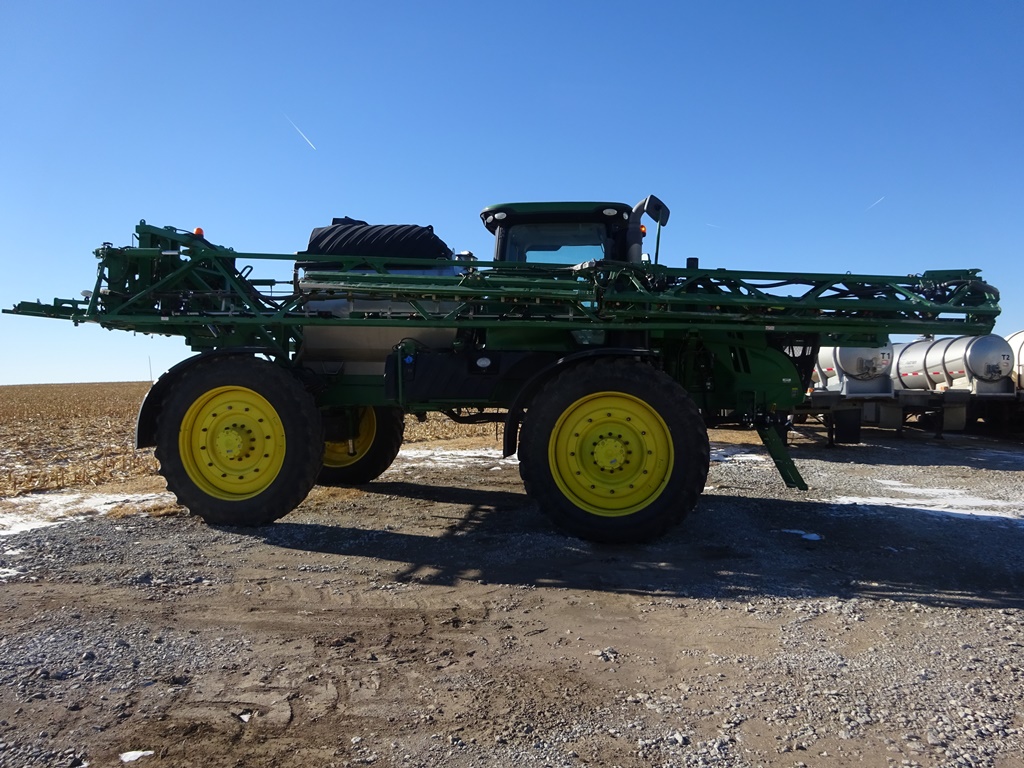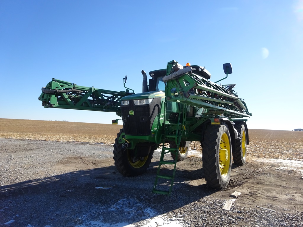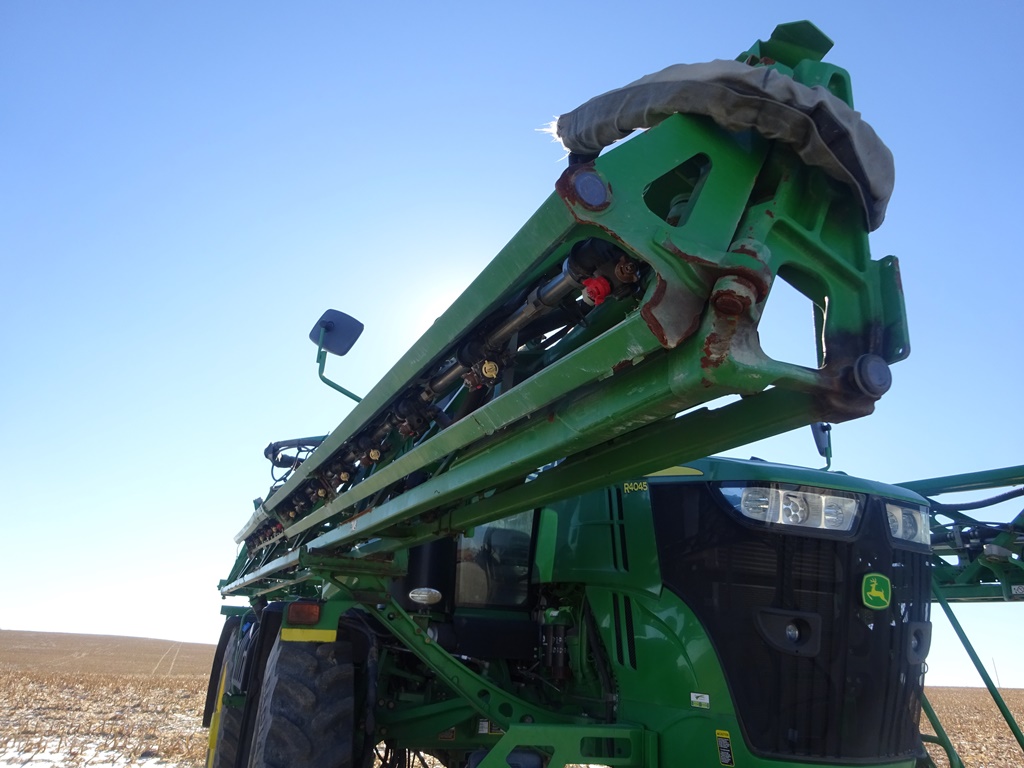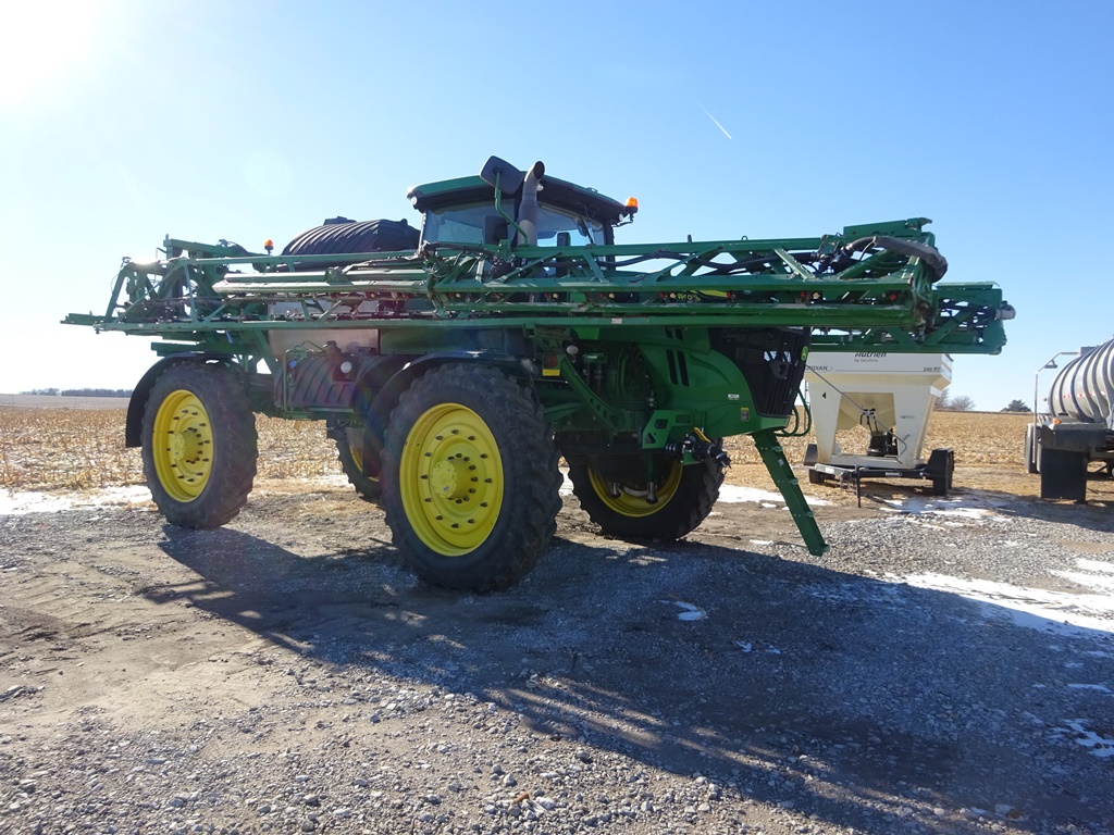 2019 John Deere R4045 Sprayer (PZ10073, Unit 112198), John Deere diesel engine (S/N RG6090U069340), hydrostatic transmission, air conditioning, heat, Am/Fm radio, leather seat, beacon lights, 1200 gallon stainless steel liquid system, 120' boom, automatic solution control, stainless steel chemical inductor, top poly rinse tank, front fill, Firestone Radial All Traction RC IF380/105R50 tires, fenders, shows 2,018 hours.