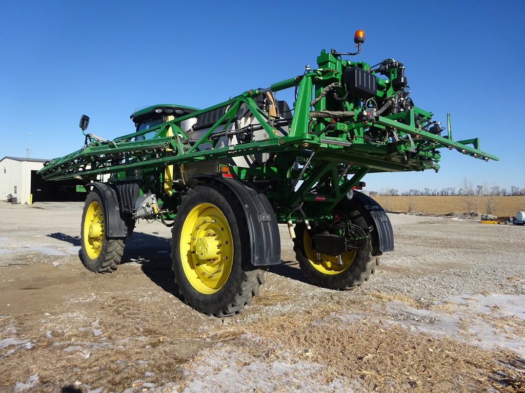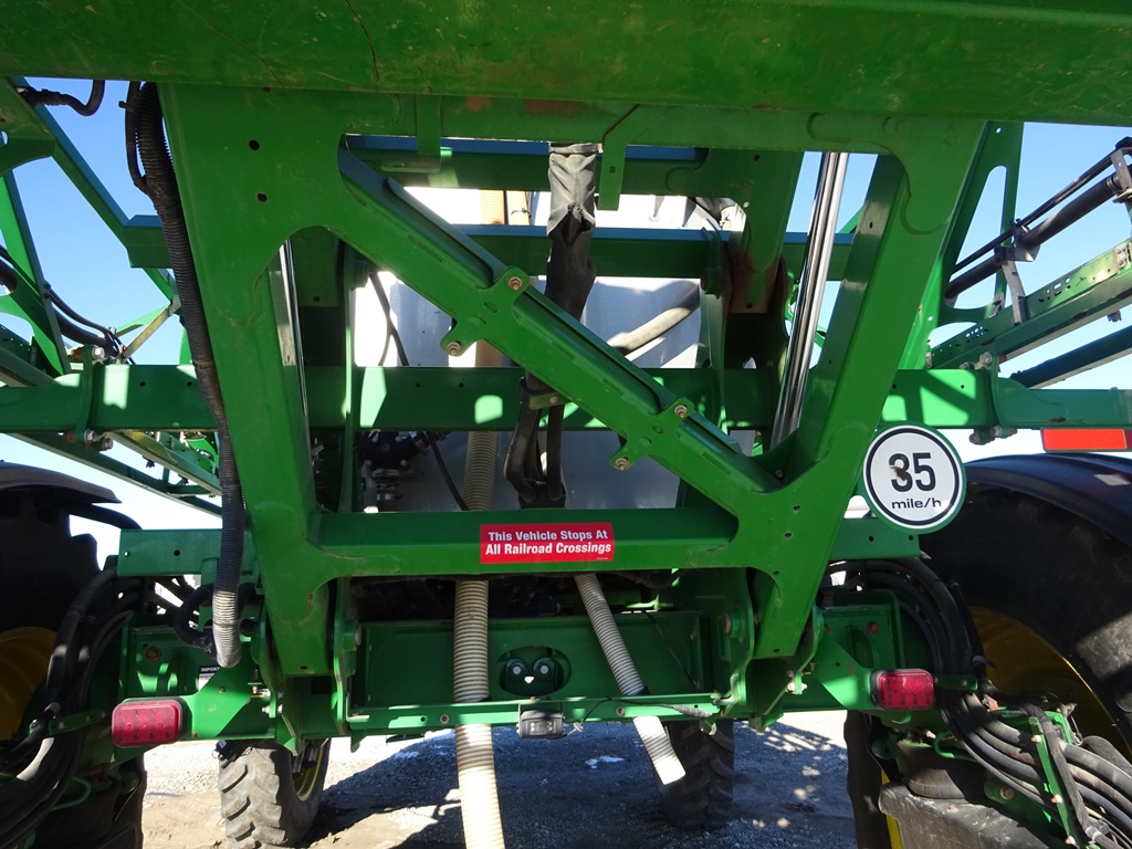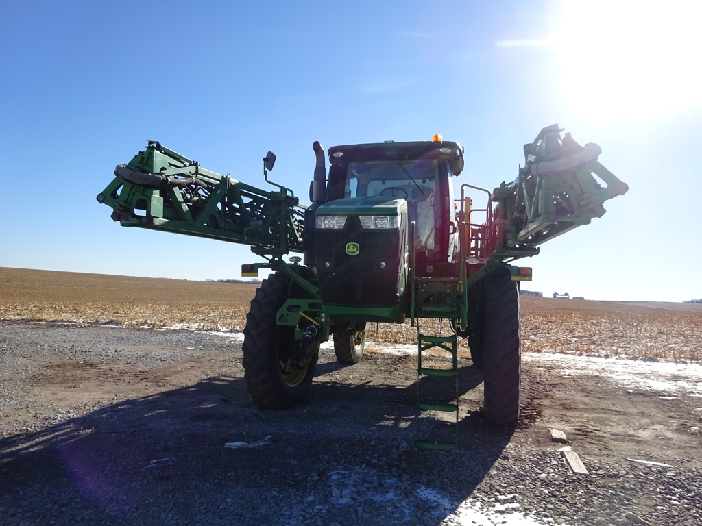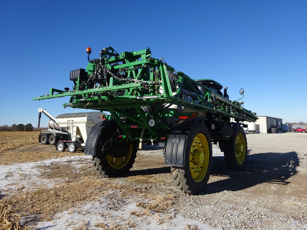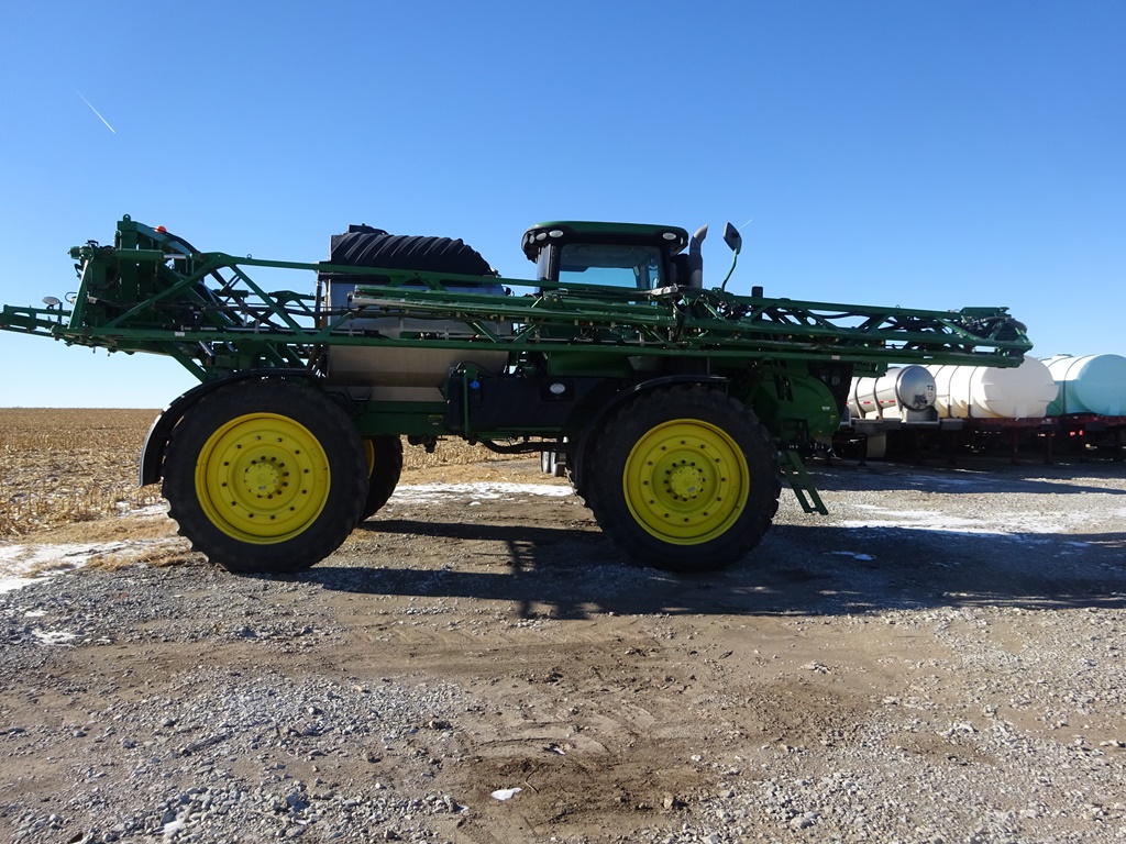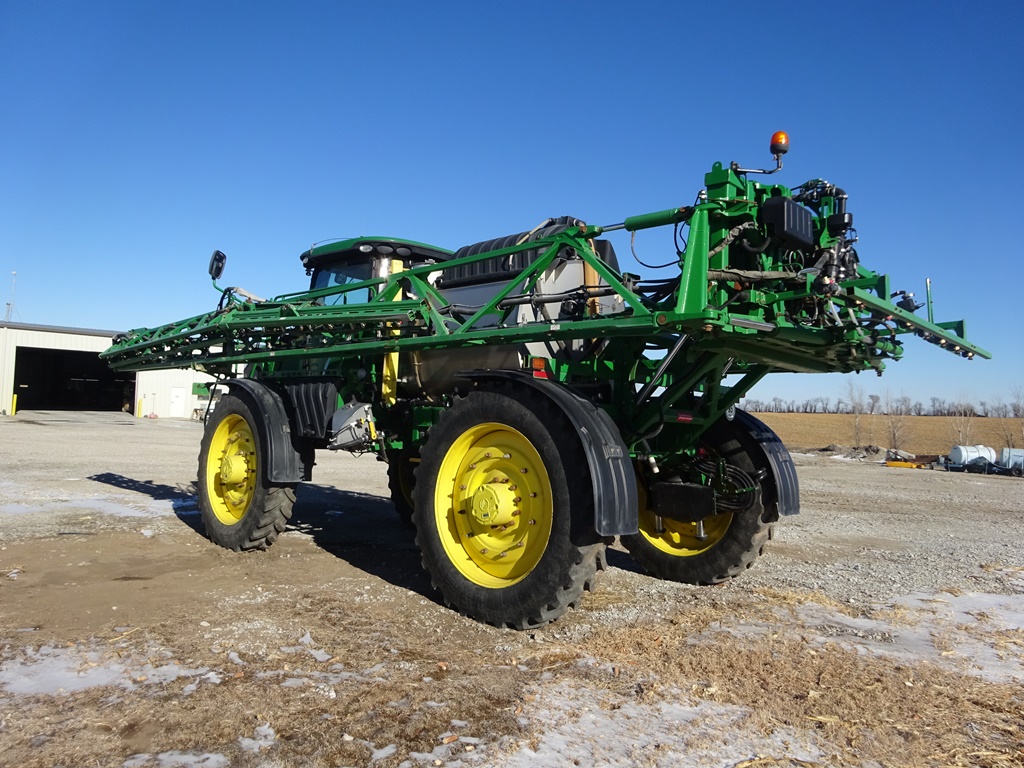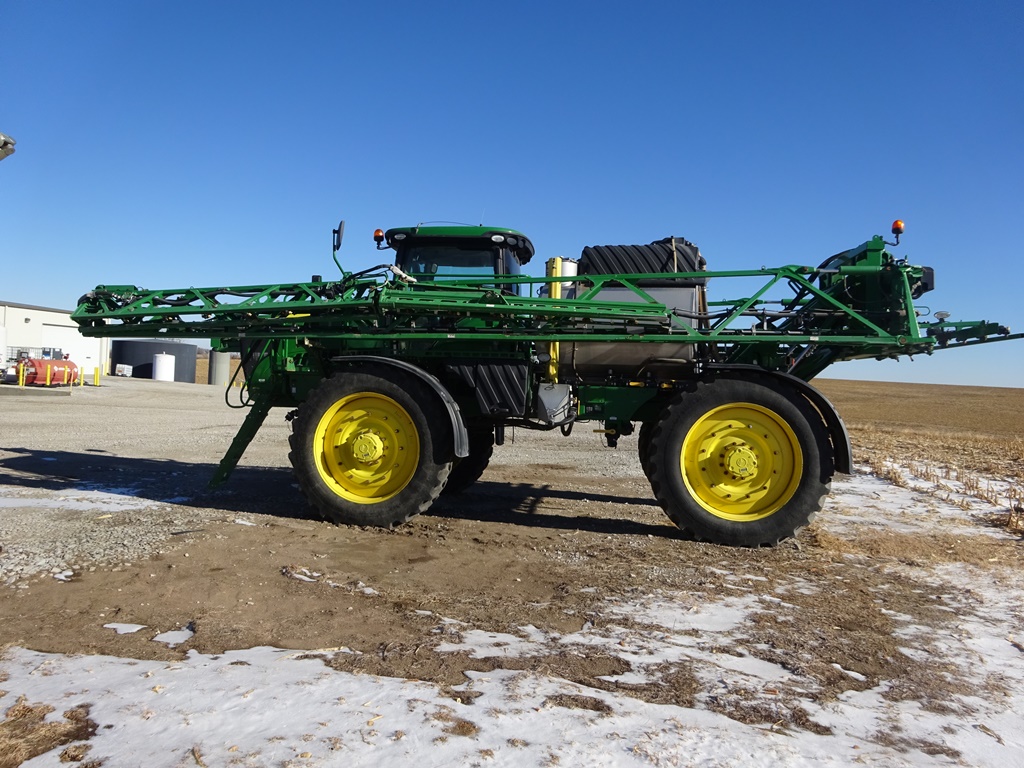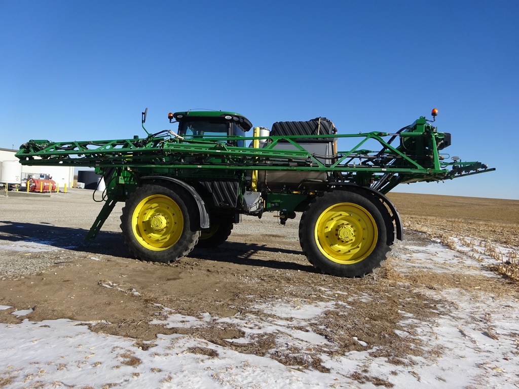 2019 John Deere R4045 Sprayer (PZ10073, Unit 112198), John Deere diesel engine (S/N RG6090U069340), hydrostatic transmission, air conditioning, heat, Am/Fm radio, leather seat, beacon lights, 1200 gallon stainless steel liquid system, 120' boom, automatic solution control, stainless steel chemical inductor, top poly rinse tank, front fill, Firestone Radial All Traction RC IF380/105R50 tires, fenders, shows 2,018 hours.