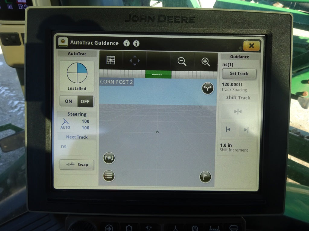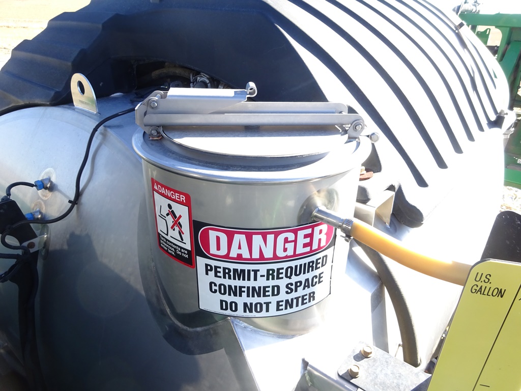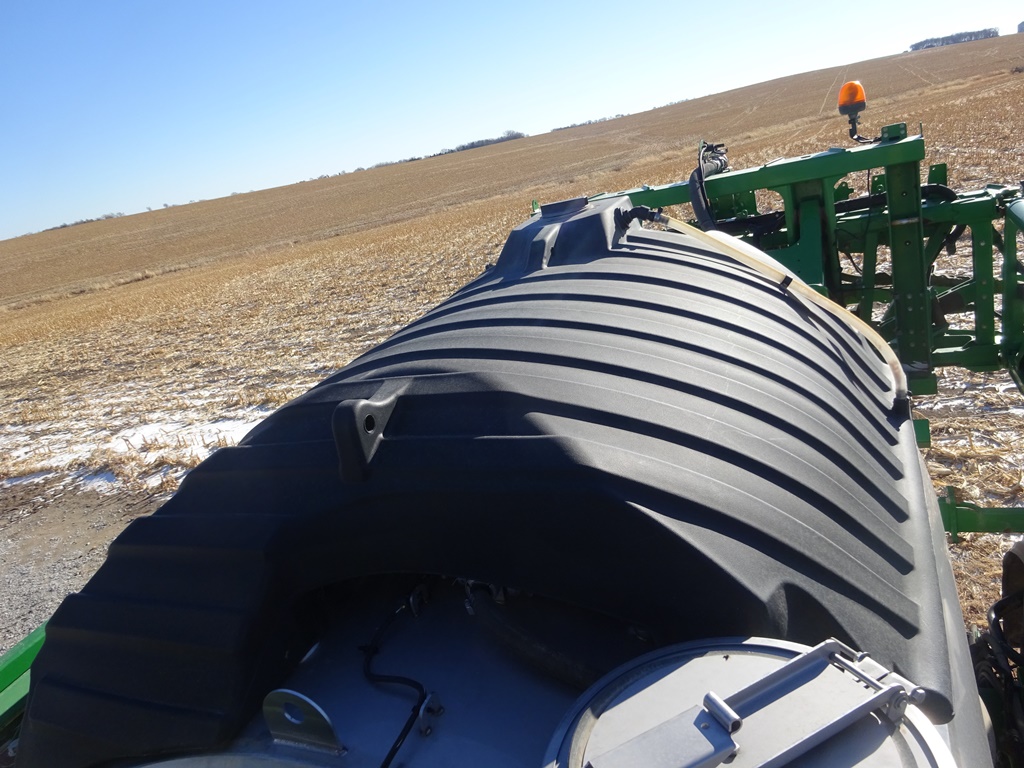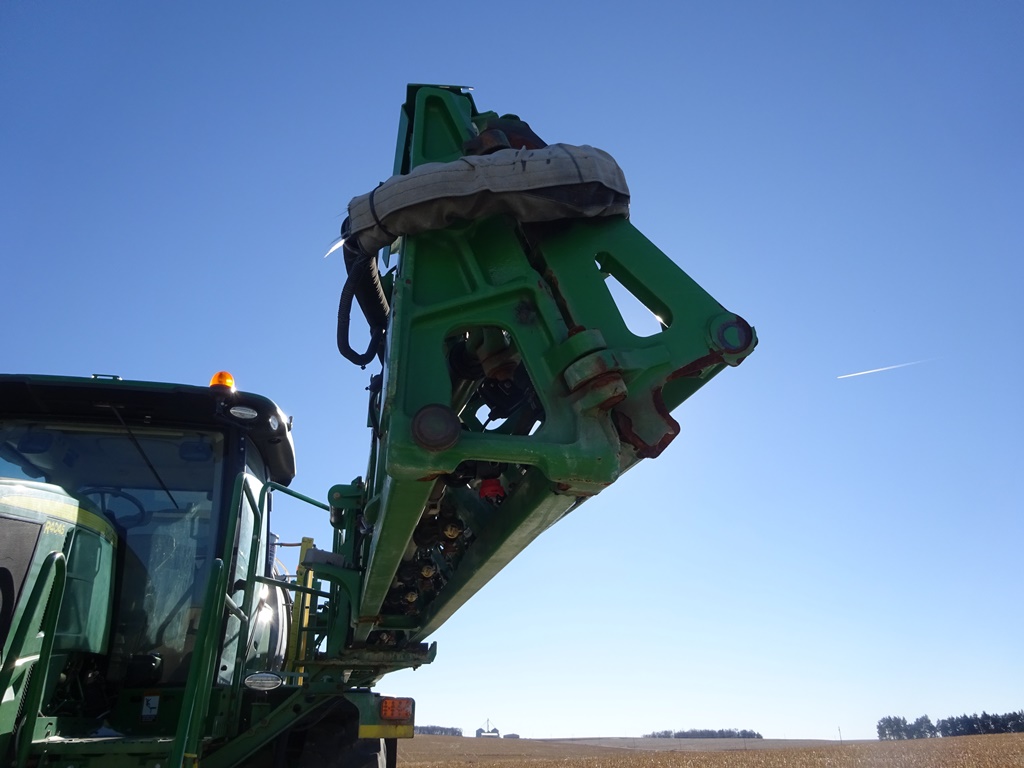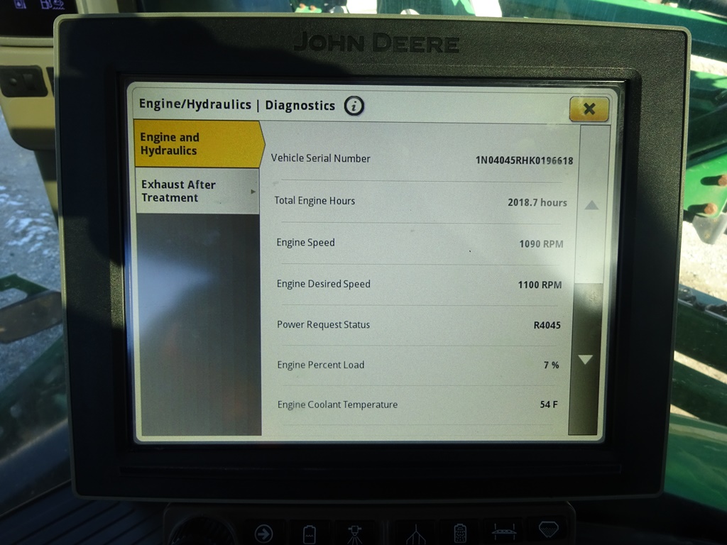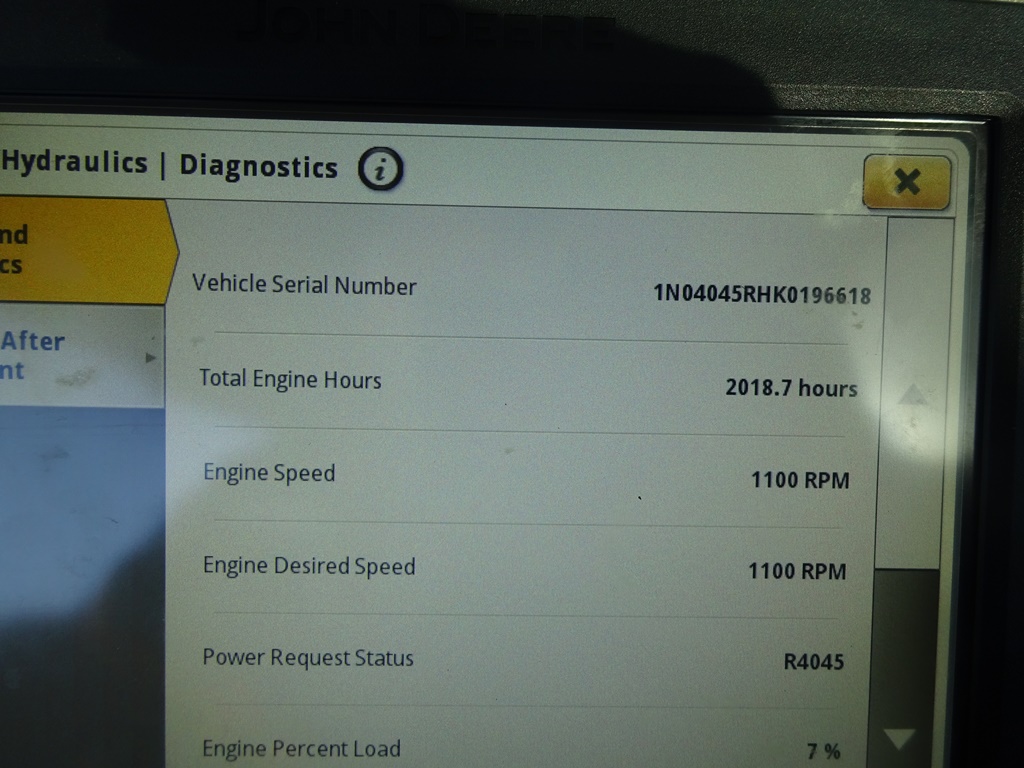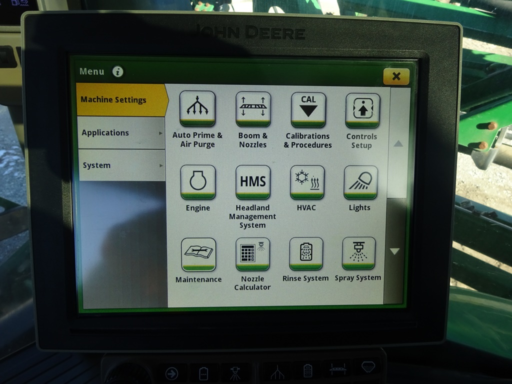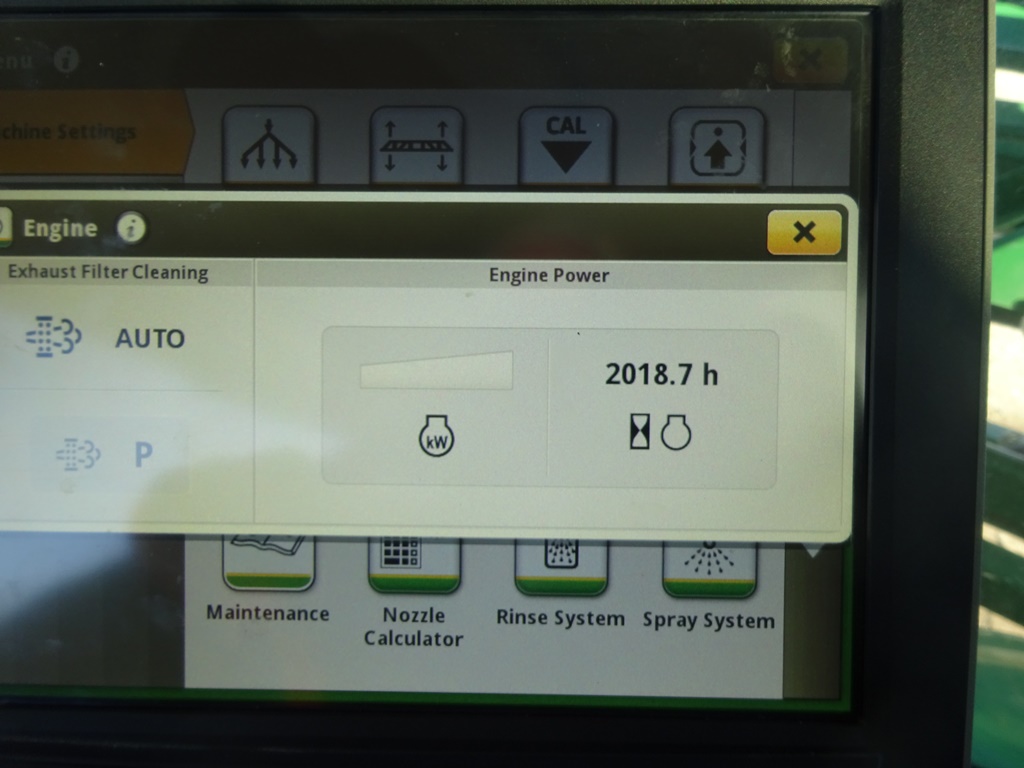 2019 John Deere R4045 Sprayer (PZ10073, Unit 112198), John Deere diesel engine (S/N RG6090U069340), hydrostatic transmission, air conditioning, heat, Am/Fm radio, leather seat, beacon lights, 1200 gallon stainless steel liquid system, 120' boom, automatic solution control, stainless steel chemical inductor, top poly rinse tank, front fill, Firestone Radial All Traction RC IF380/105R50 tires, fenders, shows 2,018 hours.