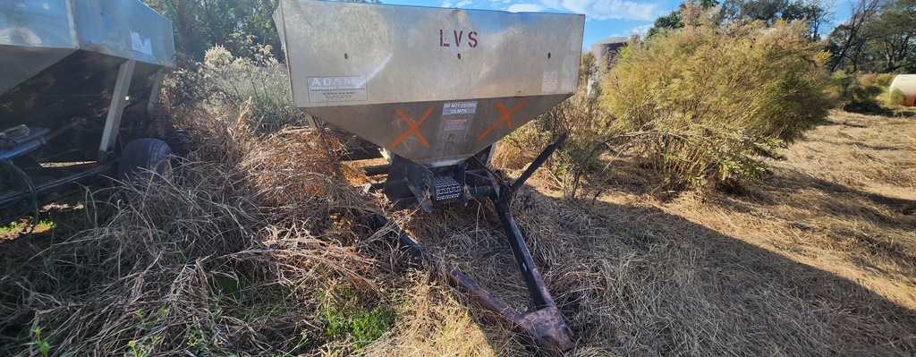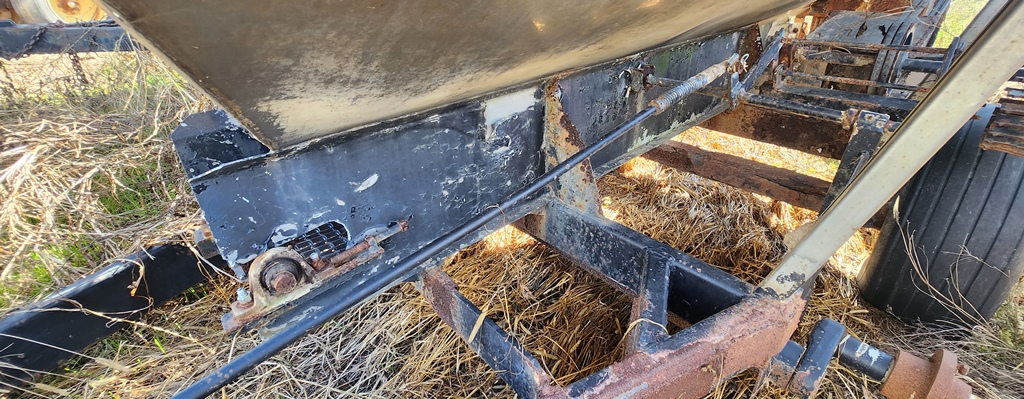 Adams Spreader Buggy (DR3592 Unit 0852), 5 ton stainless steel spreader buggy FOR PARTS, ground drive hydraulics, missing 2 tires.