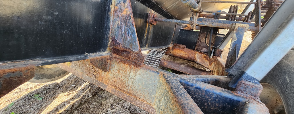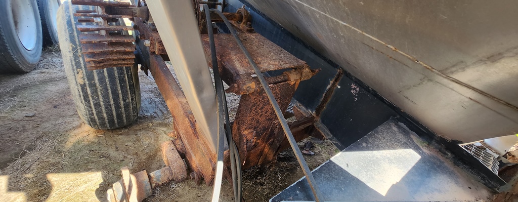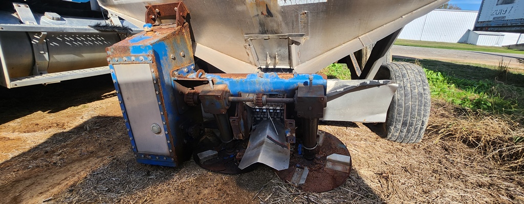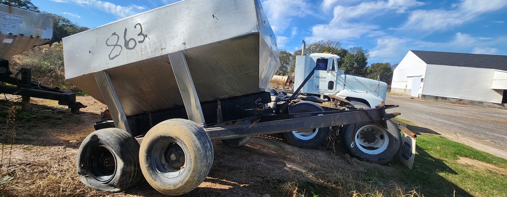 Adams Spreader Buggy (DR3596 Unit 0858), 5 ton stainless steel spreader buggy, ground drive hydraulics, dual rear spinner pans, 12.5L-15 tires and missing 1.