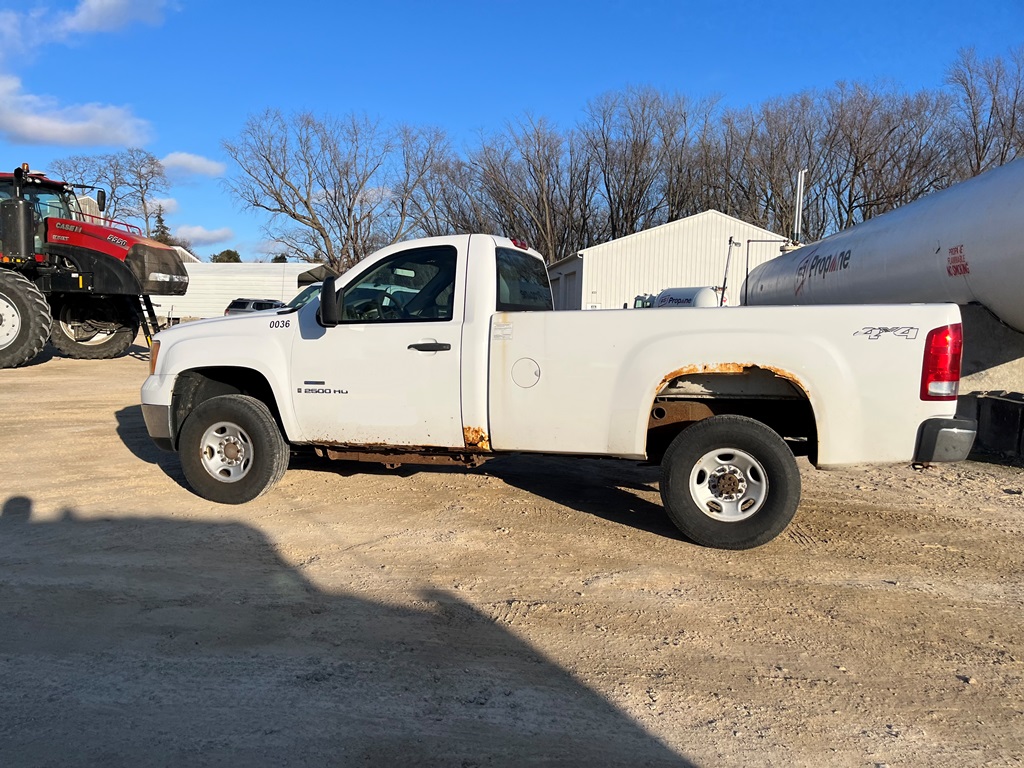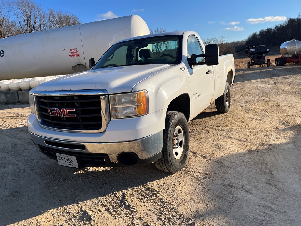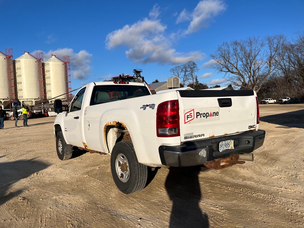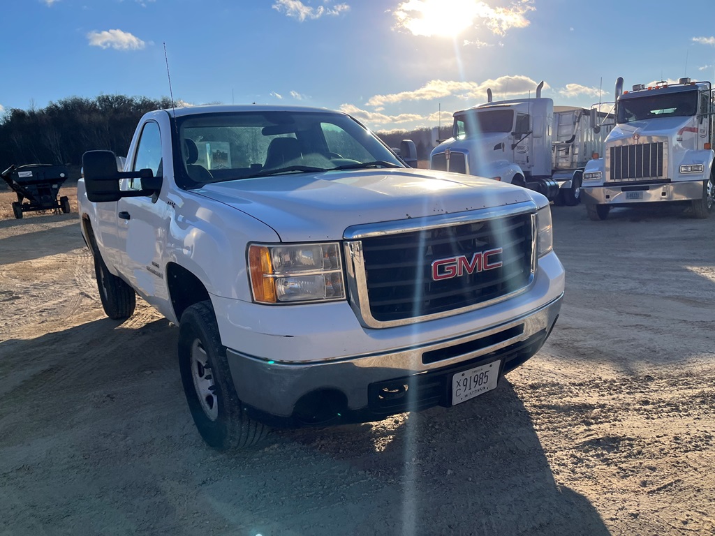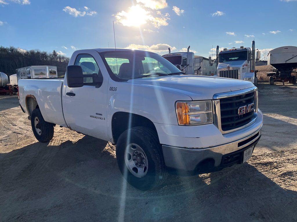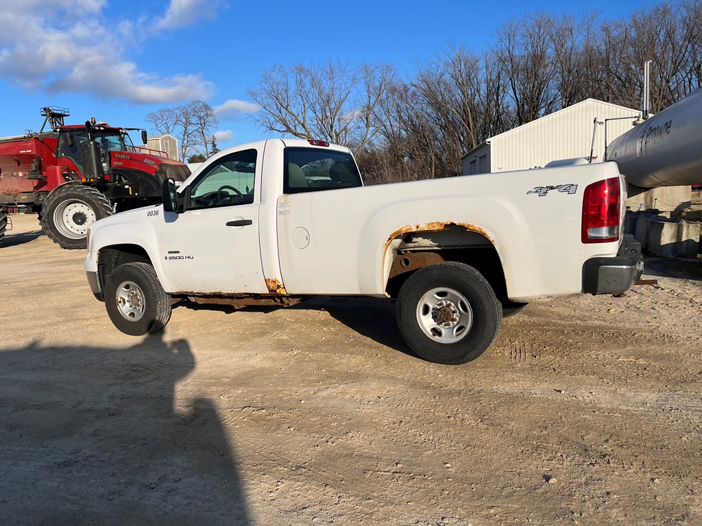 2009 GMC 2500HD Pickup (DR3573 Unit 0036), Dura Max diesel engine, Allison automatic transmission, regular cab long box, 4X4, rear ag hitch, heat/air conditioning, AM/FM CD radio, 265/75R16 tires, shows 245,464 miles.