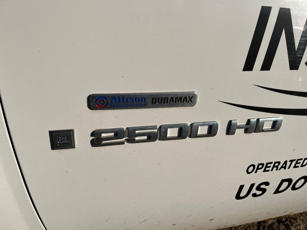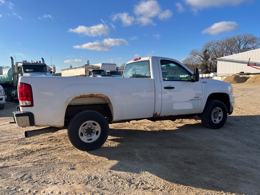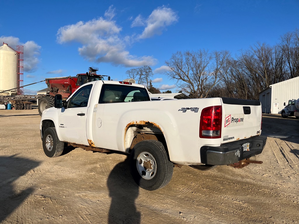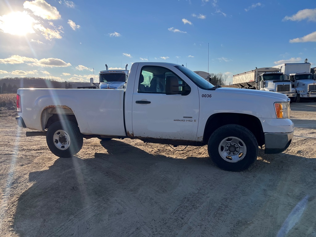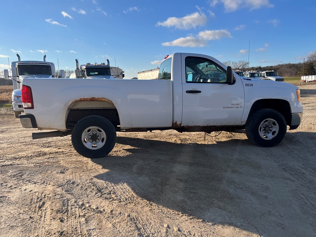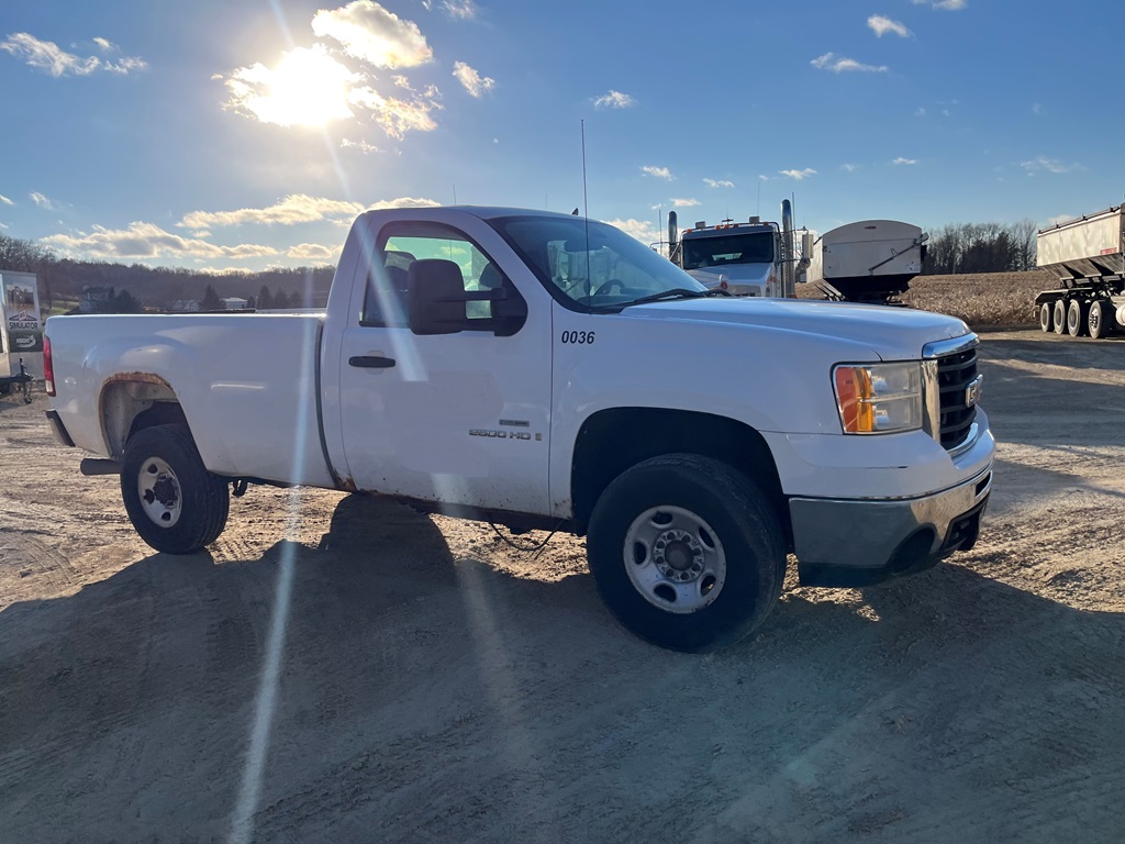 2009 GMC 2500HD Pickup (DR3573 Unit 0036), Dura Max diesel engine, Allison automatic transmission, regular cab long box, 4X4, rear ag hitch, heat/air conditioning, AM/FM CD radio, 265/75R16 tires, shows 245,464 miles.