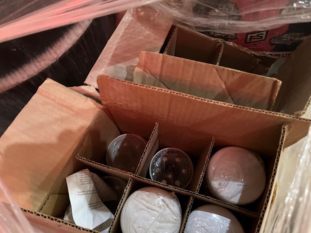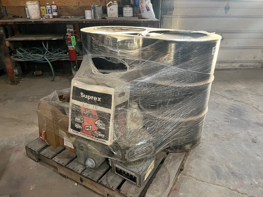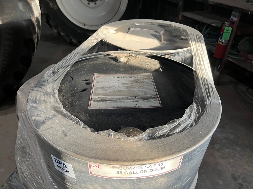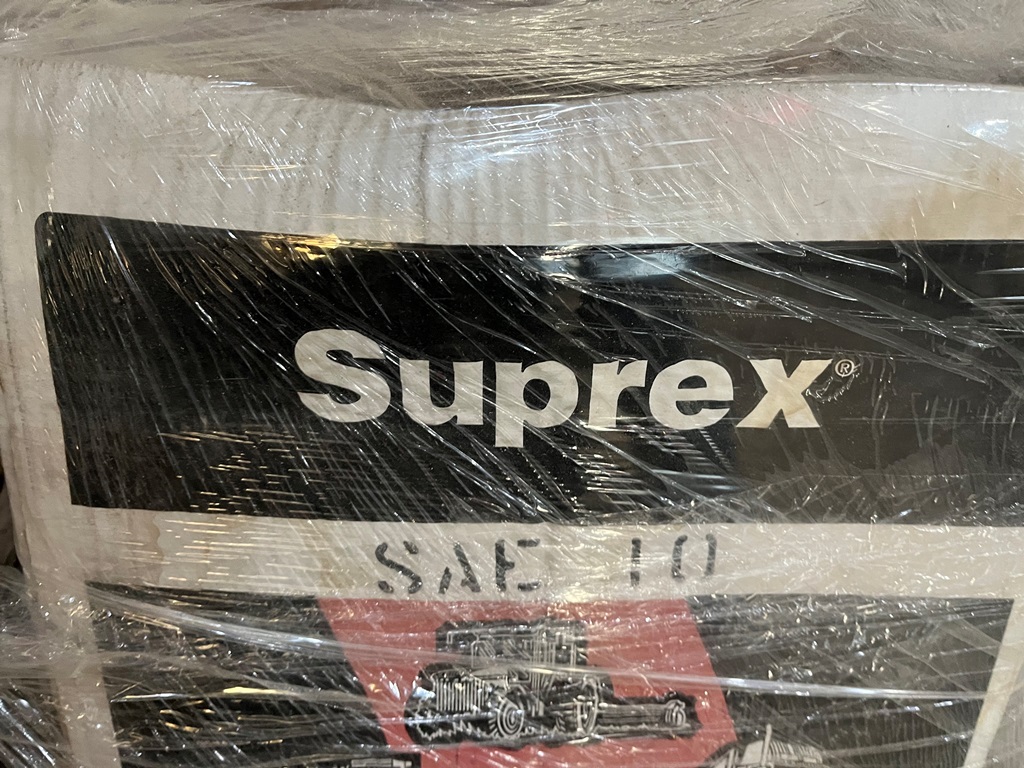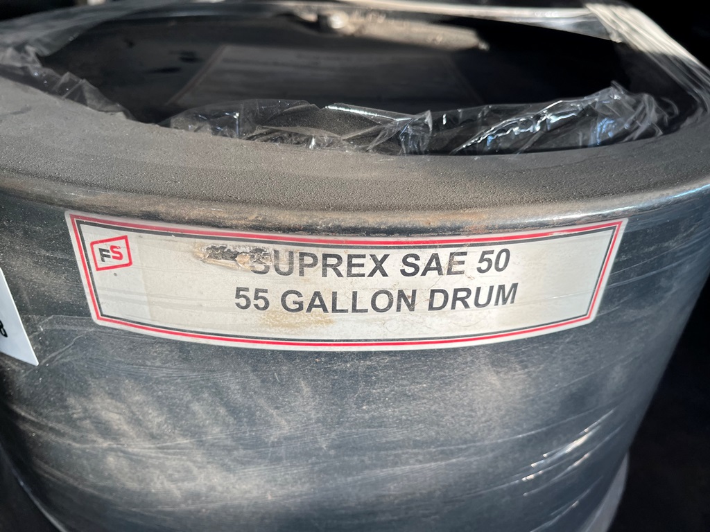 Suprex Oil (DR3578), pallet lot has (2) unopened 55 gallon drums of Suprex SAE 50 oil, 5 gallon of Suprex SAE 10 oil, assorted filters, (2) liquid meters.