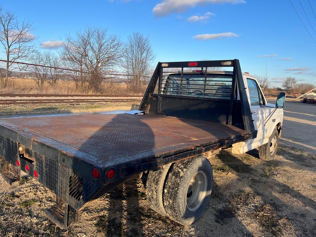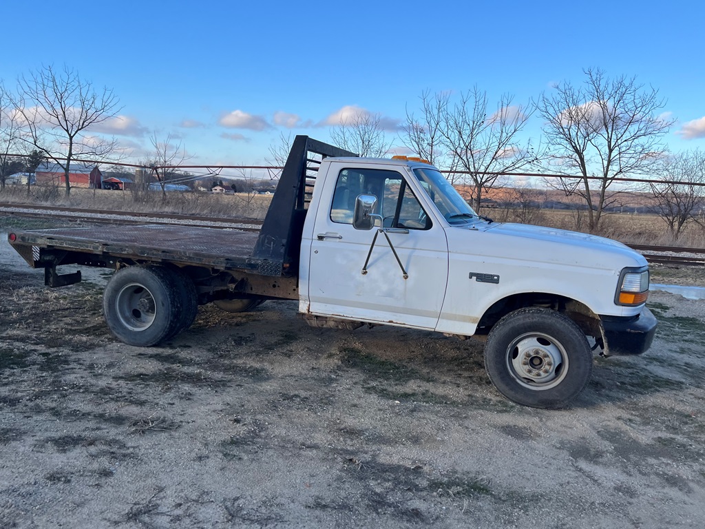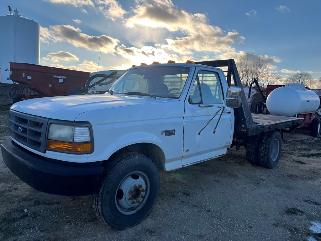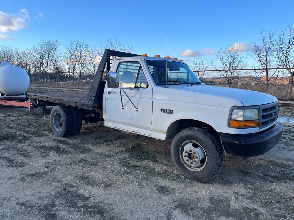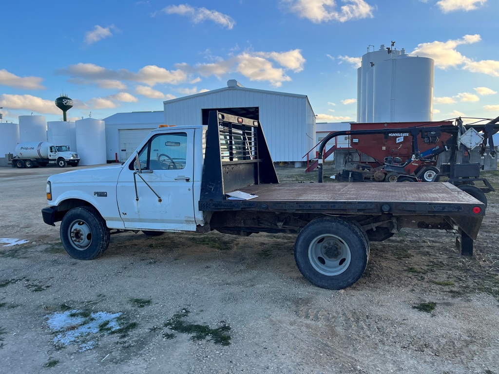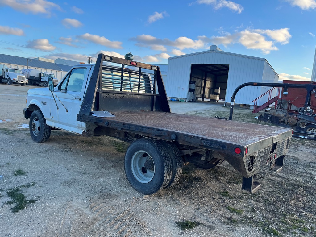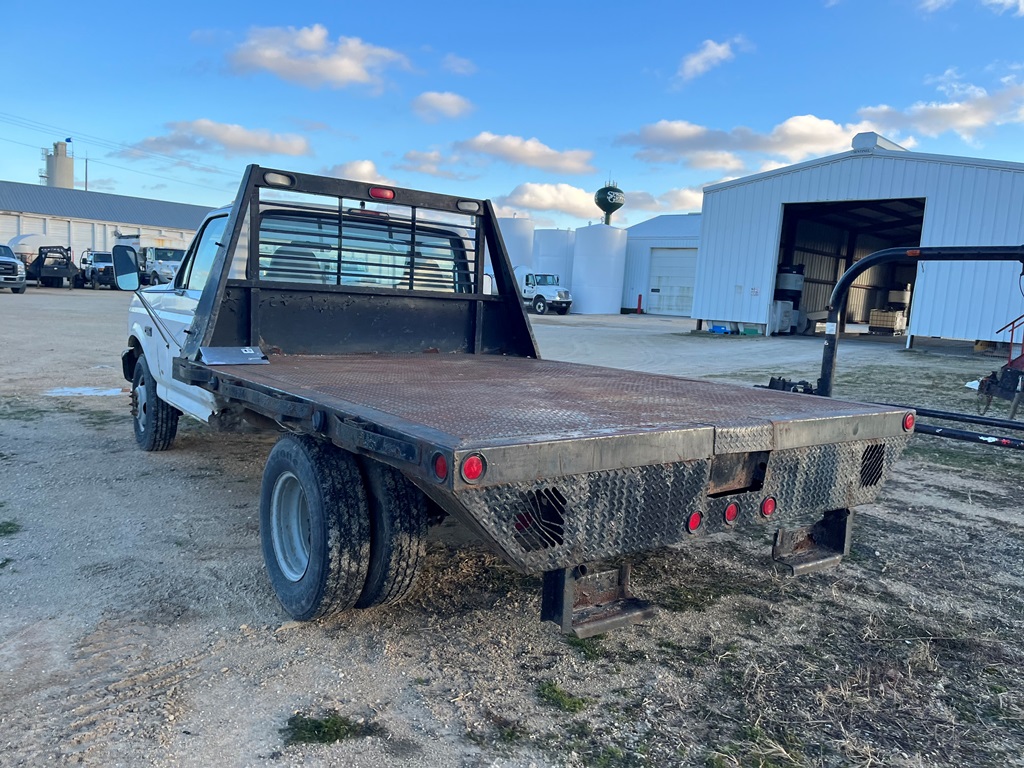 1997 Ford F350 (DR3577), gas engine, automatic transmission, dual fuel tanks, Rugby 9' steel flatbed w/headache rack, cab heat/air conditioning, 215/85R16 tires, shows 134,881 miles.