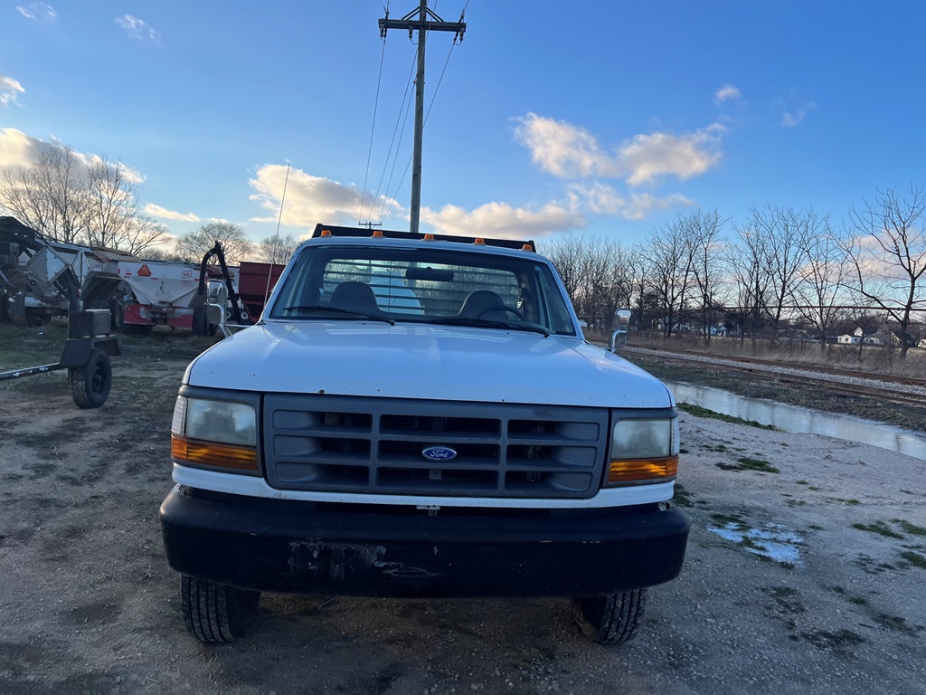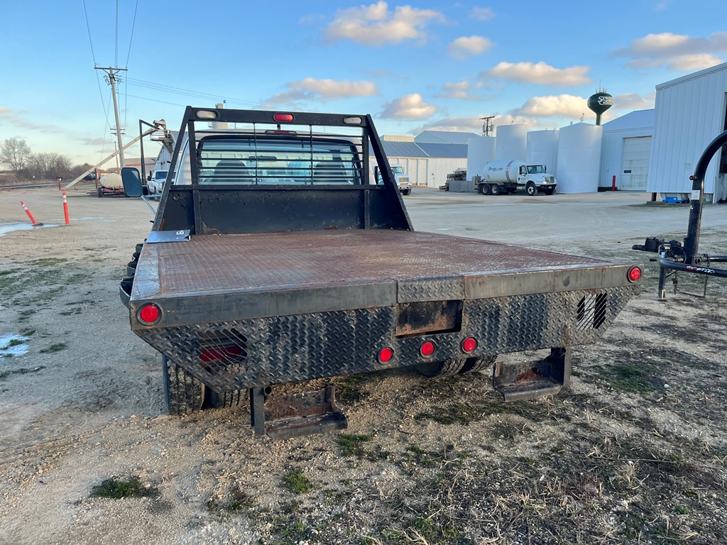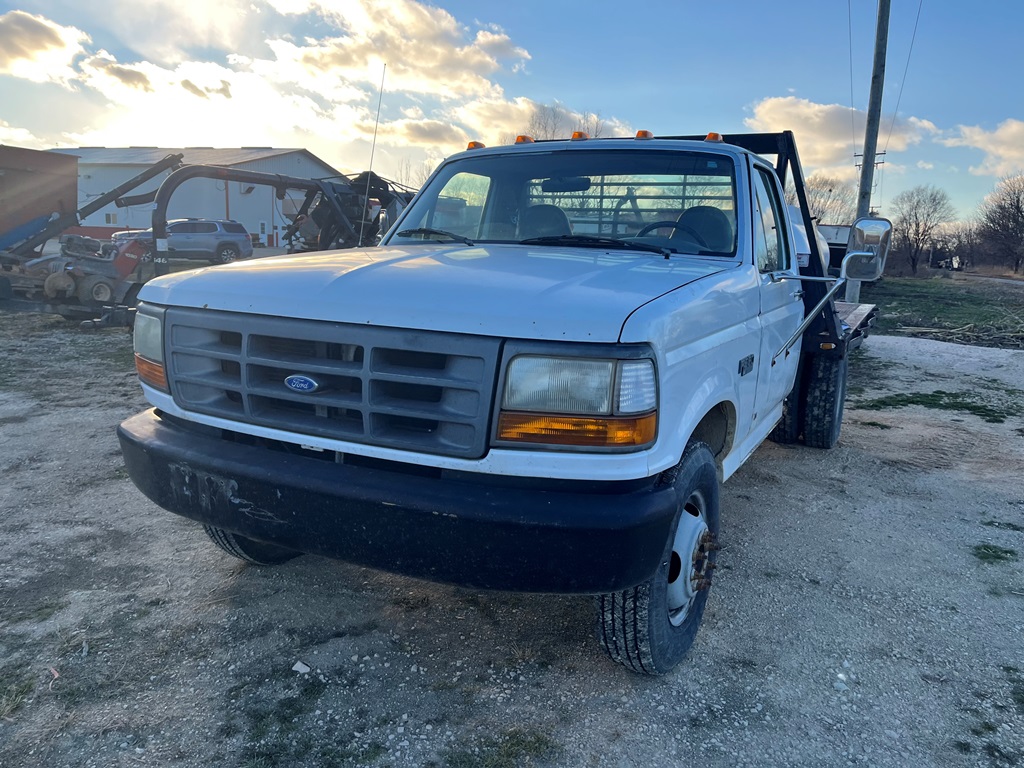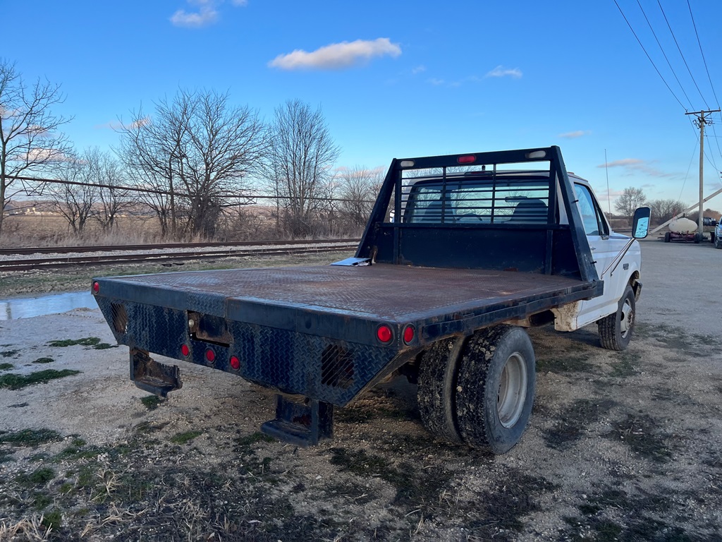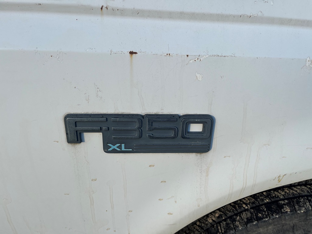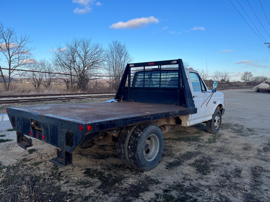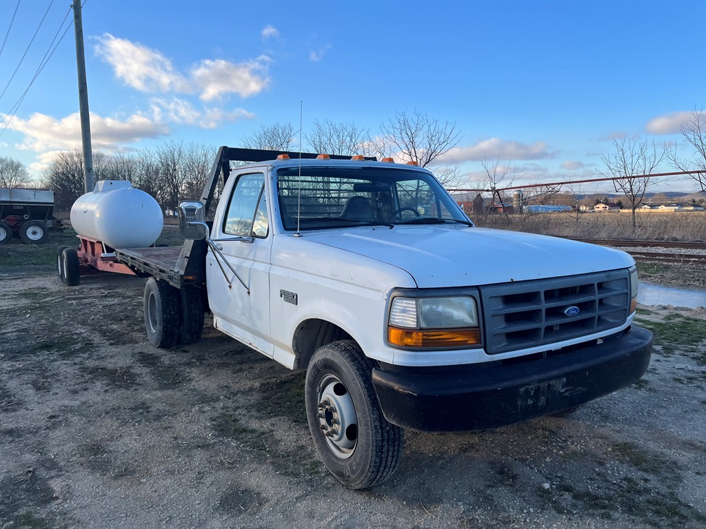 1997 Ford F350 (DR3577), gas engine, automatic transmission, dual fuel tanks, Rugby 9' steel flatbed w/headache rack, cab heat/air conditioning, 215/85R16 tires, shows 134,881 miles.