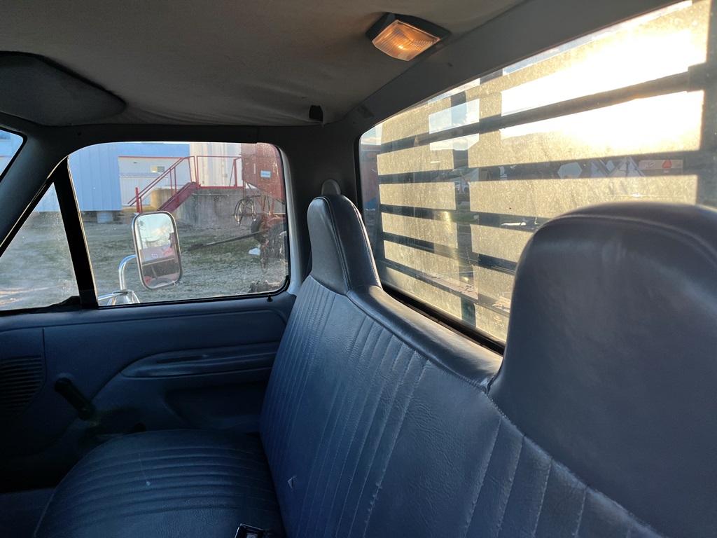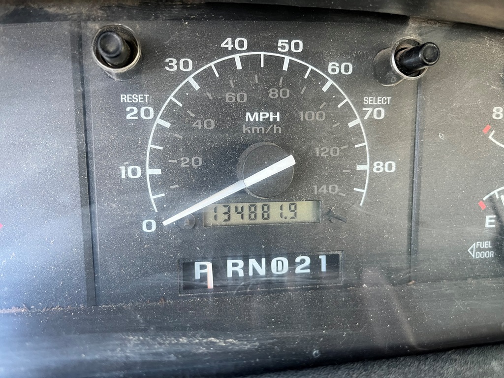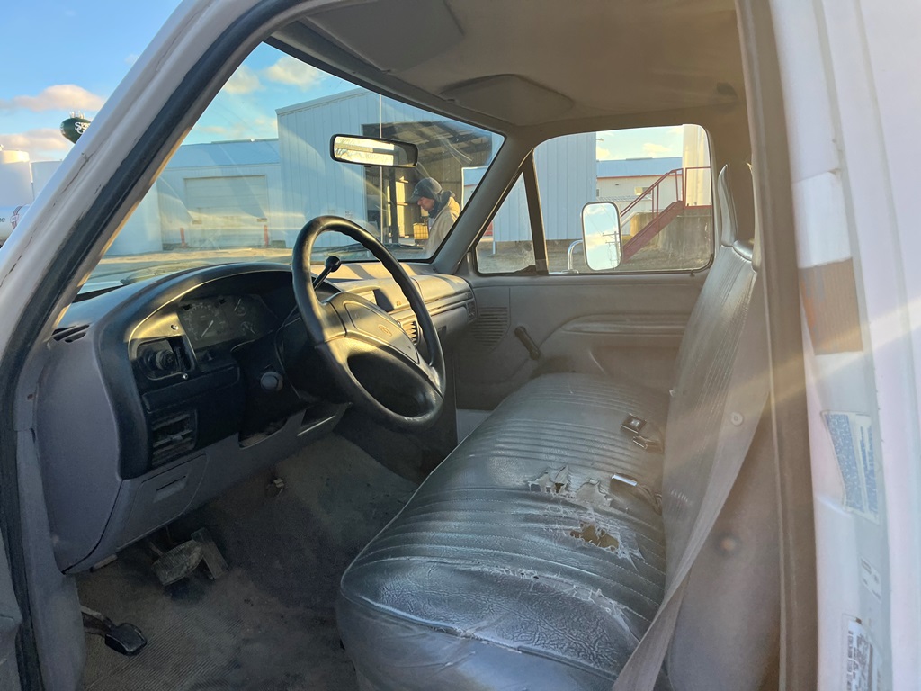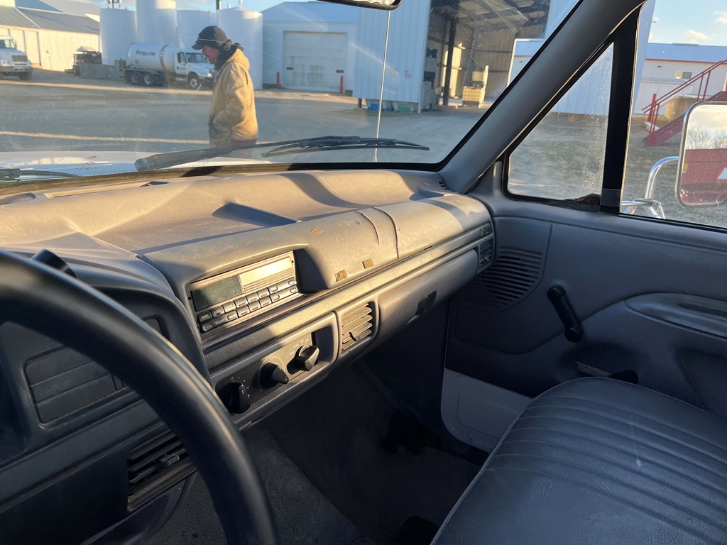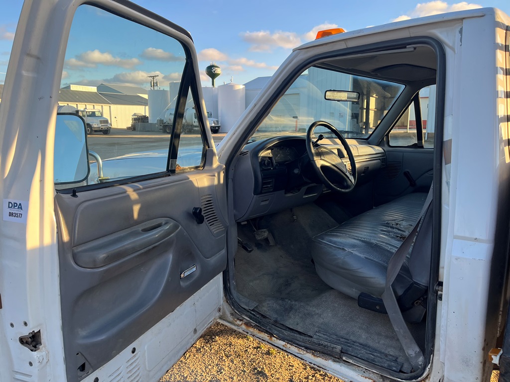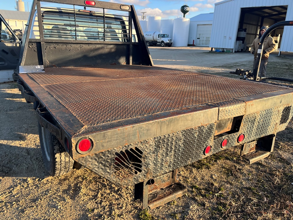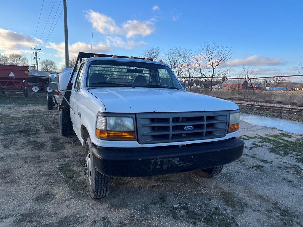 1997 Ford F350 (DR3577), gas engine, automatic transmission, dual fuel tanks, Rugby 9' steel flatbed w/headache rack, cab heat/air conditioning, 215/85R16 tires, shows 134,881 miles.