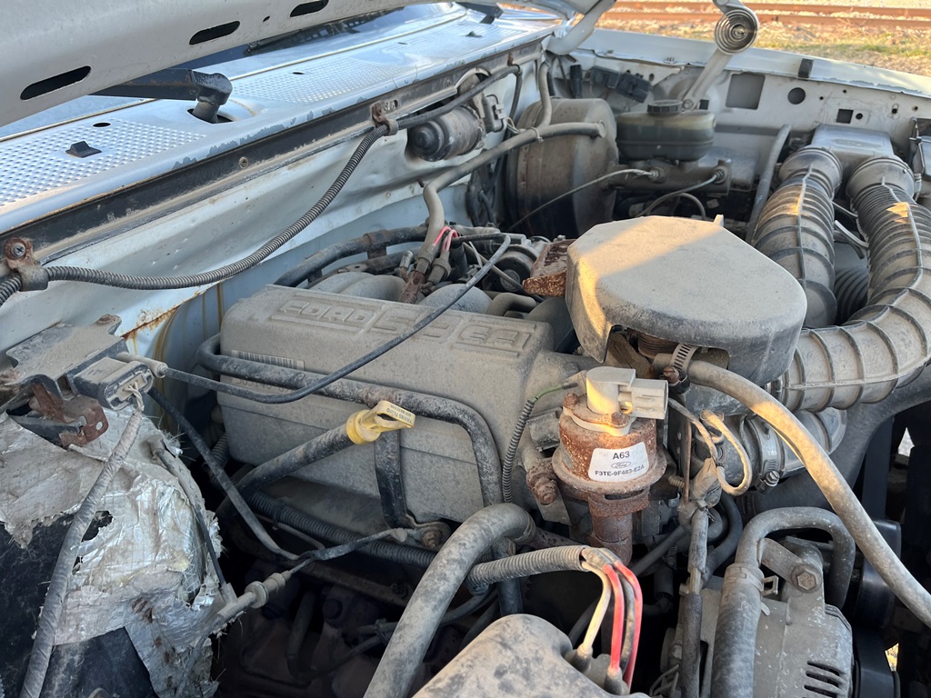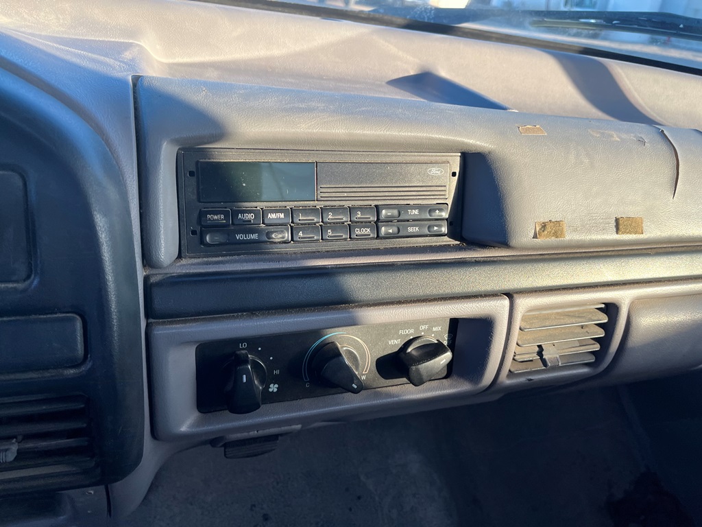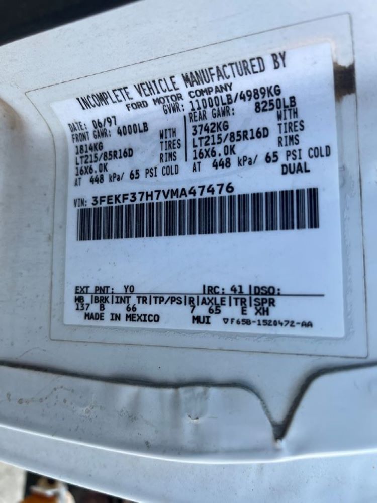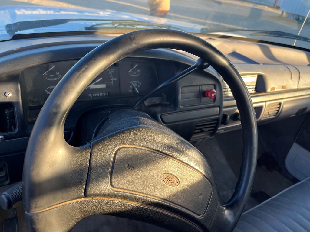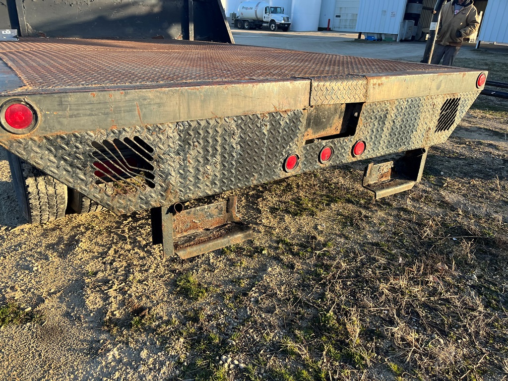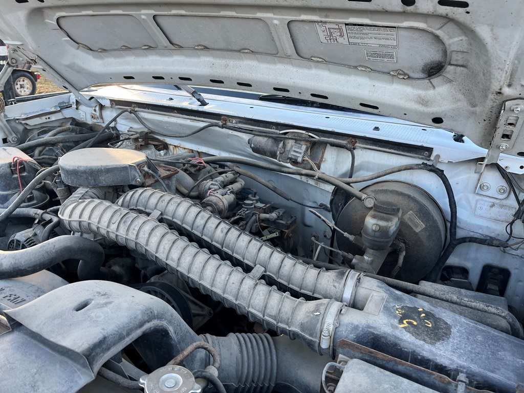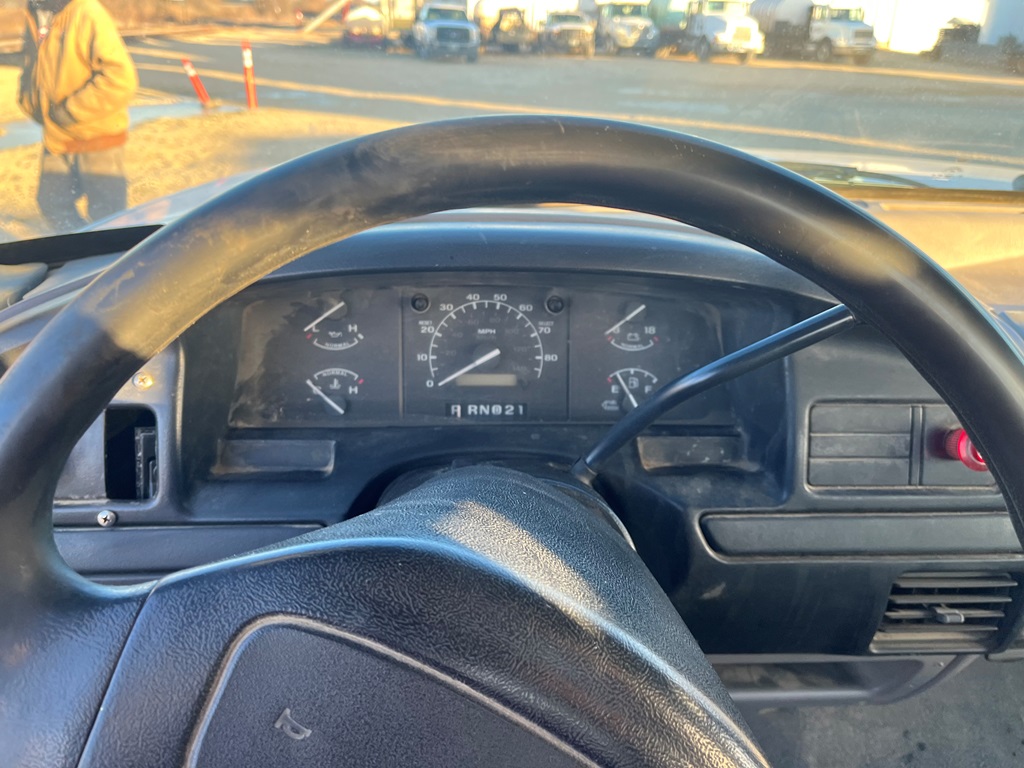 1997 Ford F350 (DR3577), gas engine, automatic transmission, dual fuel tanks, Rugby 9' steel flatbed w/headache rack, cab heat/air conditioning, 215/85R16 tires, shows 134,881 miles.