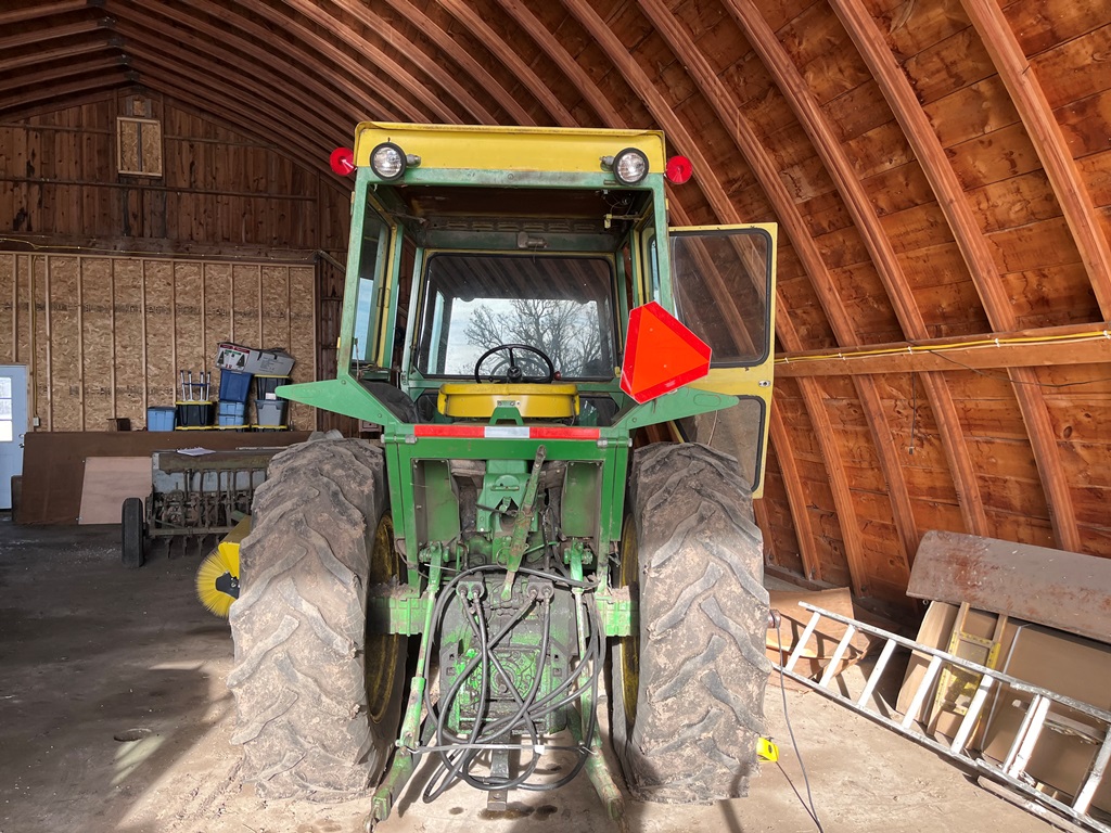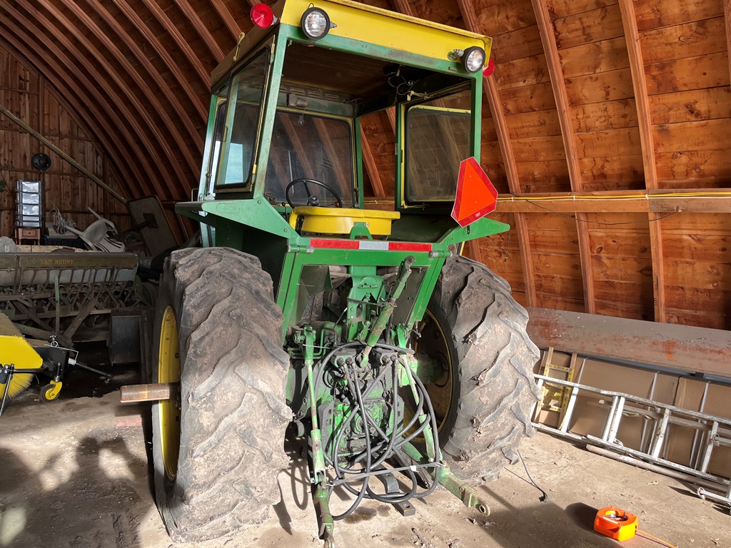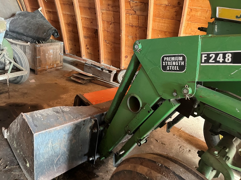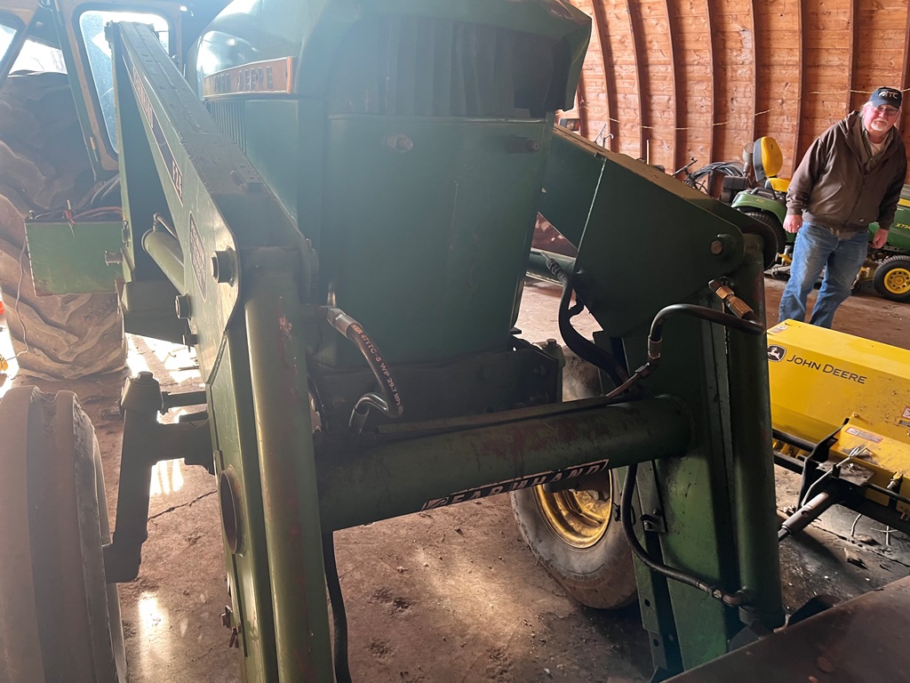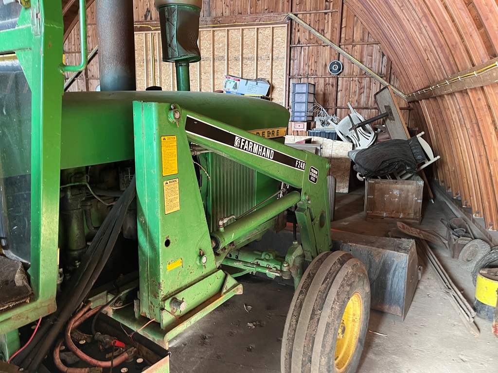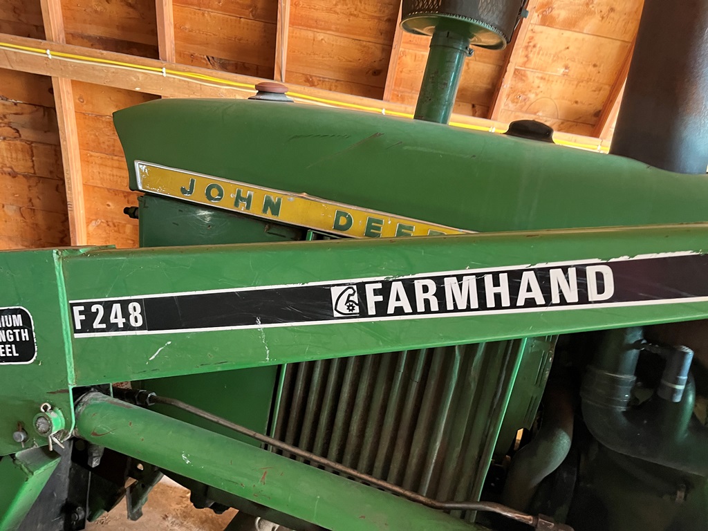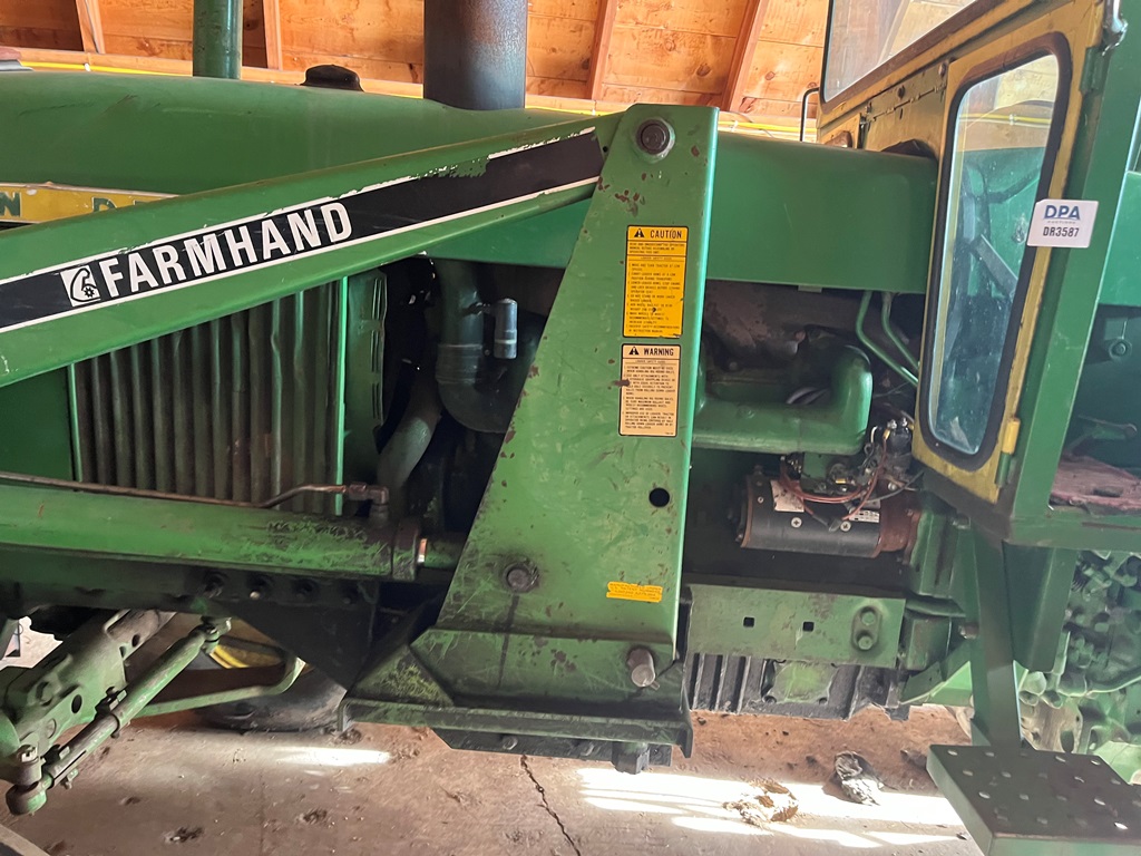 John Deere 4020 Tractor (DR3587), diesel engine, powershift transmission, Farmhand F248 hydraulic front end loader, 7' front bucket, wide front end, enclosed cab, dual hydraulic outlets, PTO, 3 point hitch, engine block heater, 18.4-34 rear tires, shows 8417 hours.