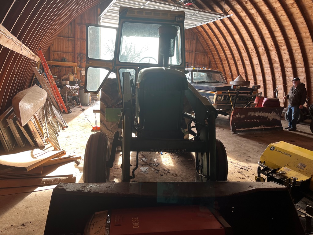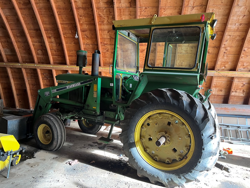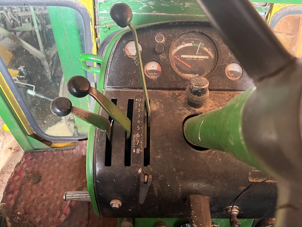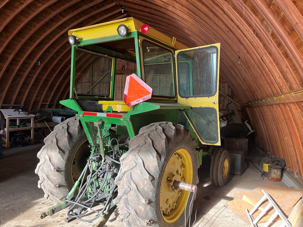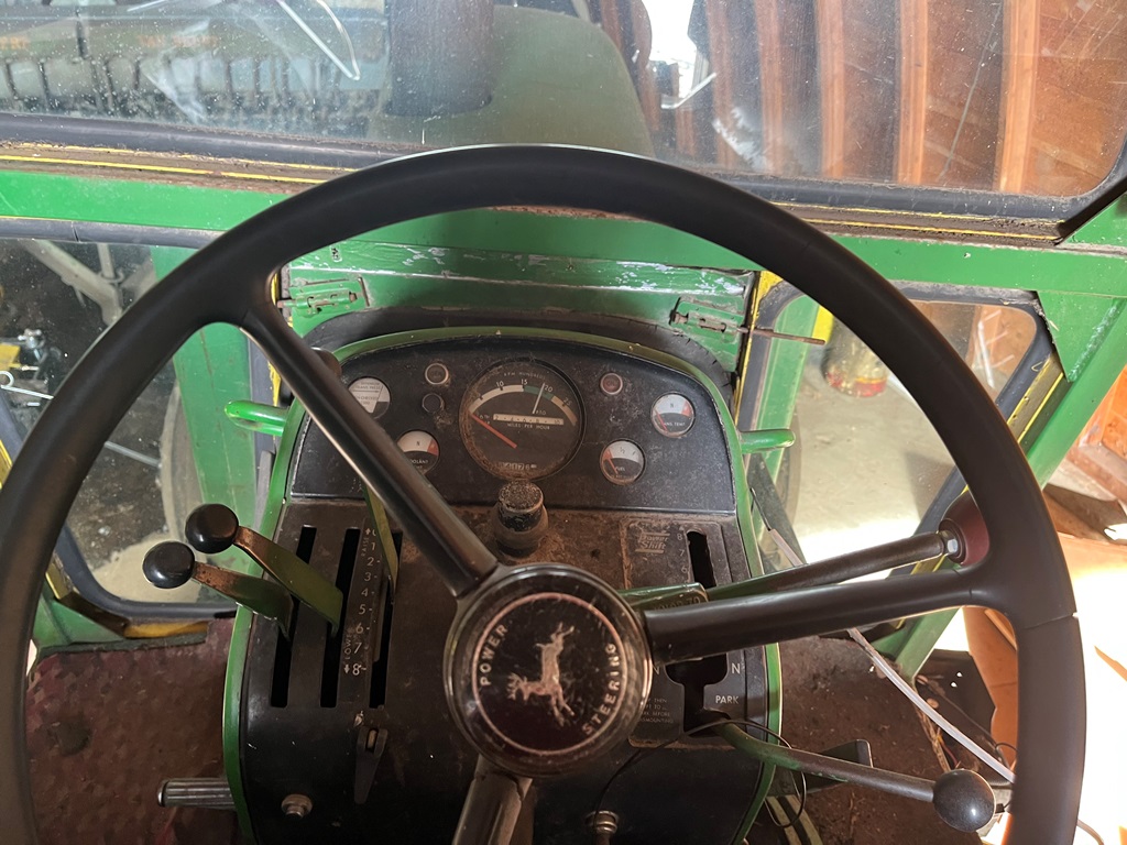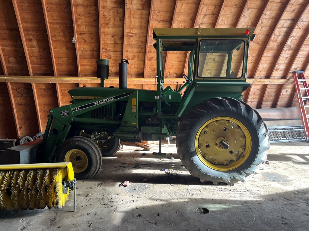 John Deere 4020 Tractor (DR3587), diesel engine, powershift transmission, Farmhand F248 hydraulic front end loader, 7' front bucket, wide front end, enclosed cab, dual hydraulic outlets, PTO, 3 point hitch, engine block heater, 18.4-34 rear tires, shows 8417 hours.