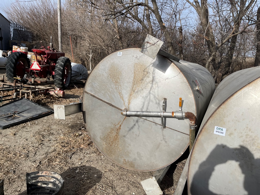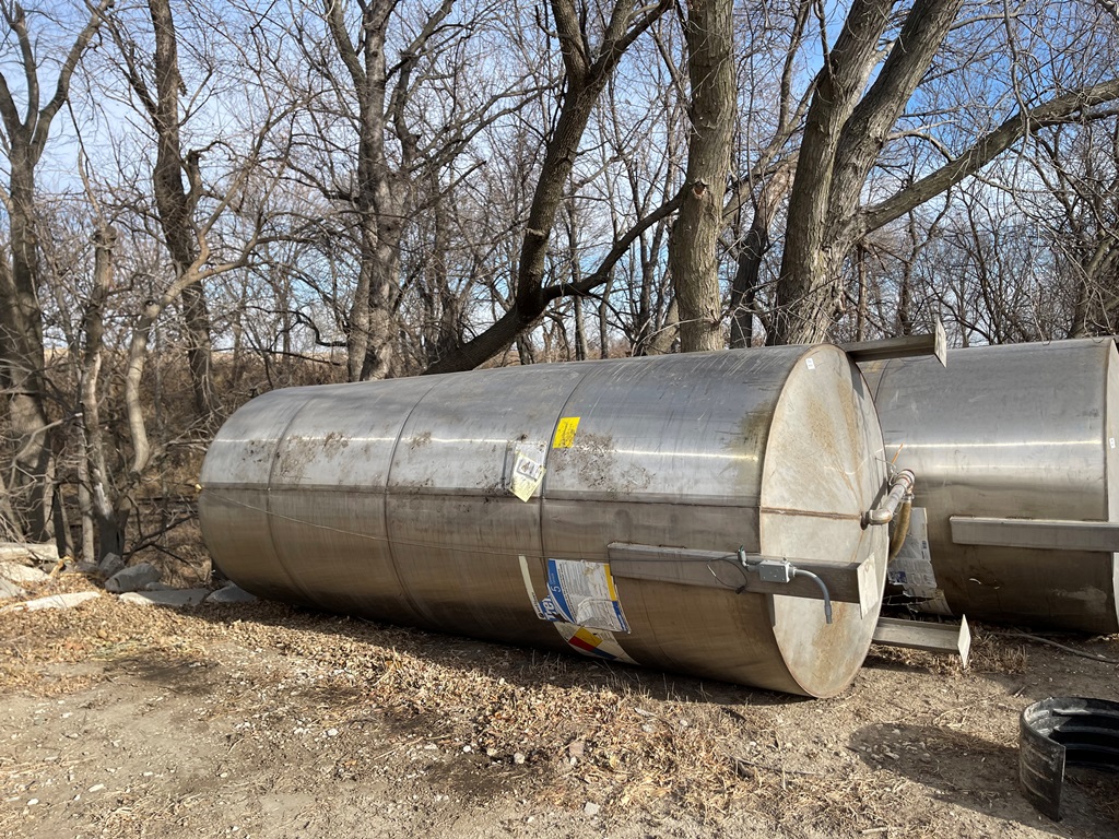 Stainless Steel Liquid Tank (DPA2382), Approx. 3,000 gallon vertical stainless steel liquid tank, stainless steel stands.