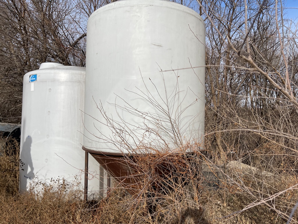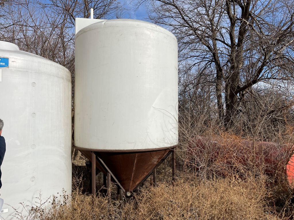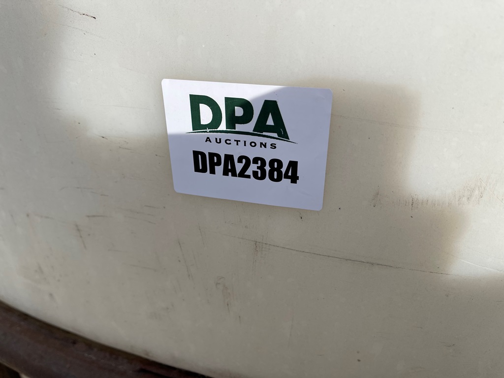 Liquid Storage Tank (DPA2384), Approx. 2,500 gallon poly cone bottom liquid storage tank, steel stands.