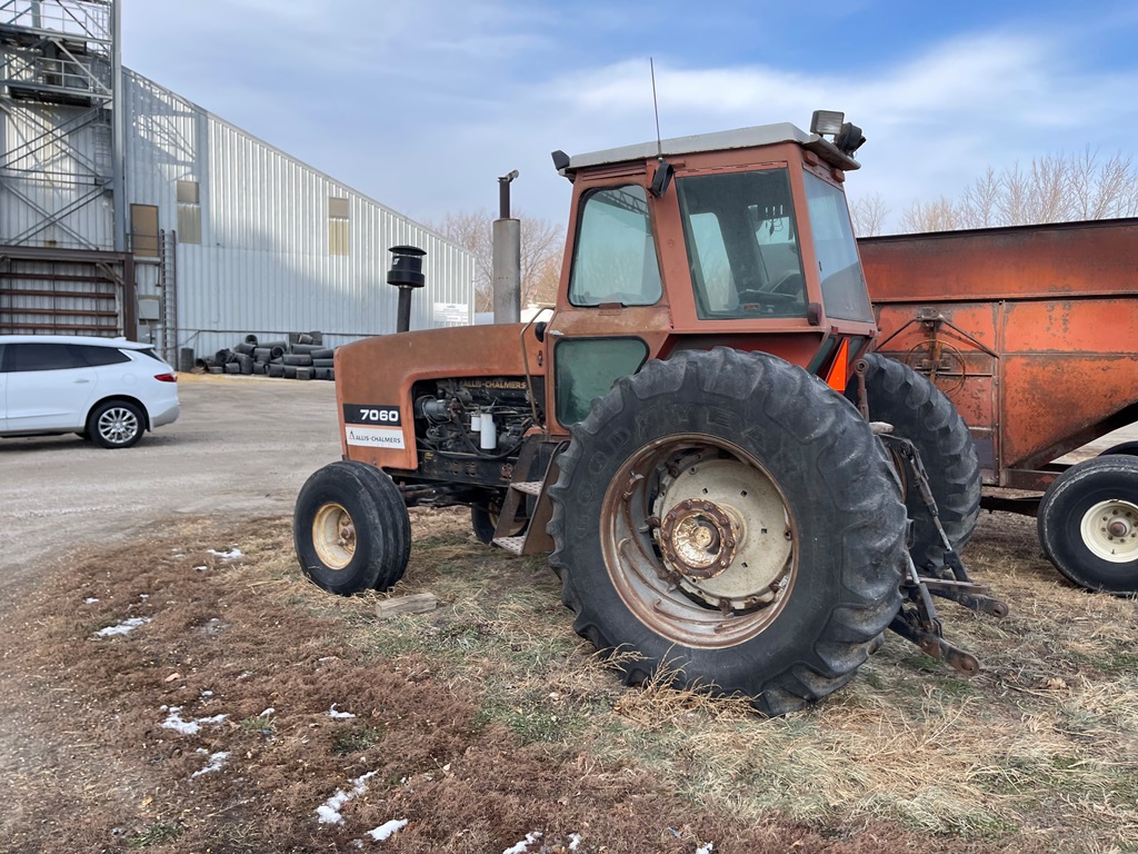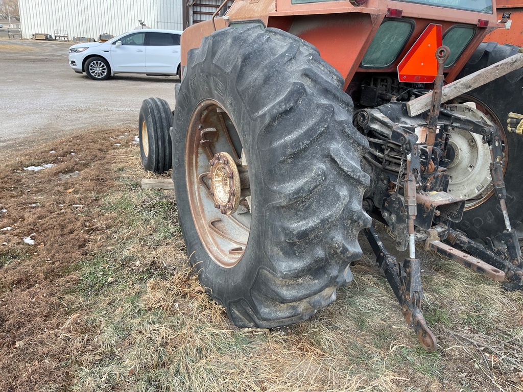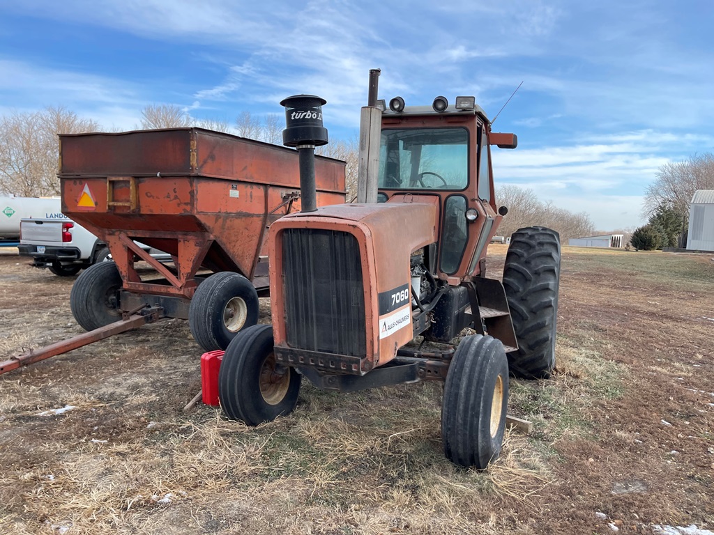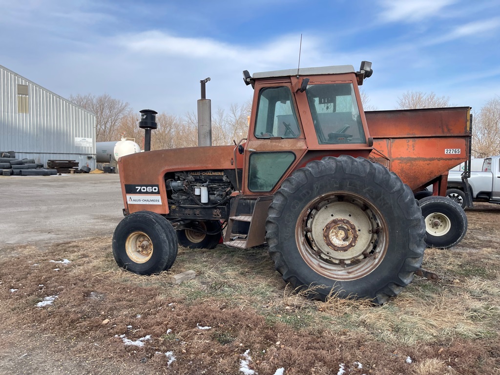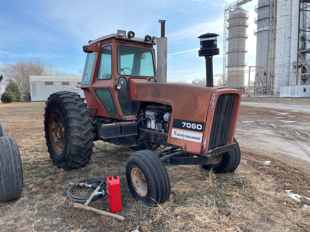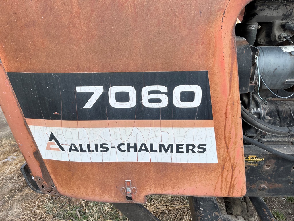 Allis - Chalmers 7060 Tractor (DPA2393), Wide front, diesel engine, cab, lights, PTO, 3-point, 3 port hydraulics, 11.00-16 front tires, 20.8R38 rear tires, shows 1,820 hours.