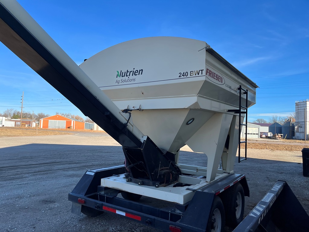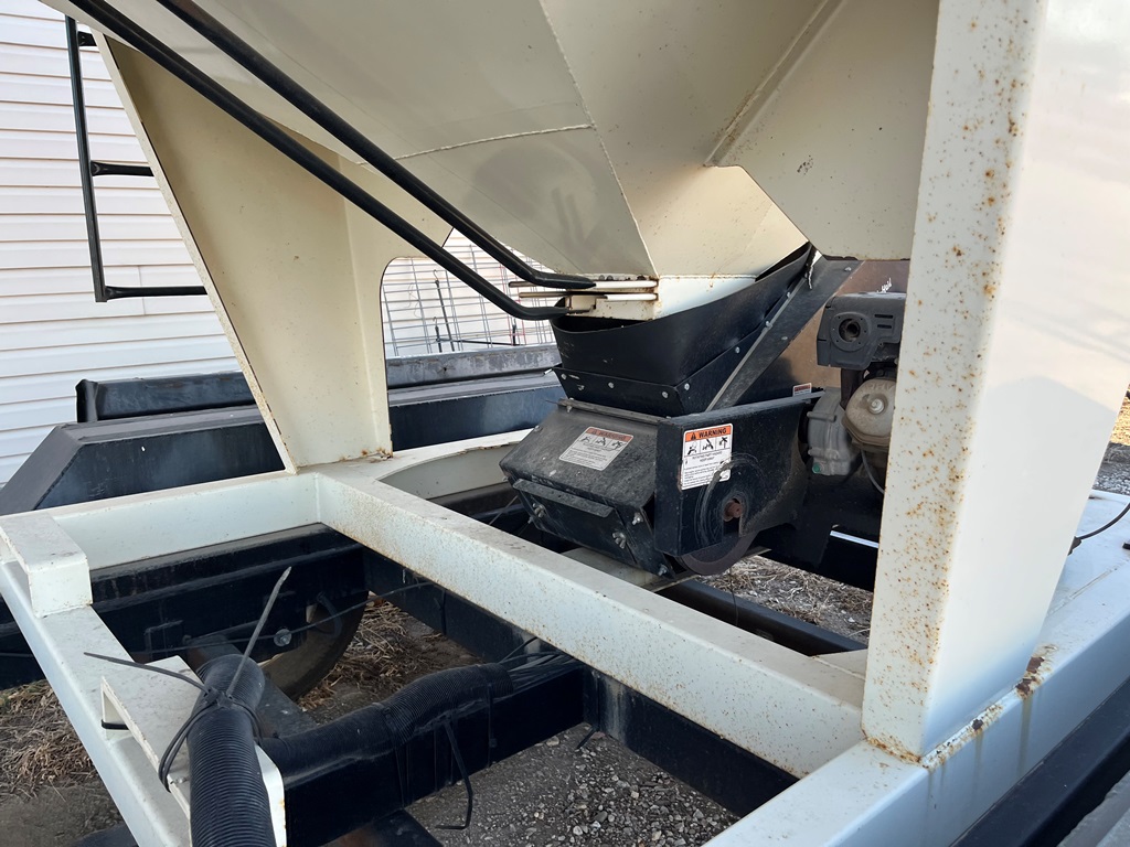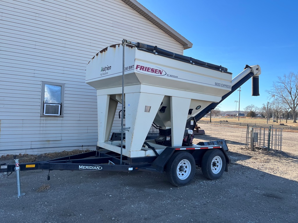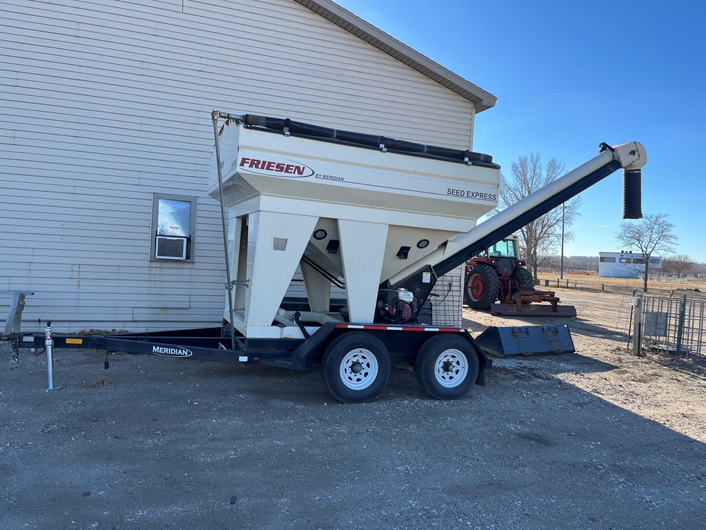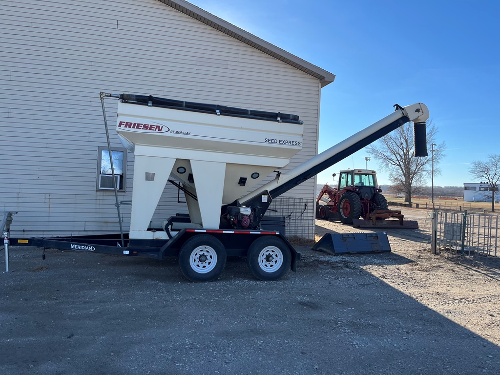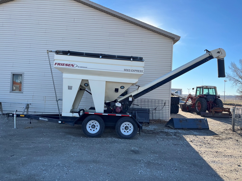 2003 Friesen Seed Tender (DR3384 Unit 88623), model 240BWT Seed Express seed tender, self contained hydraulics, gas engine w/electric start, 2 compartment, rear swing discharge conveyor, sight glass windows, sample door, roll over tarp, 235/80R16 tires.