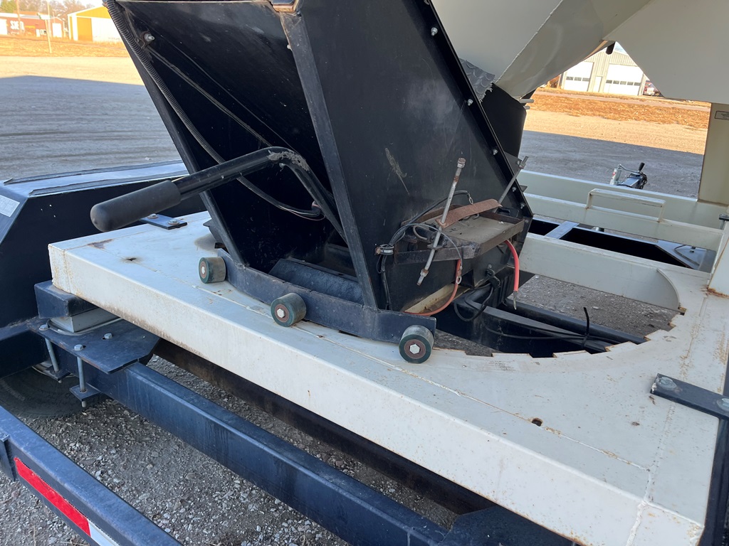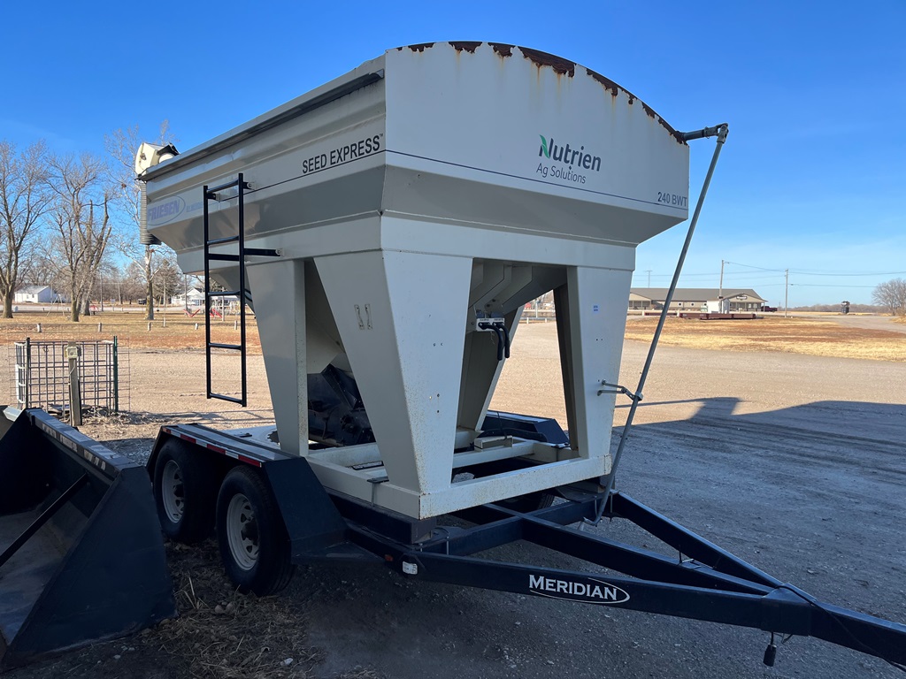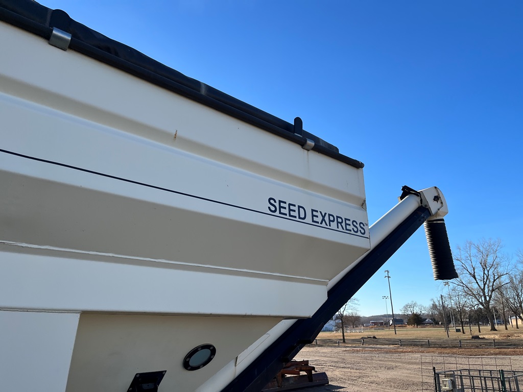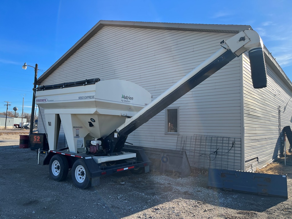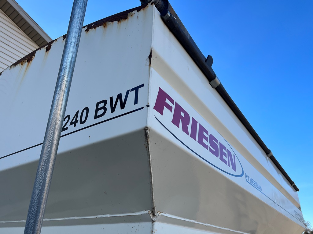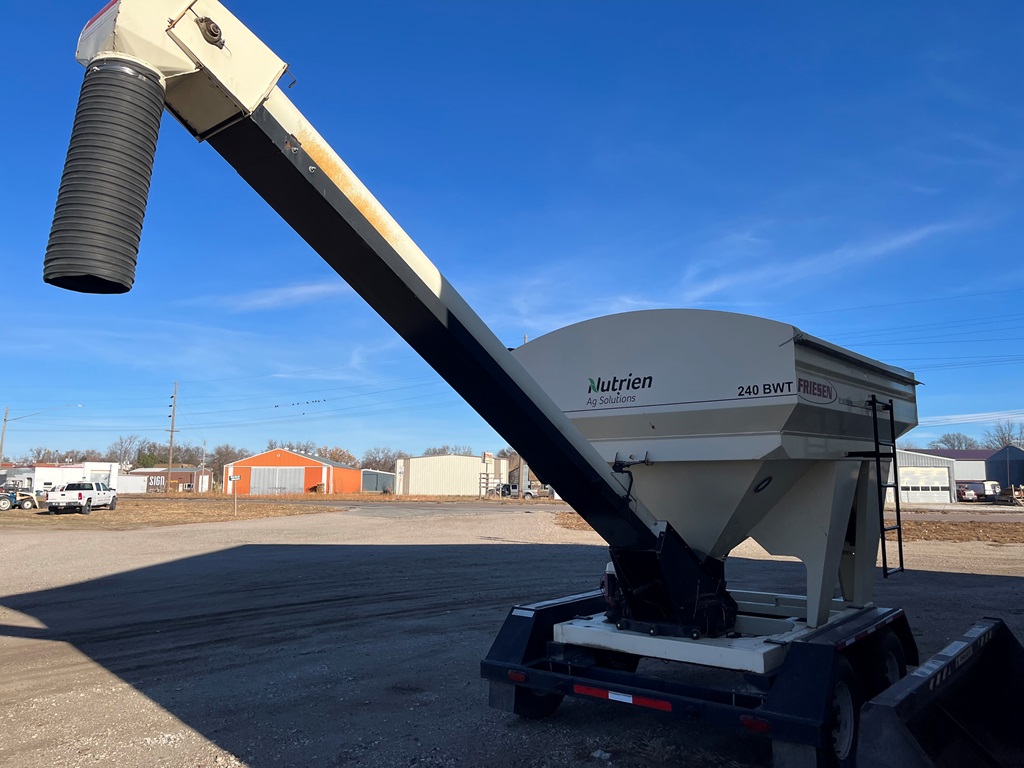 2003 Friesen Seed Tender (DR3384 Unit 88623), model 240BWT Seed Express seed tender, self contained hydraulics, gas engine w/electric start, 2 compartment, rear swing discharge conveyor, sight glass windows, sample door, roll over tarp, 235/80R16 tires.