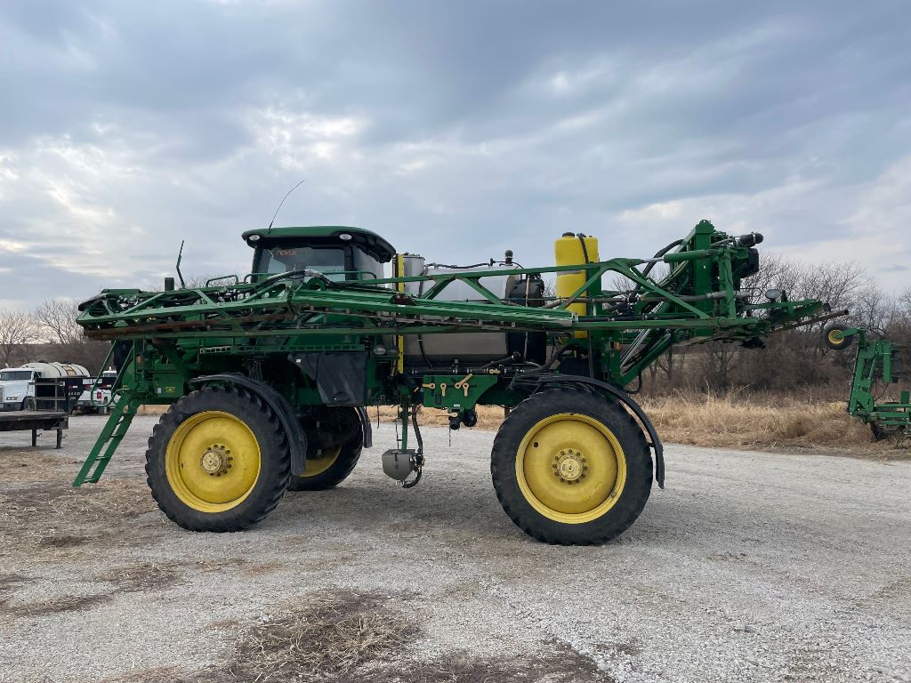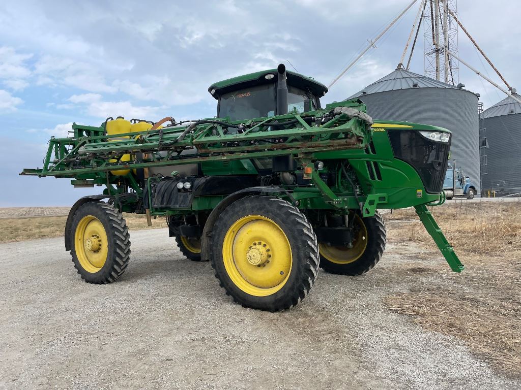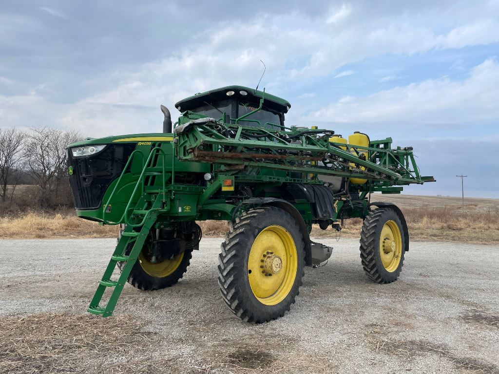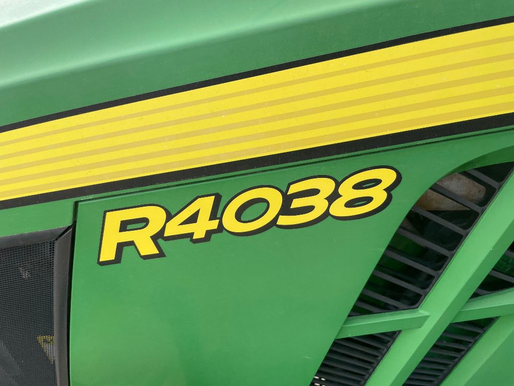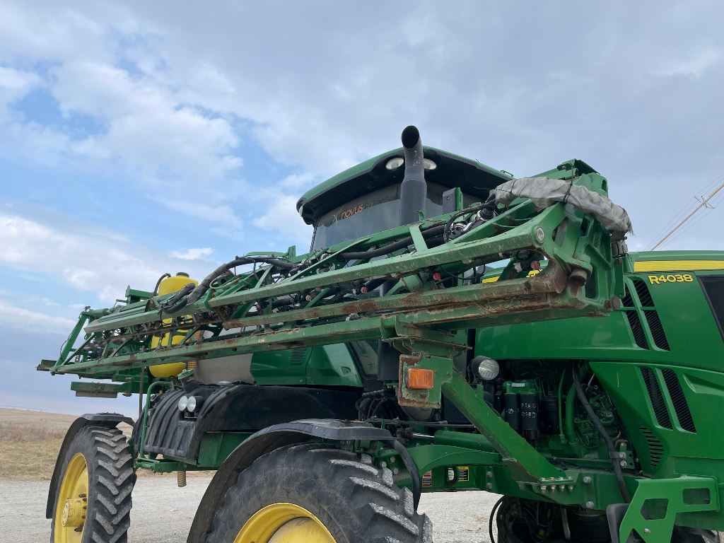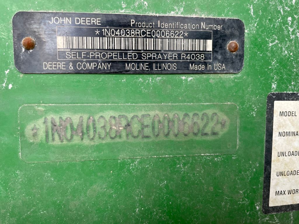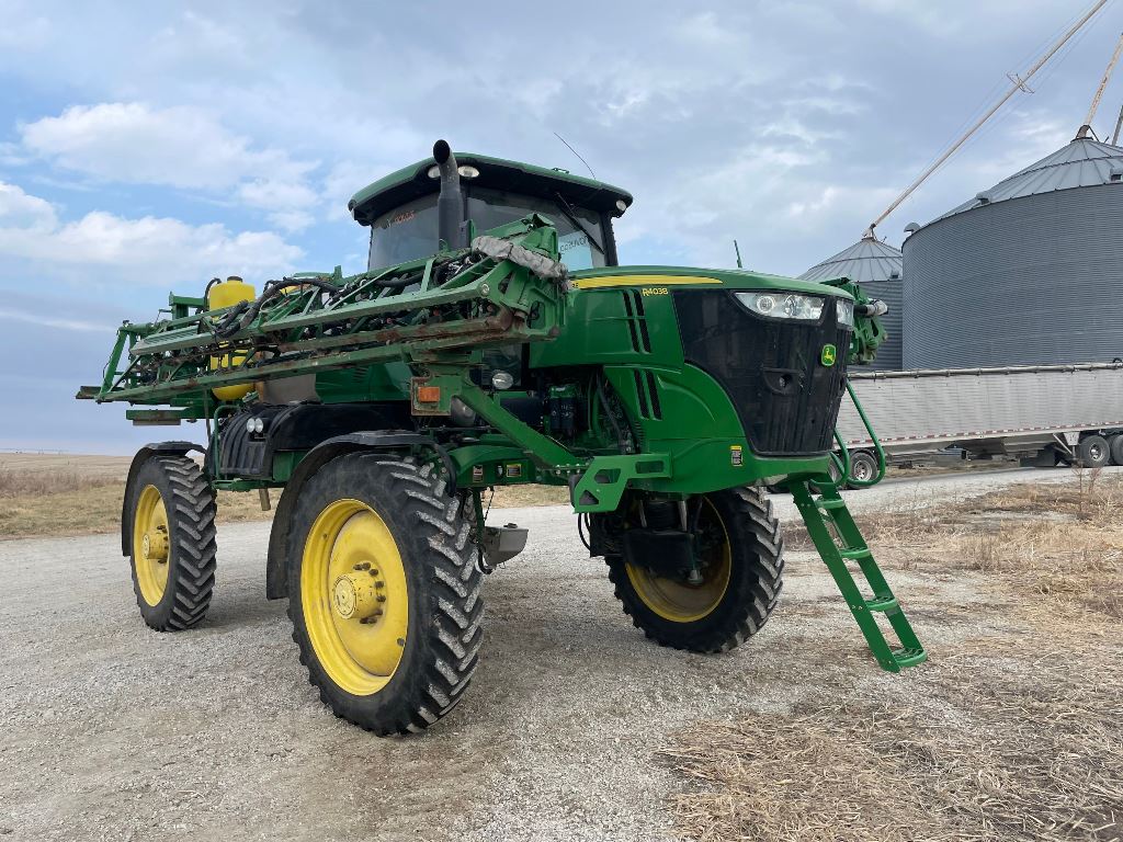 2015 John Deere R4038 Sprayer (GP2377), John Deere diesel engine (S/N RG6090U012331, hydrostatic transmission, air conditioning, heat, Am/Fm radio, 1000 gallon stainless steel liquid system, 100' boom, rear poly fresh water tank, stainless steel chemical inductor, 4 - Direct poly injection tanks, 2 - Raven Sidekick Pro pumps, Michelin Spraybib VF 380/90R46 tires, fenders, John Deere monitor, shows 3,279 hours.