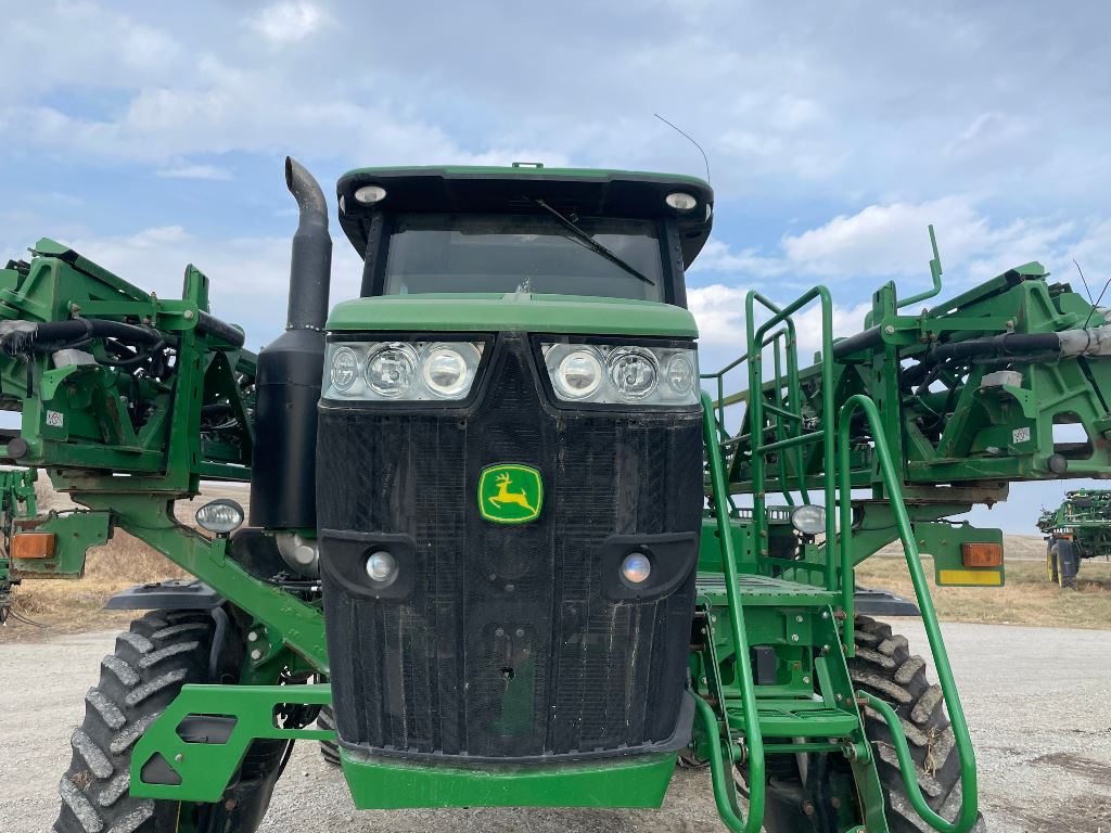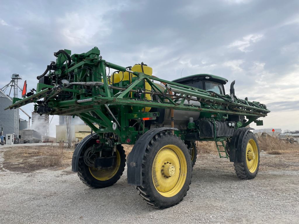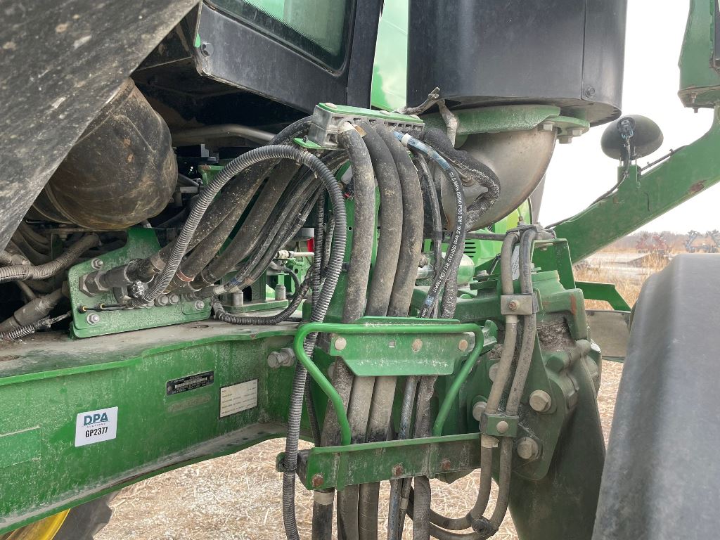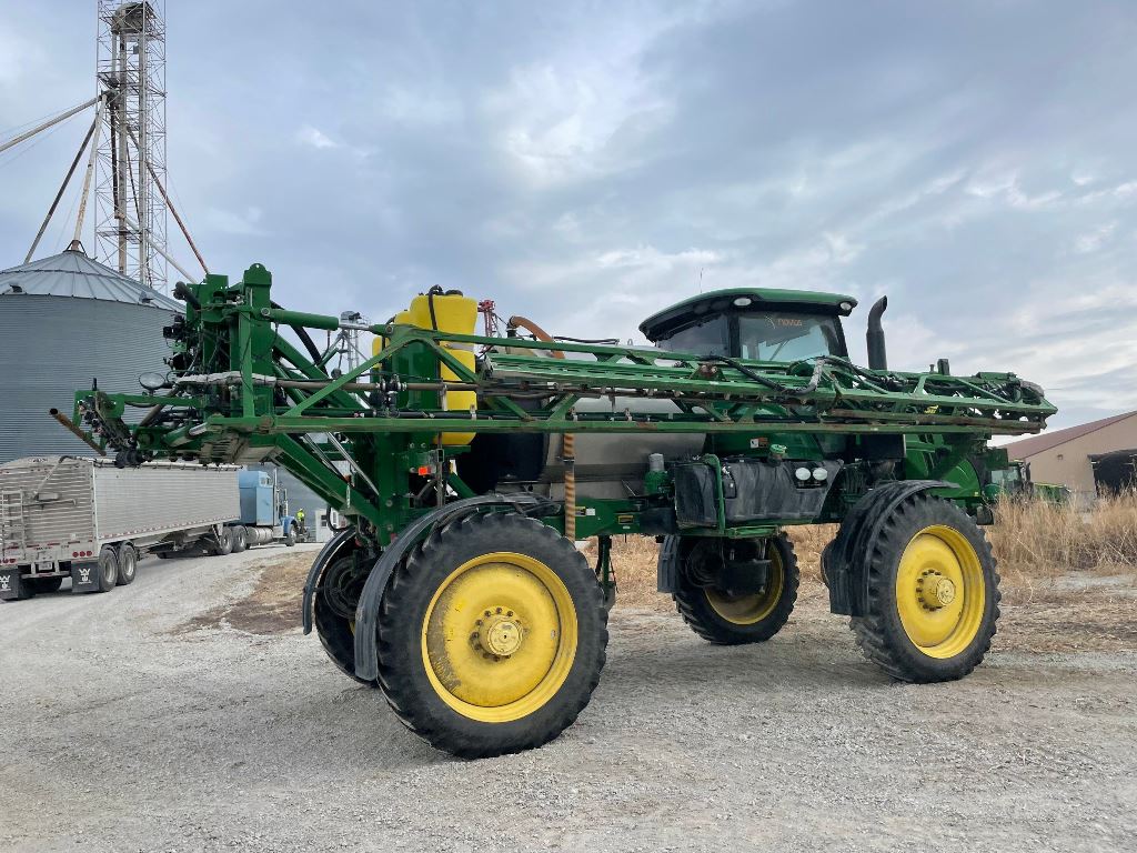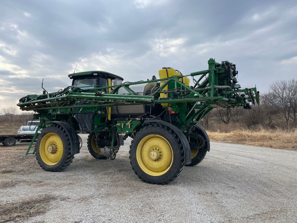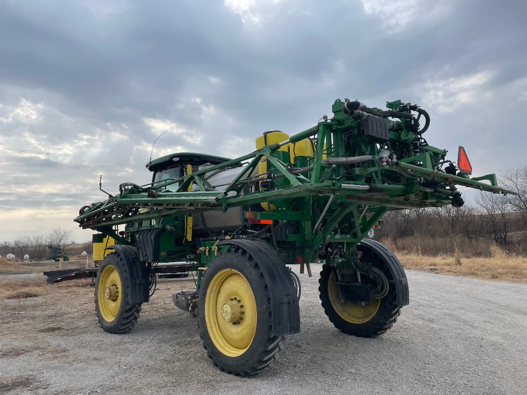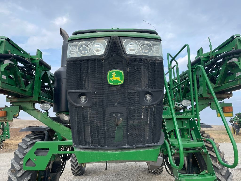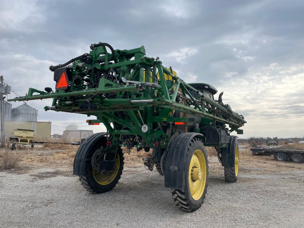 2015 John Deere R4038 Sprayer (GP2377), John Deere diesel engine (S/N RG6090U012331, hydrostatic transmission, air conditioning, heat, Am/Fm radio, 1000 gallon stainless steel liquid system, 100' boom, rear poly fresh water tank, stainless steel chemical inductor, 4 - Direct poly injection tanks, 2 - Raven Sidekick Pro pumps, Michelin Spraybib VF 380/90R46 tires, fenders, John Deere monitor, shows 3,279 hours.