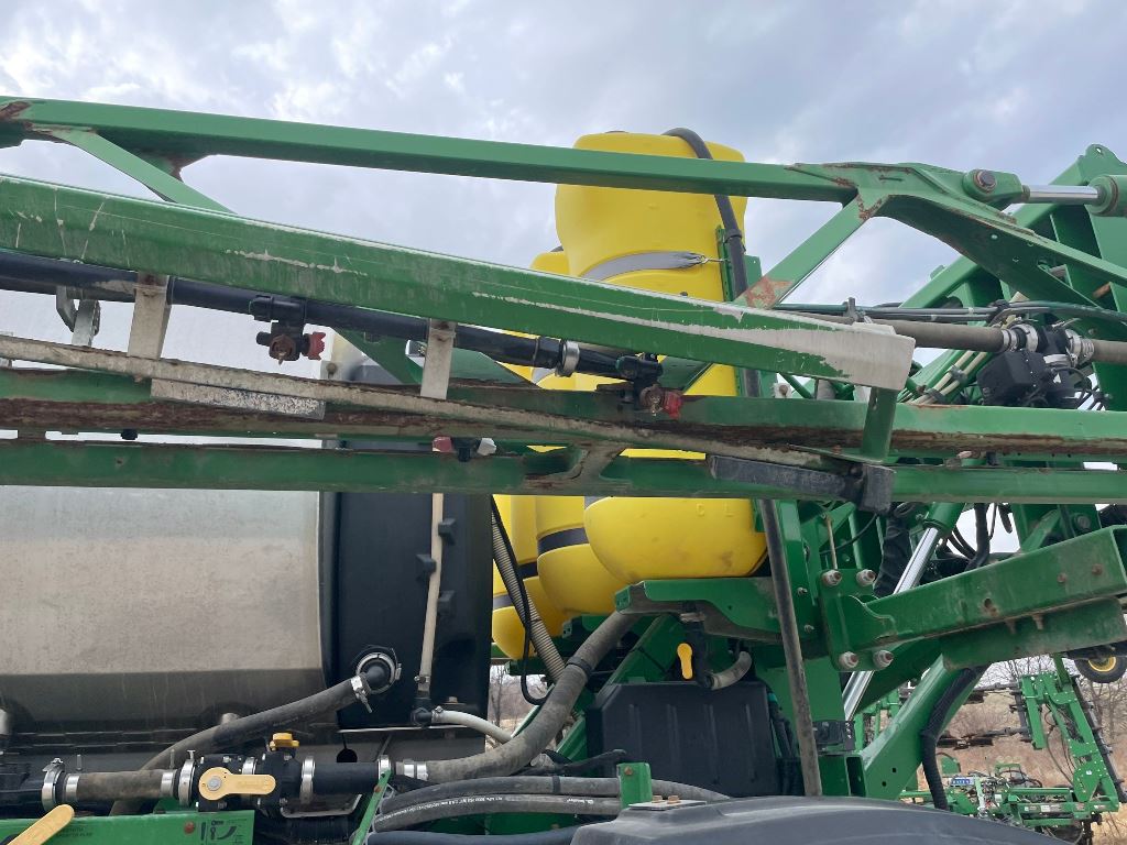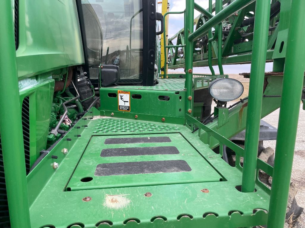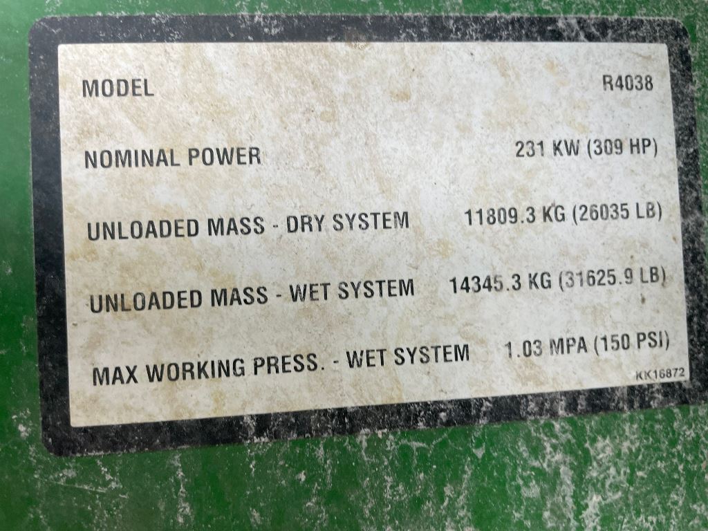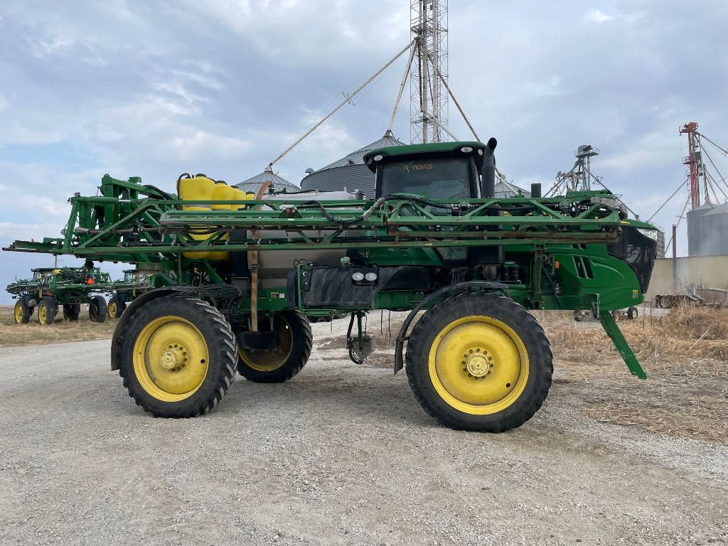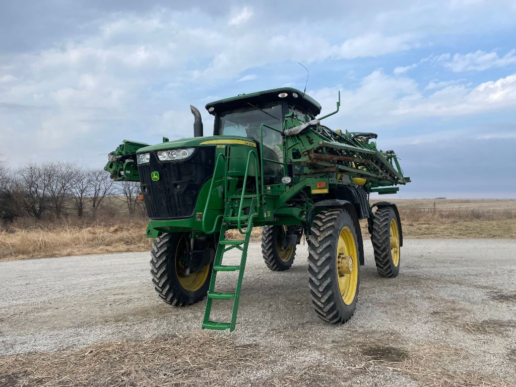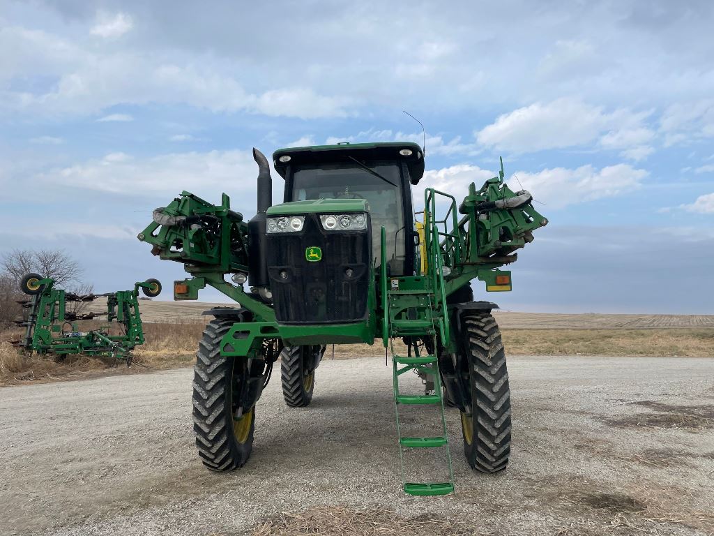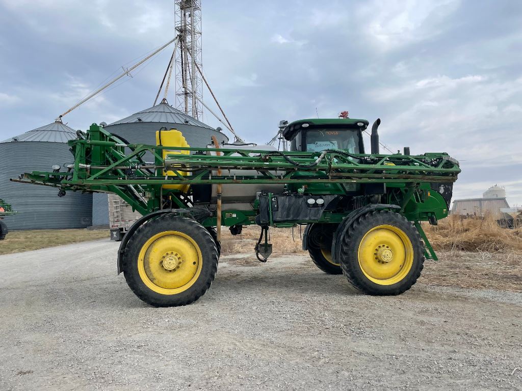 2015 John Deere R4038 Sprayer (GP2377), John Deere diesel engine (S/N RG6090U012331, hydrostatic transmission, air conditioning, heat, Am/Fm radio, 1000 gallon stainless steel liquid system, 100' boom, rear poly fresh water tank, stainless steel chemical inductor, 4 - Direct poly injection tanks, 2 - Raven Sidekick Pro pumps, Michelin Spraybib VF 380/90R46 tires, fenders, John Deere monitor, shows 3,279 hours.