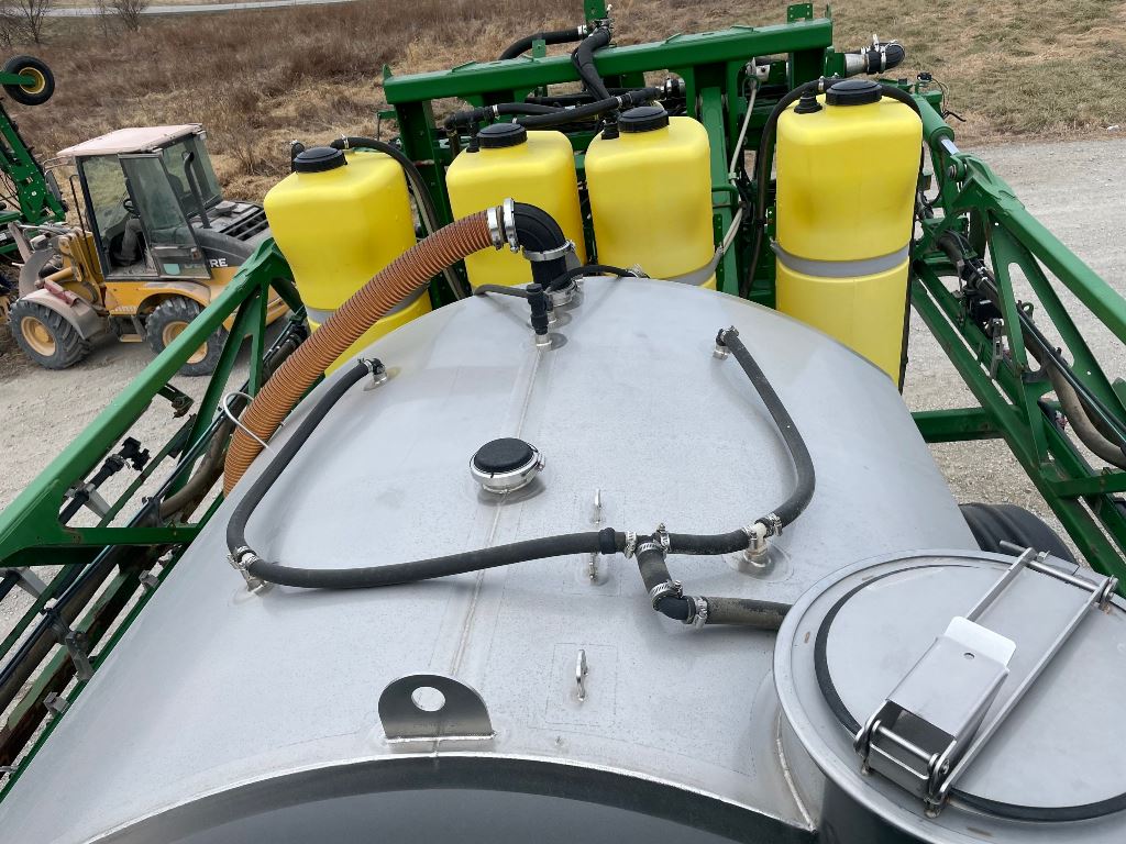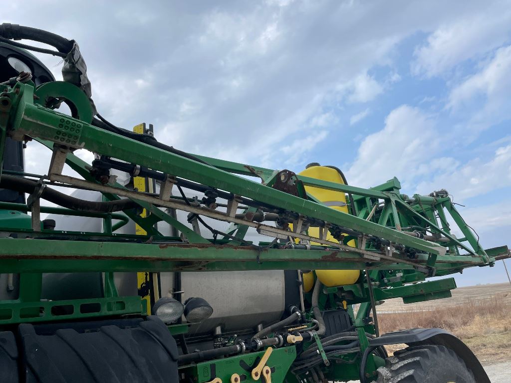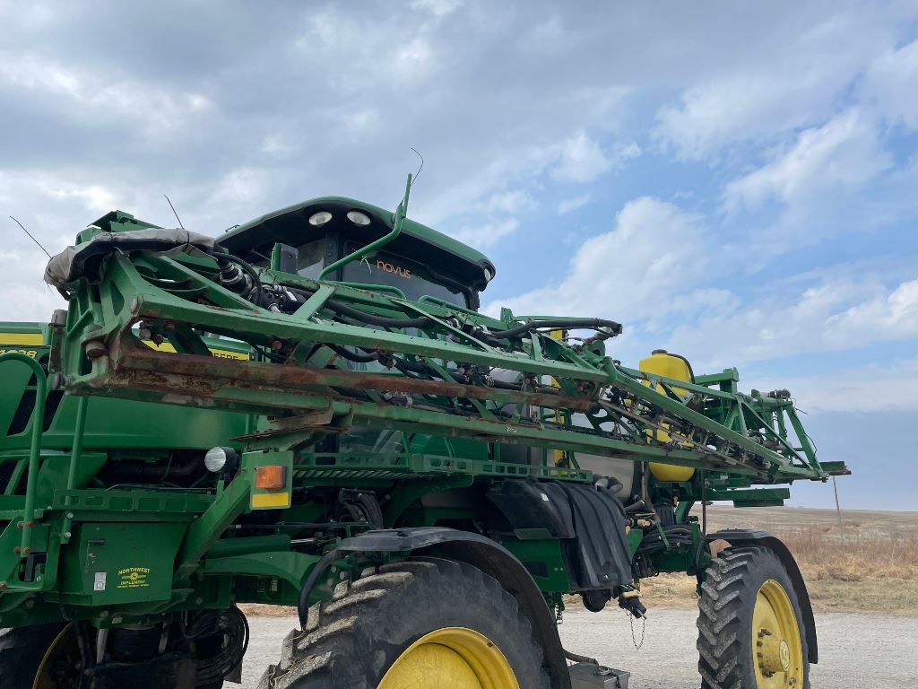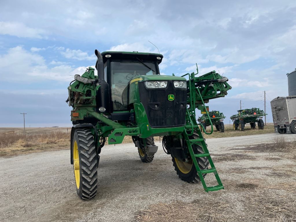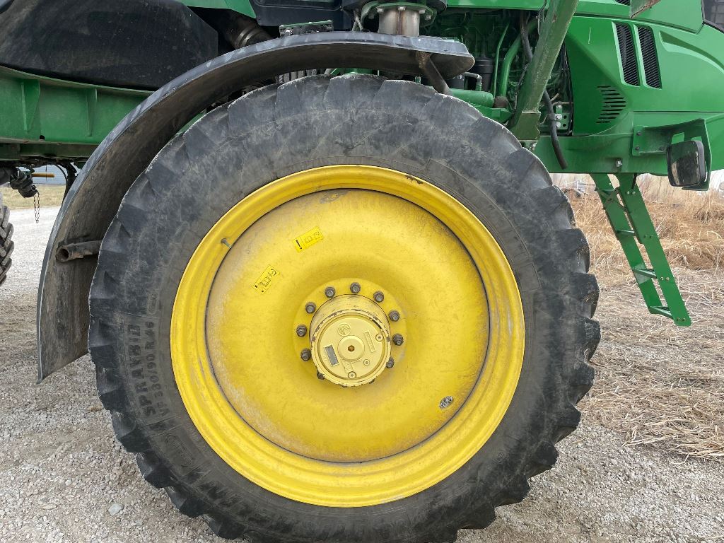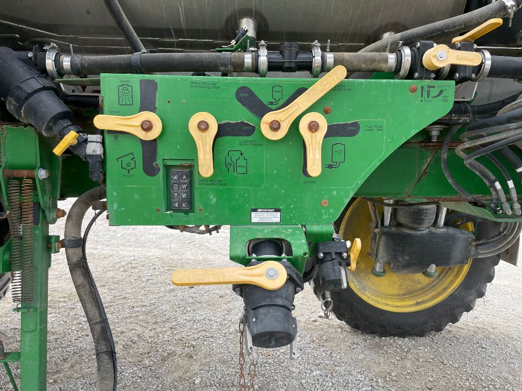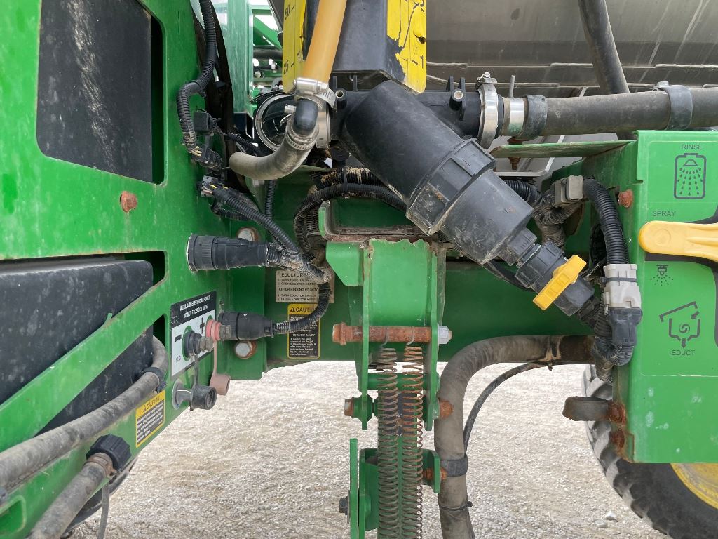 2015 John Deere R4038 Sprayer (GP2377), John Deere diesel engine (S/N RG6090U012331, hydrostatic transmission, air conditioning, heat, Am/Fm radio, 1000 gallon stainless steel liquid system, 100' boom, rear poly fresh water tank, stainless steel chemical inductor, 4 - Direct poly injection tanks, 2 - Raven Sidekick Pro pumps, Michelin Spraybib VF 380/90R46 tires, fenders, John Deere monitor, shows 3,279 hours.